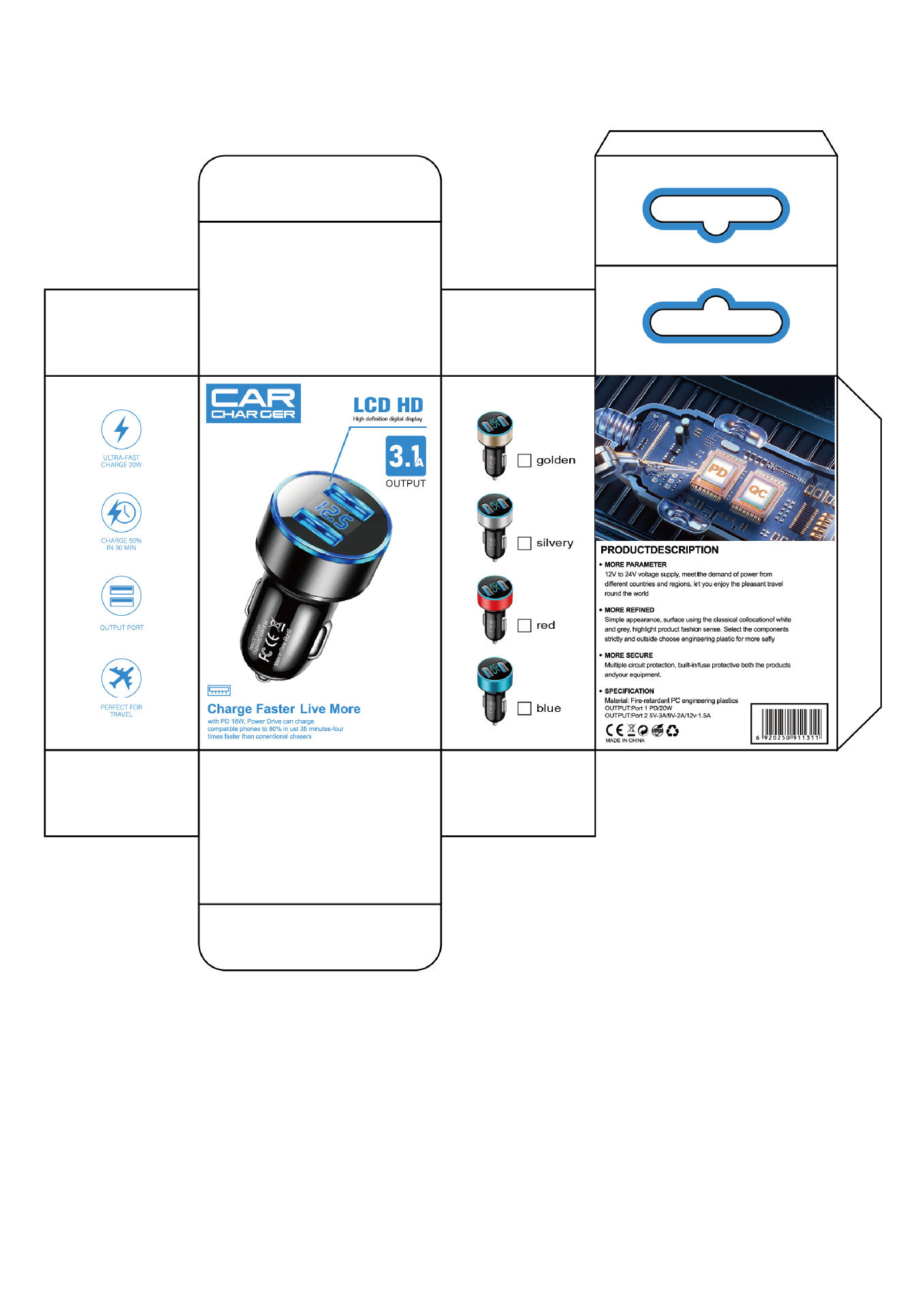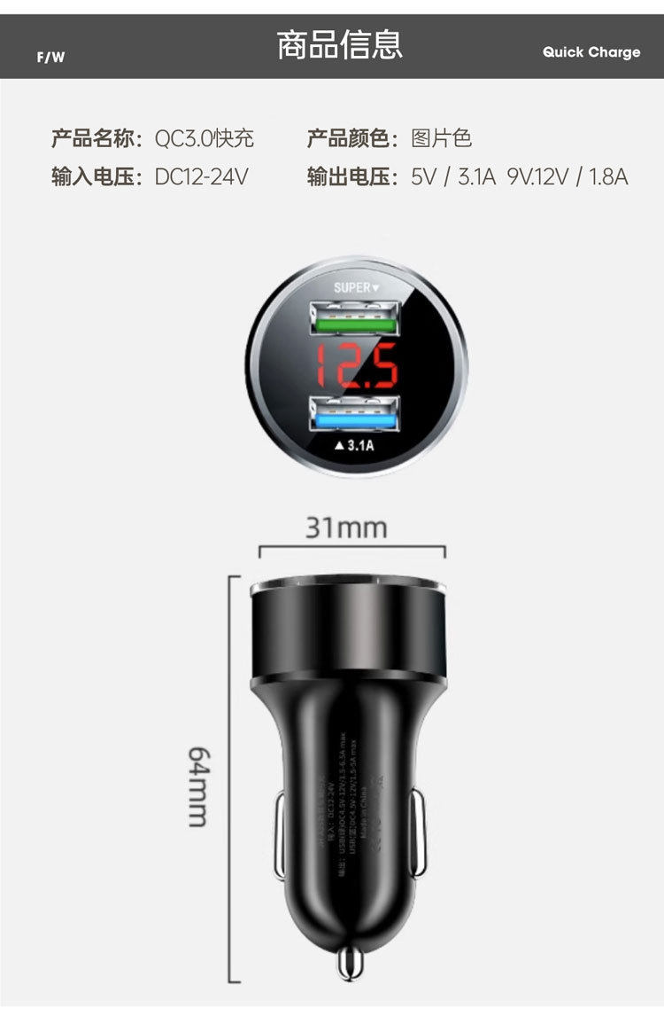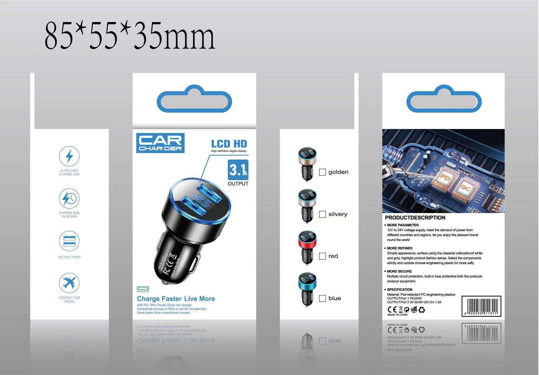 | Color | 12.5 fixed digital display car charger 3.1A (opp bag) Black,12.5 fixed digital display car charger 3.1A (opp bag) gold,12.5 fixed digital display car charger 3.1A (opp bag) Blue,12.5 fixed digital display car charger 3.1A (opp bag) red,12.5 fixed digital display car charger 3.1A (opp bag) Silver,Voltage detection digital display 3.1A (opp bag) Black,Voltage detection digital display 3.1A (opp bag) Silver,Voltage detection digital display 3.1A (opp bag) gold,Voltage detection digital display 3.1A (opp bag) Blue,Voltage detection digital display 3.1A (opp bag) red,22w full protocol digital display super fast charging (opp bag) black,12.5 fixed digital display car charger-color box-note color,Voltage detection digital display 3.1a - color box packaging - please specify color,22w full protocol digital display super fast charging (opp bag) color box packaging |