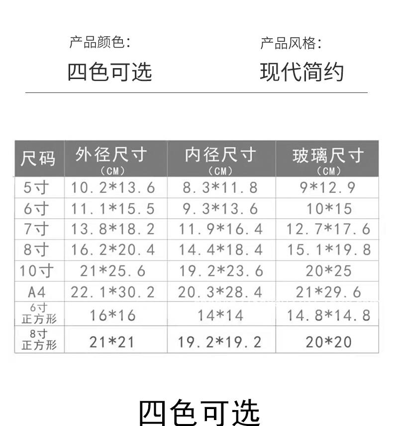 | Frame size | 5inch (9x13)cm,6 inches (10 x15)cm,7inch (13x18)cm,8inch (15x20)cm,10inch (20x25)cm,a4(21x29.7)cm,Square 6-inch (15 x15)cm,Square 7-inch (18 x18)cm,Square 8-inch (20x 20)cm |
