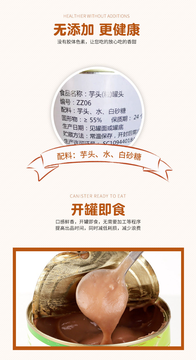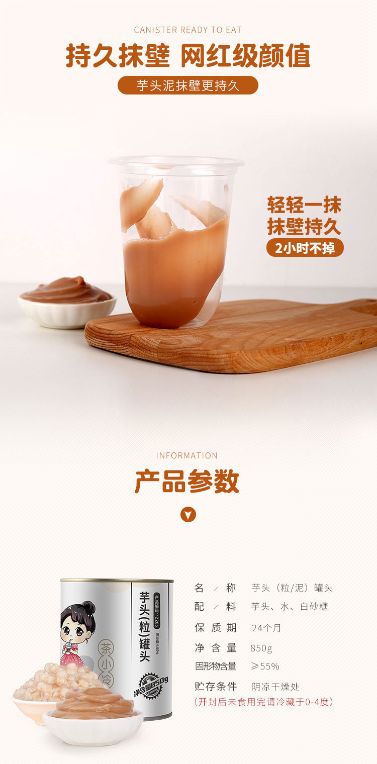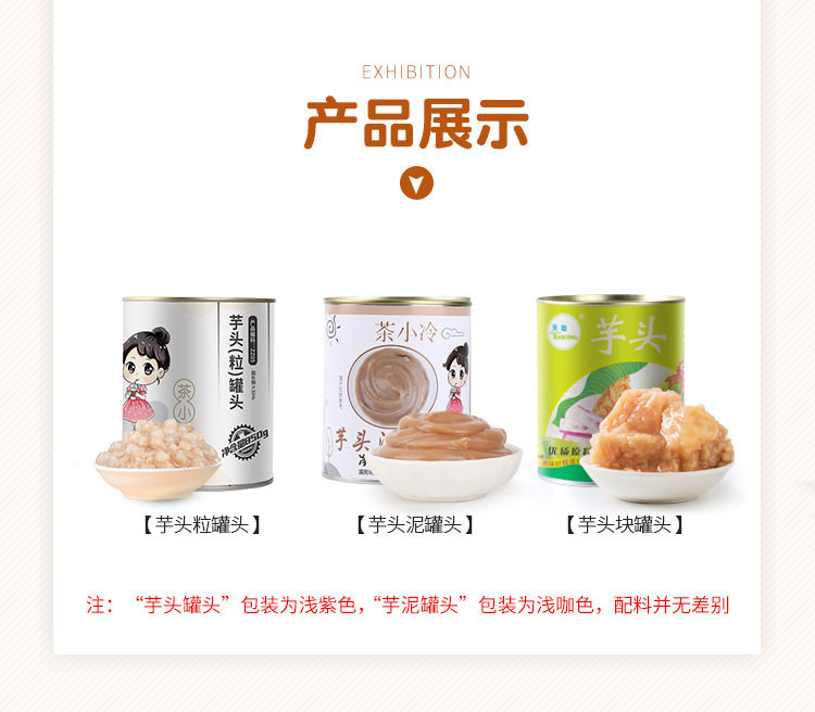 | Packing specification | Tea small cold-taro (mud) canned 850g,Tea small cold-taro (grain) canned 850g,Tea small cold-canned oats 850g,Tea Cold-Canned Purple Rice 850g,Tea Cold-Canned Red Beans 900g,Tea small cold-canned chestnut (mud) 850g,Tea small cold-purple sweet potato (block) canned 850g,Tea Cold-Canned Highland Barley (Blasting Kueh) 850g,Tea Cold-Canned Oats (Pasted Kueh) 850g |