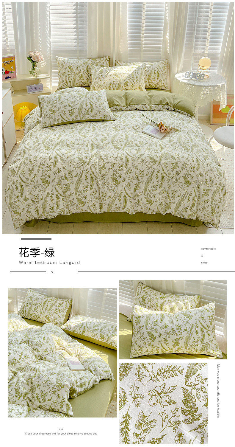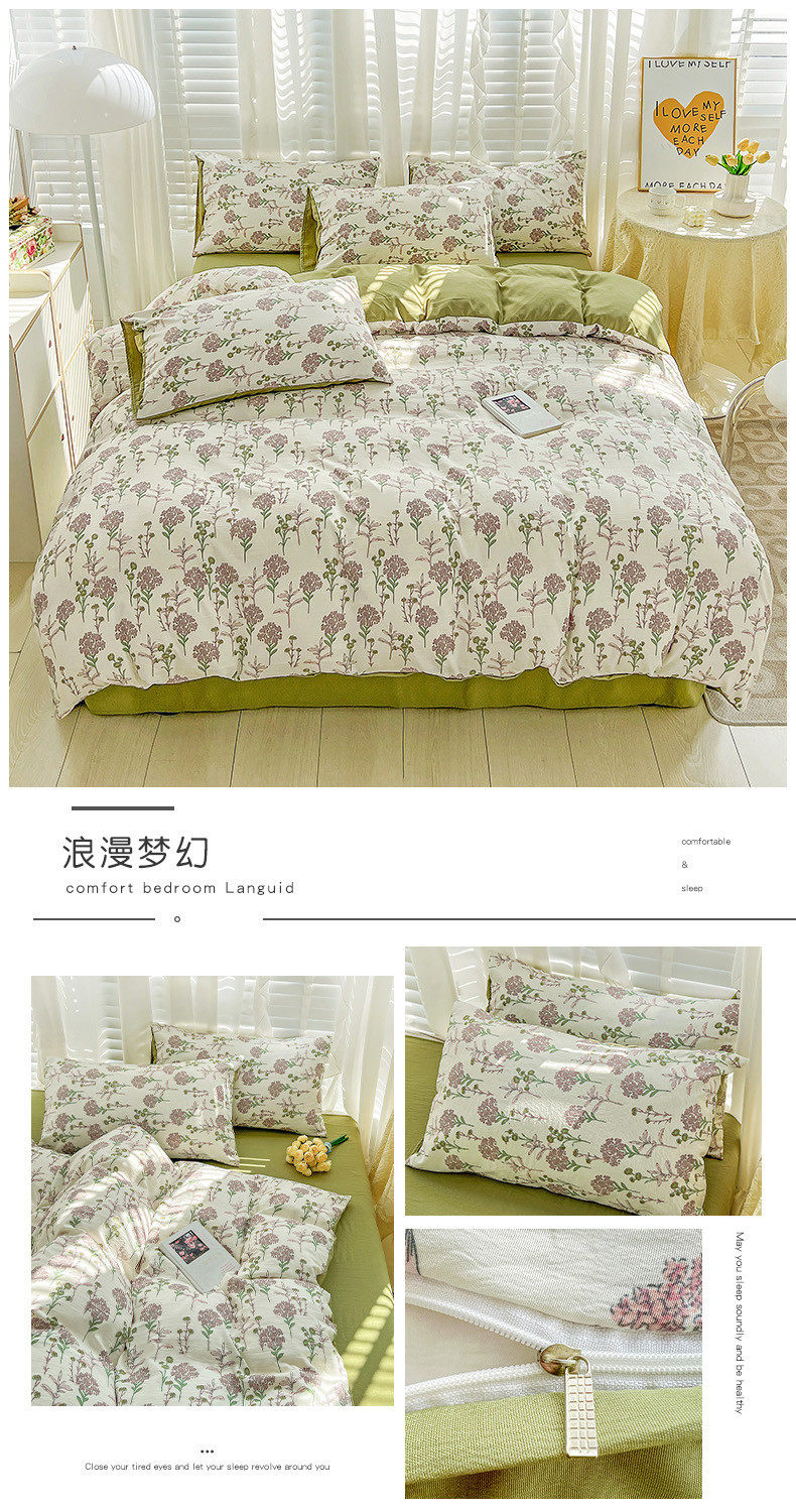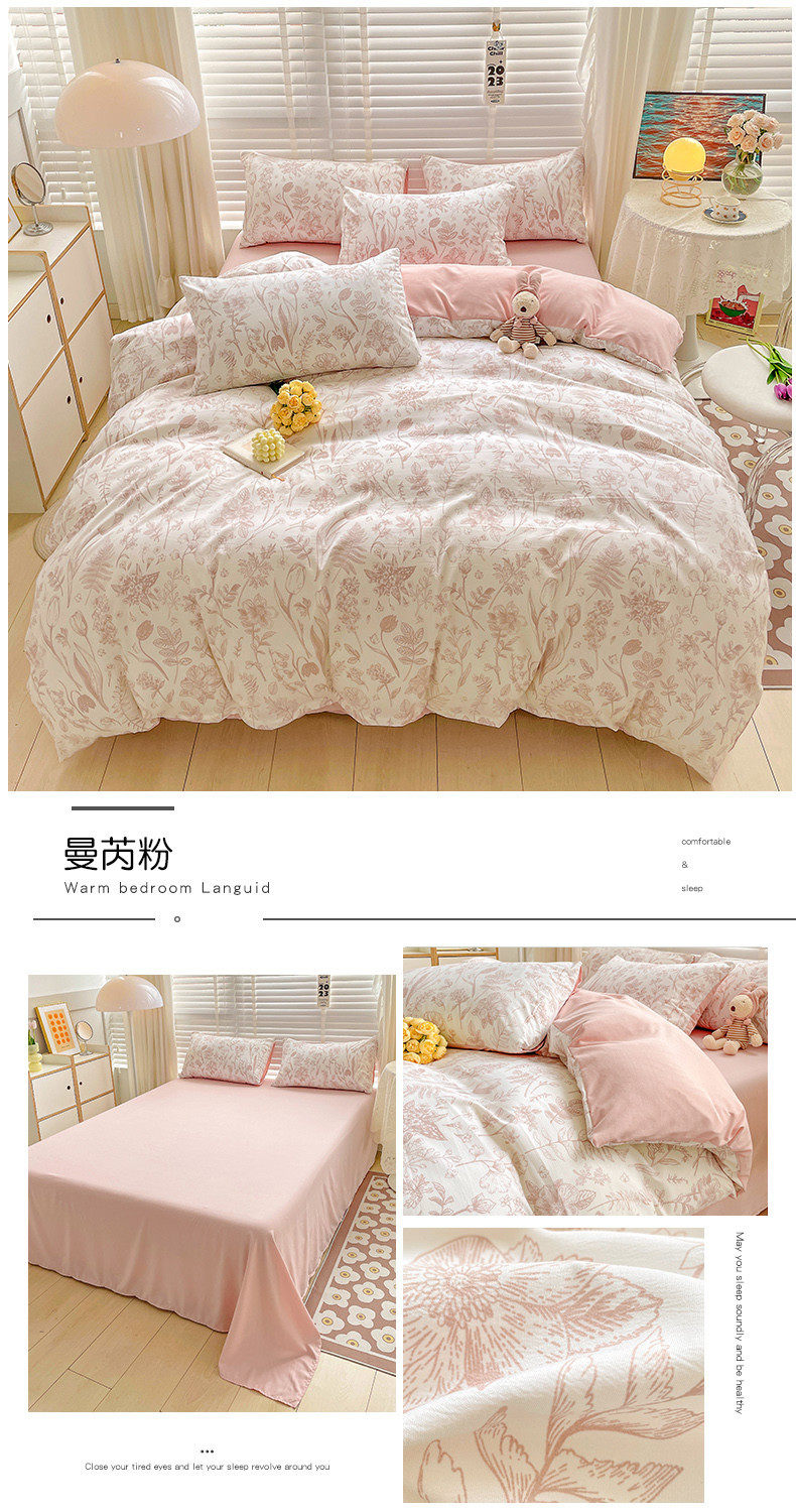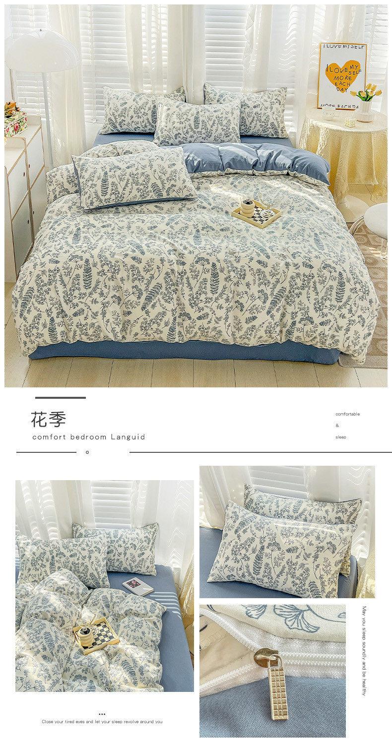 | Size specifications | 1.2m bed sheet three-piece set (quilt cover 150*200),1.5m bed sheet four-piece set (quilt cover 150*200),1.8m bed sheet four-piece set (quilt cover 180*220),2.0m bed sheet four-piece set (quilt cover 200*230),2.2m bed sheet four-piece set (quilt cover 220*240),1.5m fitted sheet set of four (quilt cover 200*230),1.8m fitted sheet set of four (quilt cover 200*230) |