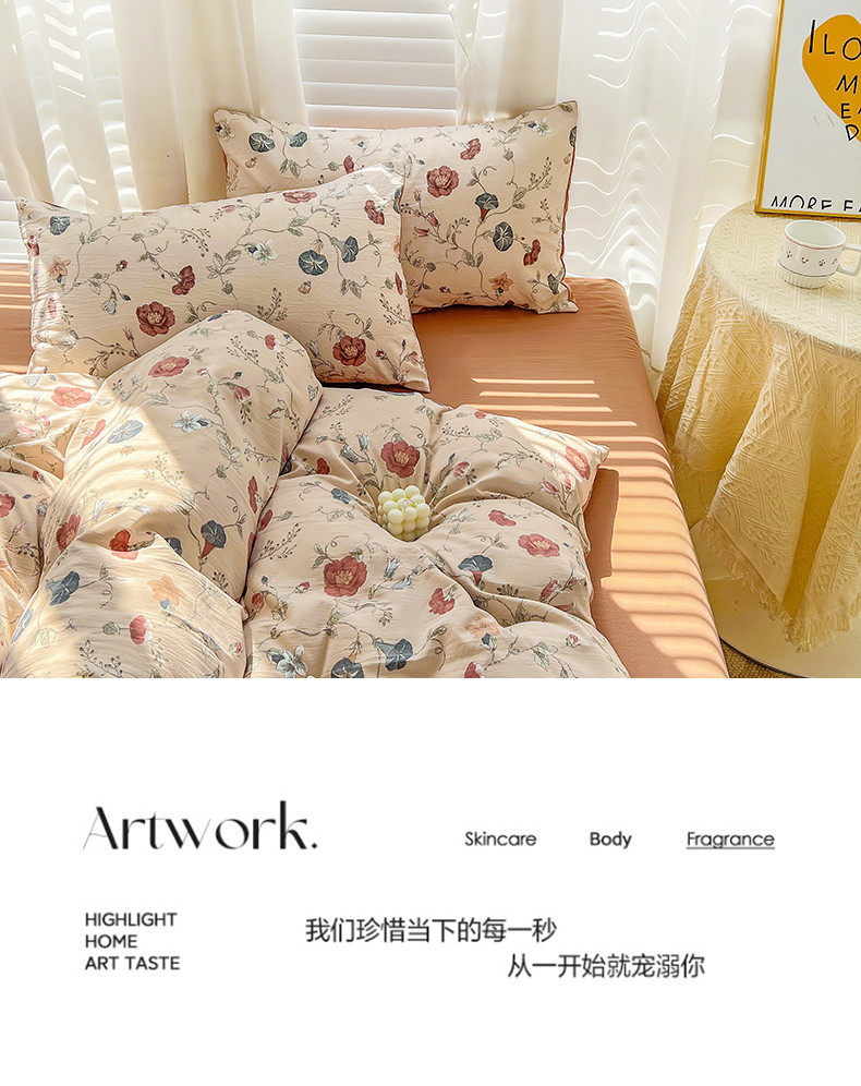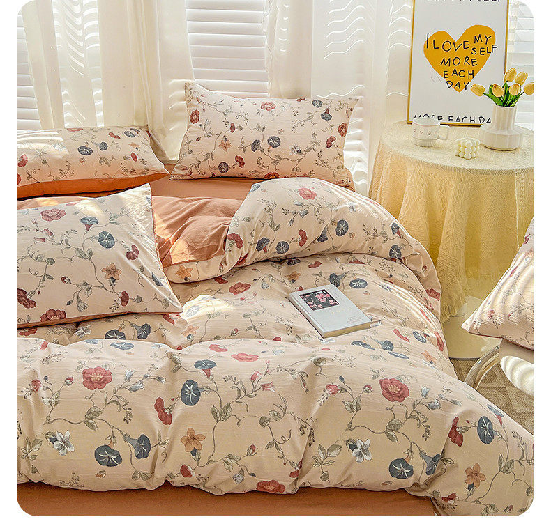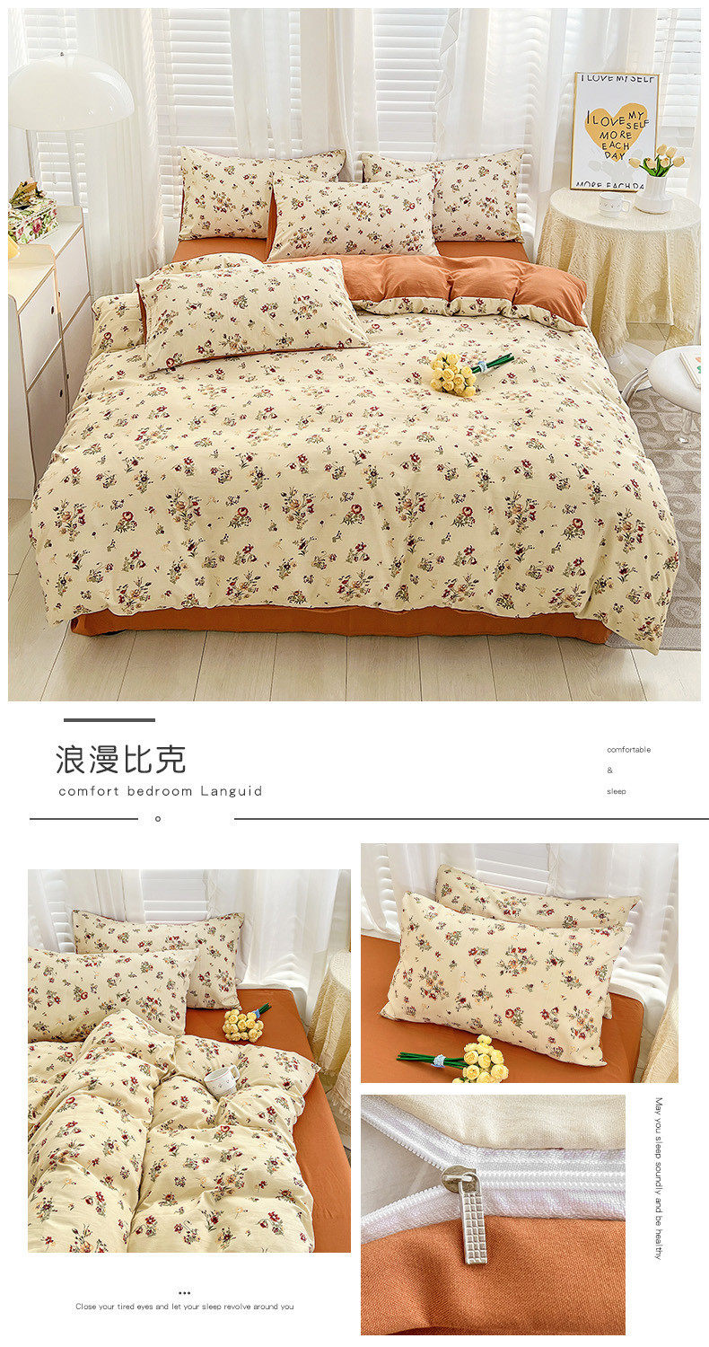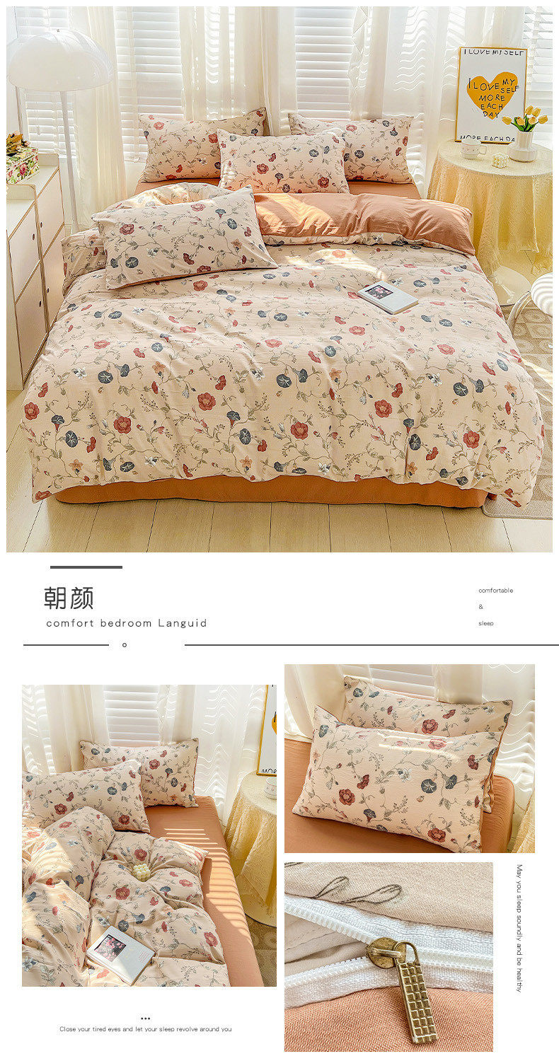 | Size specifications | 1.2m bed sheet three-piece set (quilt cover 150*200),1.5m bed sheet four-piece set (quilt cover 150*200),1.8m bed sheet four-piece set (quilt cover 180*220),2.0m bed sheet four-piece set (quilt cover 200*230),2.2m bed sheet four-piece set (quilt cover 220*240),1.5m fitted sheet set of four (quilt cover 200*230),1.8m fitted sheet set of four (quilt cover 200*230) |