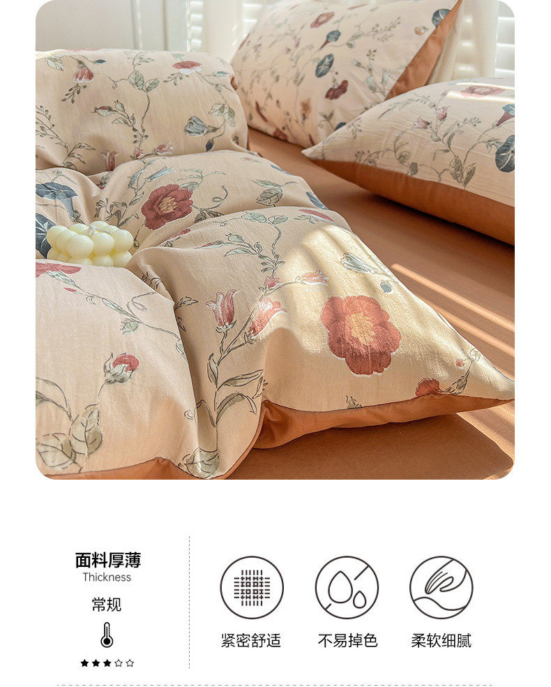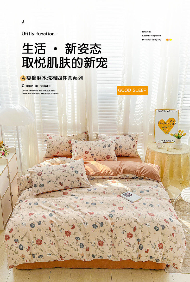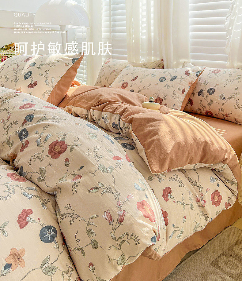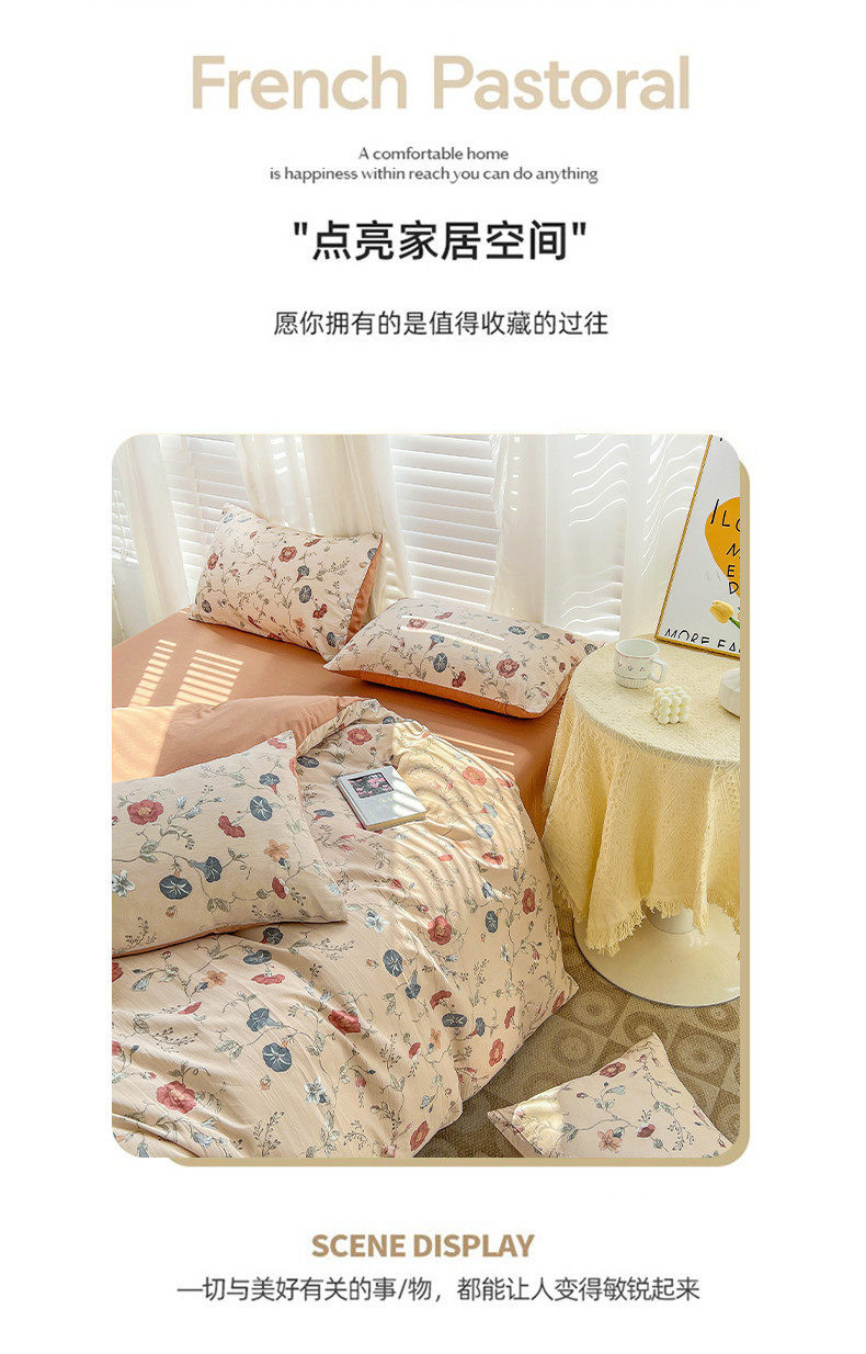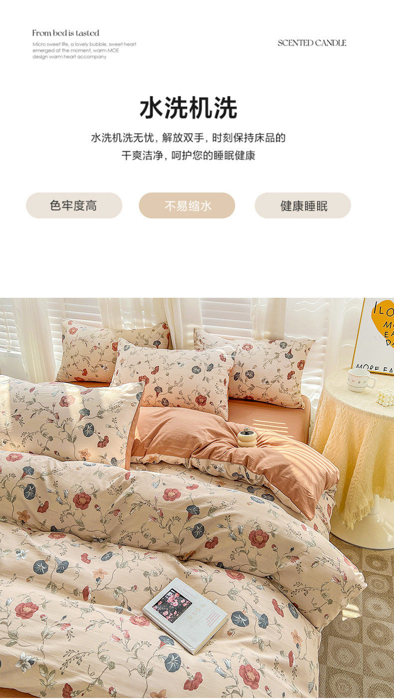 | Size specifications | 1.2m bed sheet three-piece set (quilt cover 150*200),1.5m bed sheet four-piece set (quilt cover 150*200),1.8m bed sheet four-piece set (quilt cover 180*220),2.0m bed sheet four-piece set (quilt cover 200*230),2.2m bed sheet four-piece set (quilt cover 220*240),1.5m fitted sheet set of four (quilt cover 200*230),1.8m fitted sheet set of four (quilt cover 200*230) |