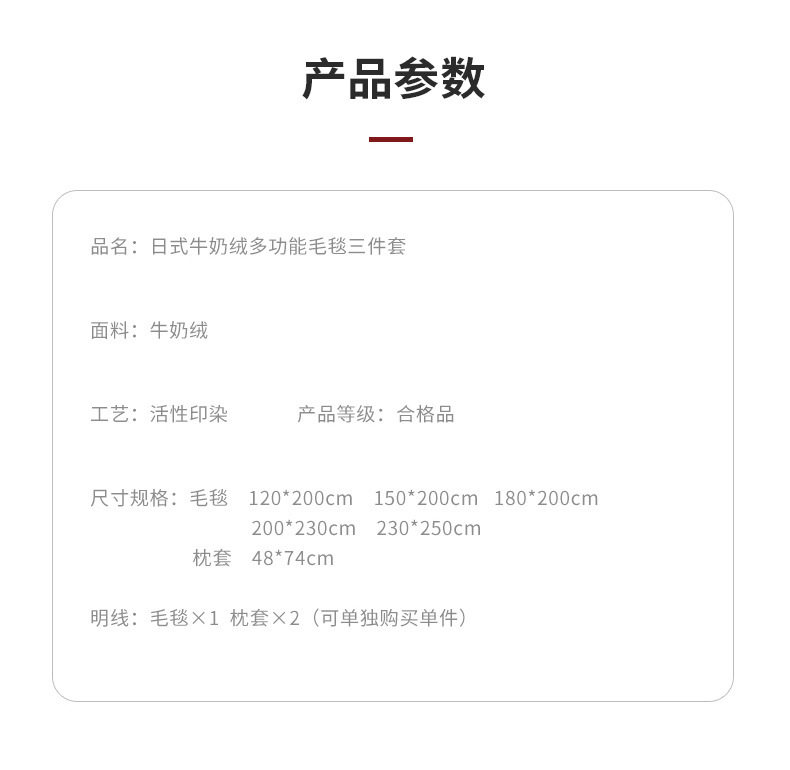 | Size specification | 120x200cm blanket [cover dual-use about 1.8]],150x200cm extra large blanket [cover dual-use about 2.2]],180x200cm double blanket [cover dual-use about 2.6]],200x230cm extra large double blanket [cover dual-use about 3.2]],230x250cm extra large double blanket [cover dual-use about 3.6]],Blanket three-piece set-[150x200cm blanket + pillowcase pair]],Blanket three-piece set-[180x200cm blanket + pillowcase pair]],Blanket three-piece set-[200x230cm blanket + pillowcase pair]] |