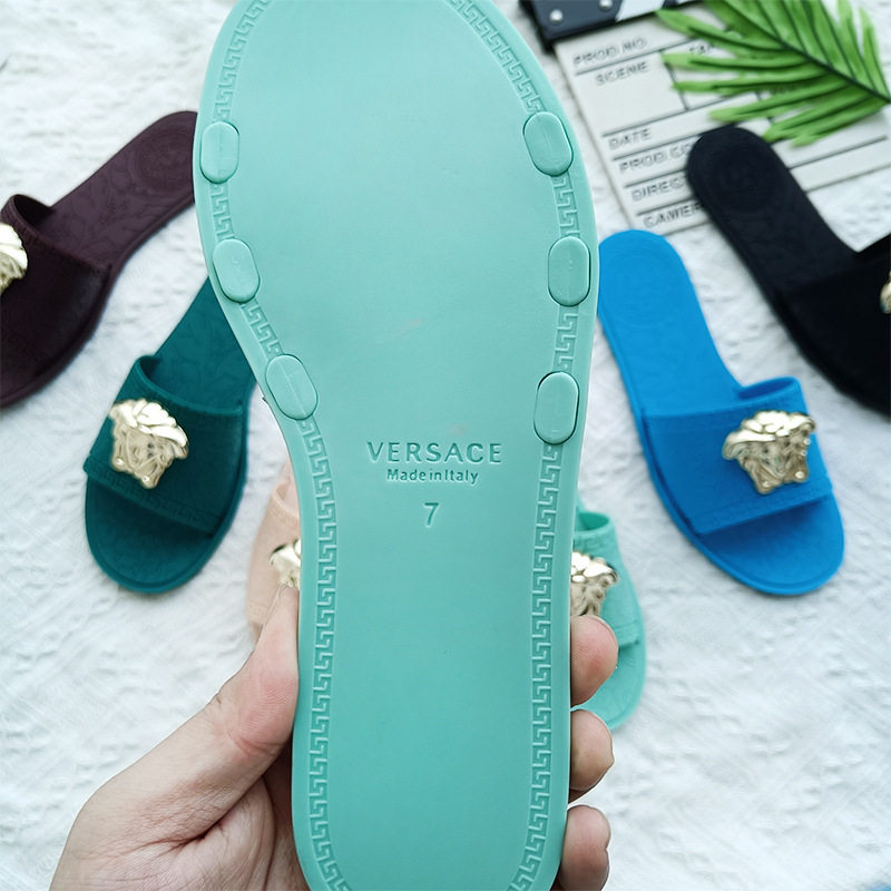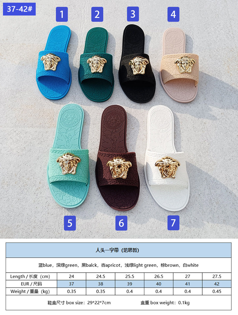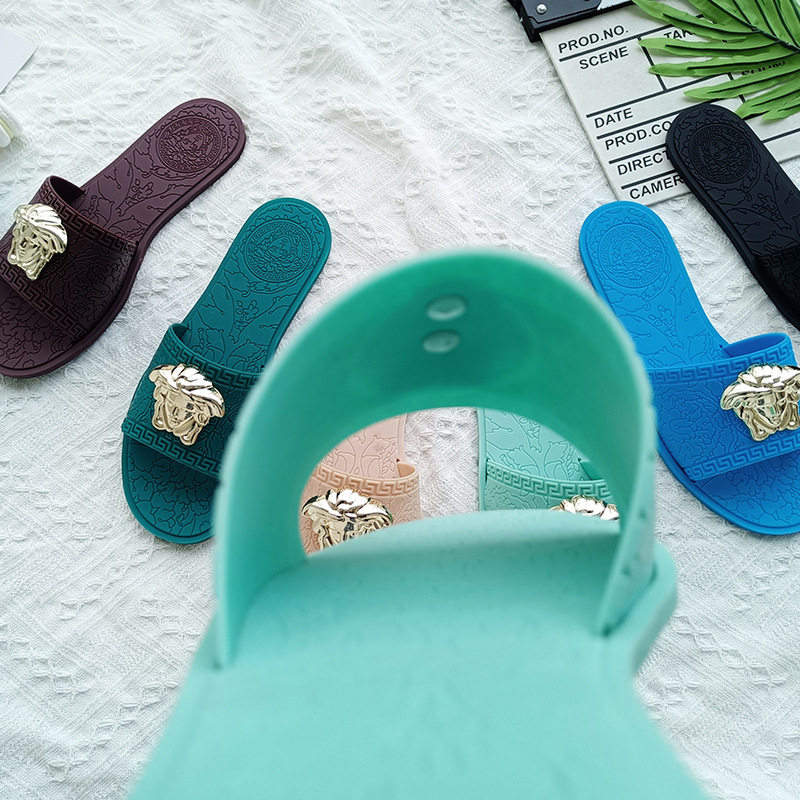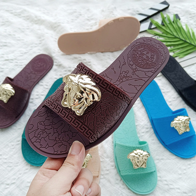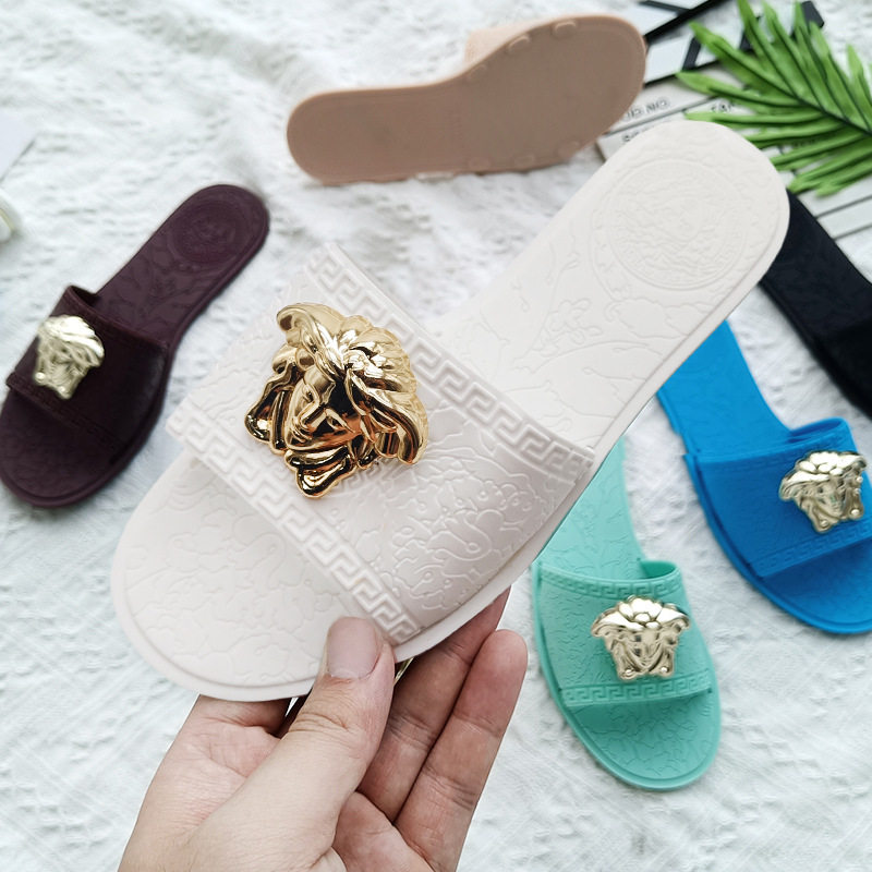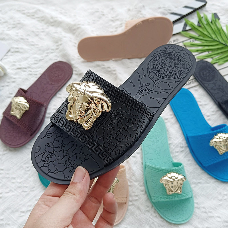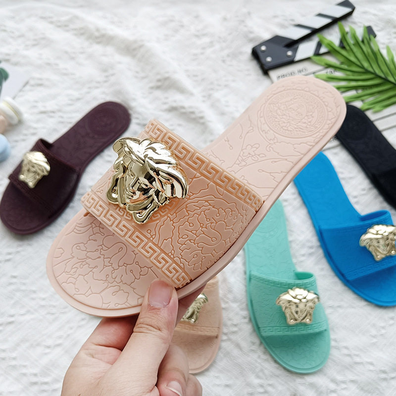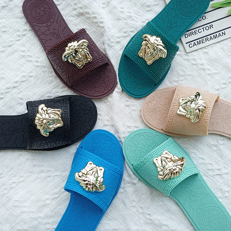 Flat slippers for women ins popular 2023 Summer new European and American fashion slipper outer wear metal beauty head printing