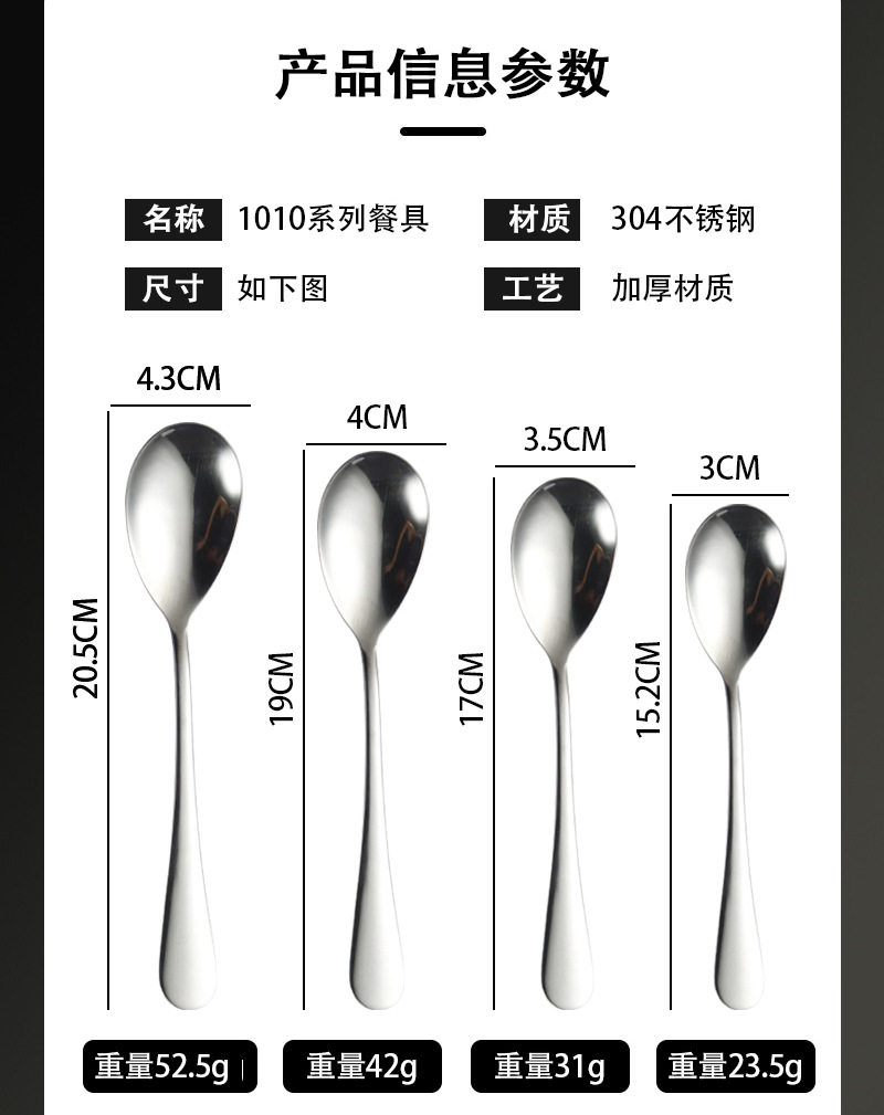 | Product name 1 | 304 stainless steel spoon 1010 series western food tableware hotel restaurant commercial boutique 304 stainless steel spoon |