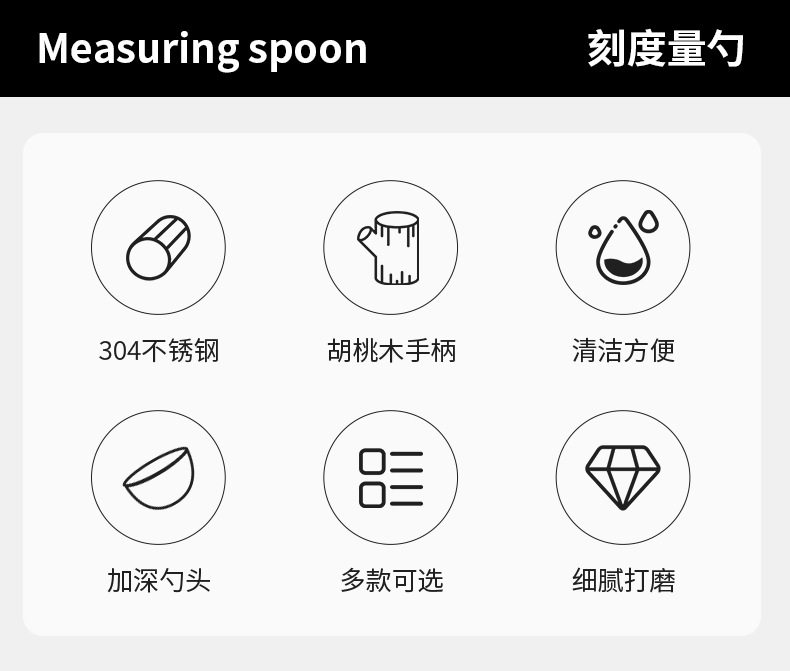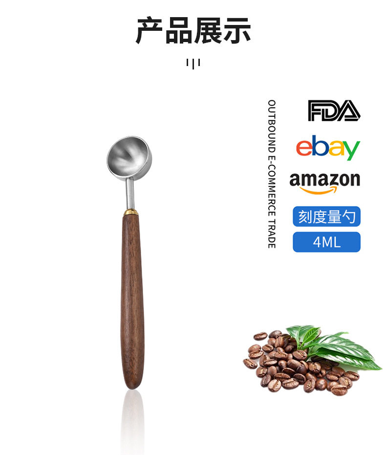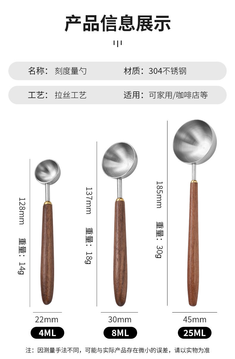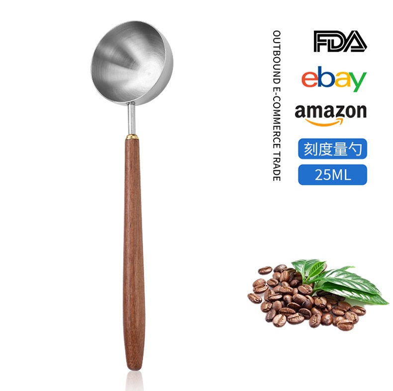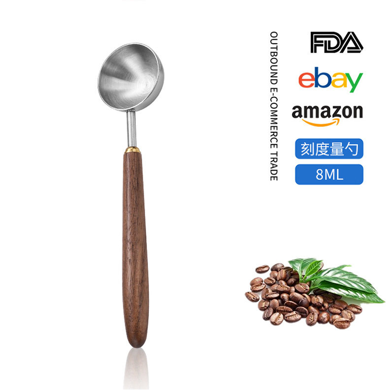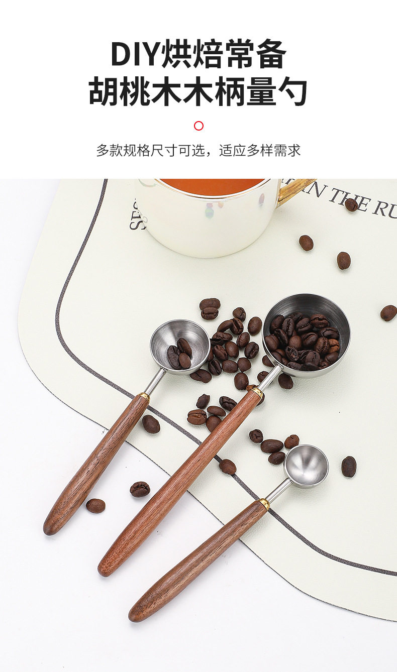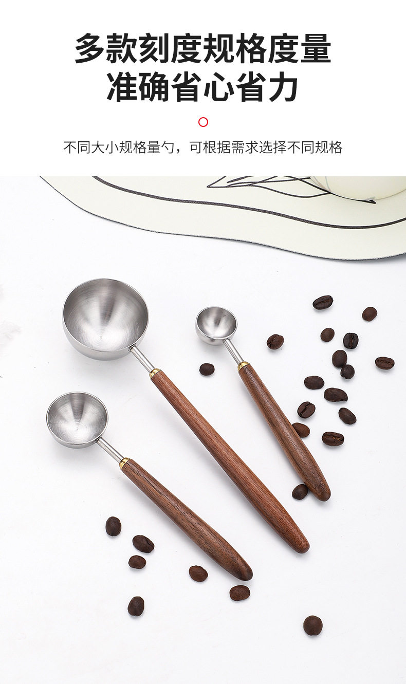 Cross-border 304 stainless steel coffee bean measuring spoon walnut wooden handle food scale spoon fruit powder milk tea powder seasoning spoon