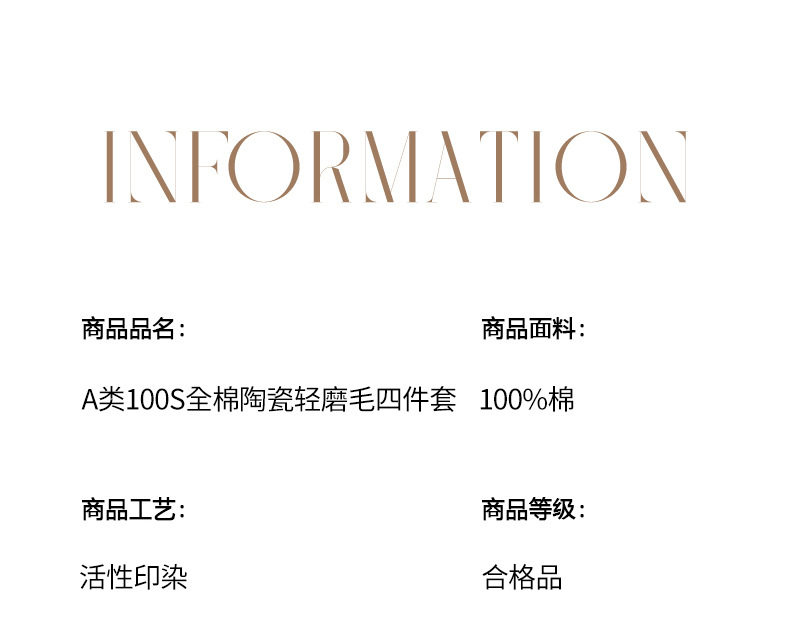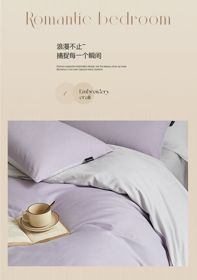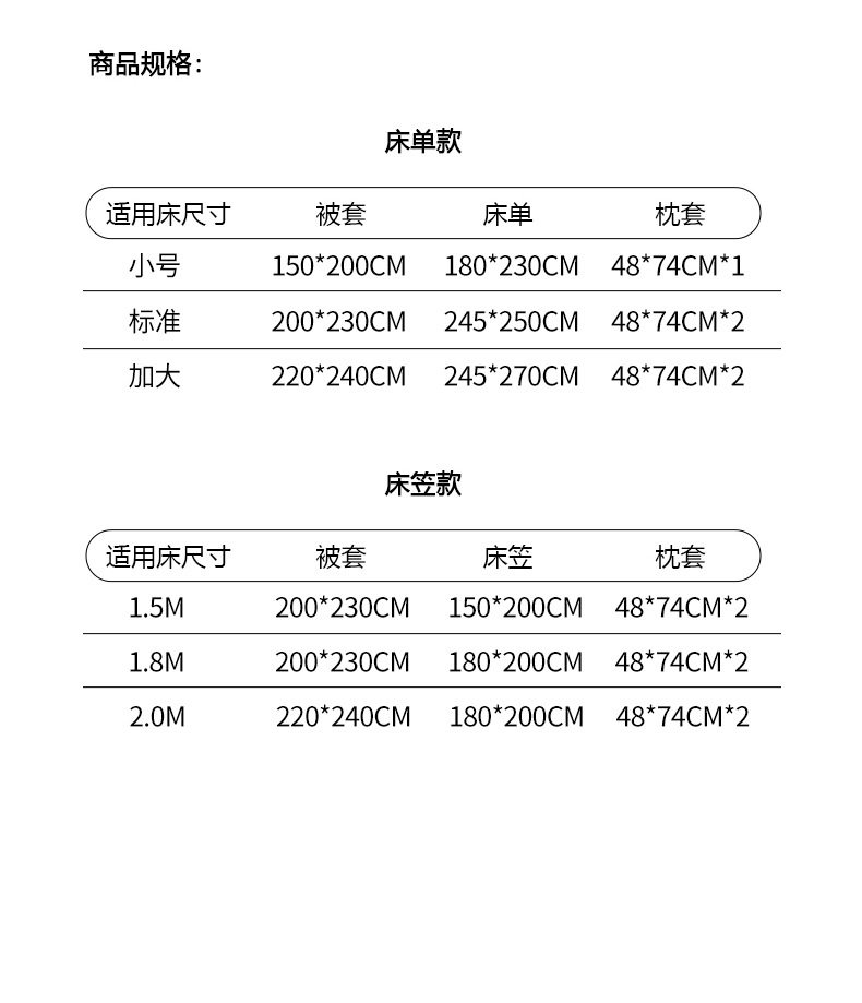 | Size specification | 1.2m bed sheet three-piece set (quilt cover 150 * 200cm),1.5m bed sheet four-piece set (quilt cover 200 * 230cm),1.8m bed sheet four-piece set (quilt cover 200 * 230cm),2.0m bed sheet four-piece set (quilt cover 220 * 240cmcm),1.5m fitted sheet four-piece set (quilt cover 200 * 230cm fitted sheet 150 * 200cm),1.8m fitted sheet four-piece set (quilt cover 200 * 230cm fitted sheet 180 * 200cm) |
