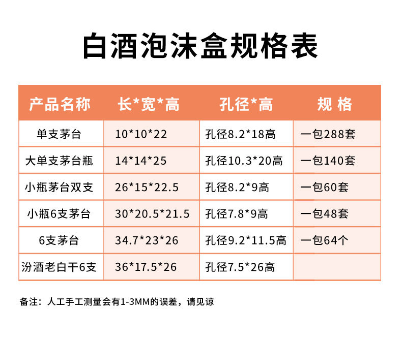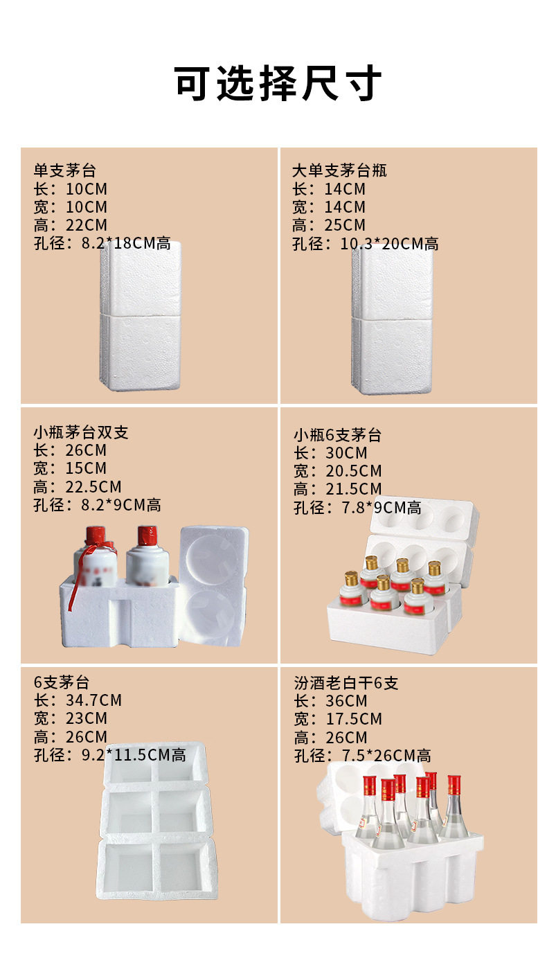 | Specification model | Specification: single Maotai (10*10*22); Material: PS foam,Specification: large single Maotai bottle (14*14*25); Material: PS foam plastic,Specification: small bottle Maotai double (26*15*22.5); Material: PS foam plastic,Specification: 6 small bottles of Maotai (30*20.5*21.5); Material: PS foam plastic,Specification: Small Square 6 Maotai (34.7*23*26); Material: PS foam plastic,Specification: Fenjiu dried white (36*17.5*28.5); Material: PS foam plastic,Specification: others; Material: PS foam |
