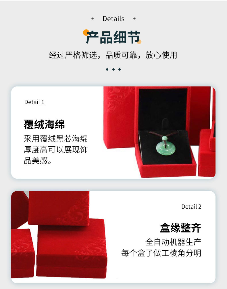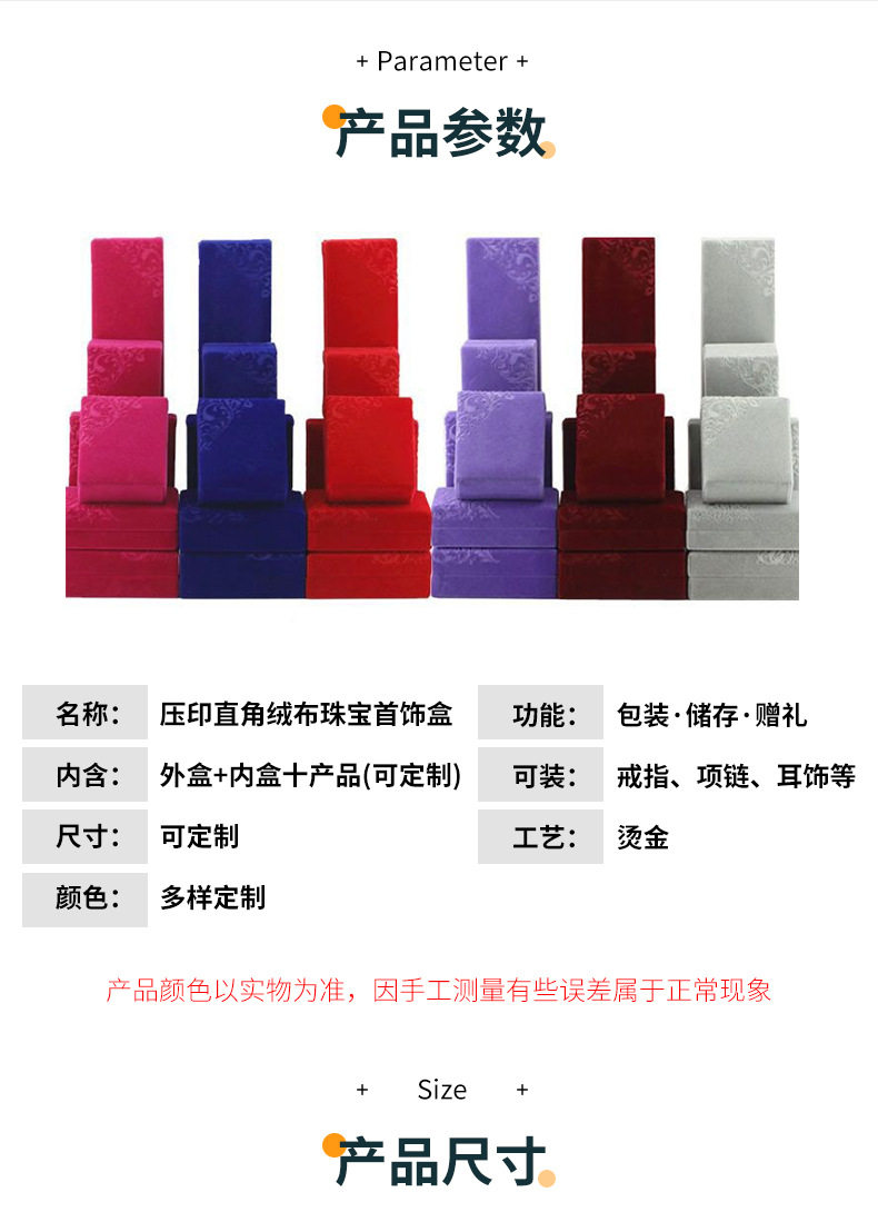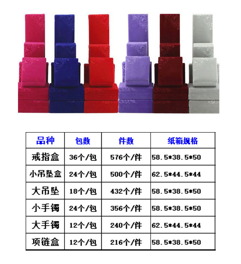| Specification model | Right velvet printed royal blue ring box 6*6; no. 1,Right velvet printed royal blue small pendant box 7*8; no. 1,Right velvet printed royal blue large pendant box 7*10; no. 1,Right velvet printed royal blue small bracelet box 9*9; no. 1,Right velvet printed royal blue large bracelet box 10*10; no. 1,Right velvet printed royal blue necklace box 6*24.5; no. 1,Right velvet printed big red ring box 6*6; no. 1,Right velvet printed big red small pendant box 7*8; no. 1,Right velvet printed big red pendant box 7*10; no. 1,Right velvet printed big red small bracelet box 9*9; no. 1,Right velvet printed big red bracelet box 10*10; no. 1,Right velvet printed big red necklace box 6*24.5; no. 1,Right velvet printed gray ring box 6*6; no. 1,Right velvet printed gray small pendant box 7*8; no. 1,Right velvet printed gray large pendant box 7*10; no. 1,Right velvet printed gray small bracelet box 9*9; no. 1,Right velvet printed gray large bracelet box 10*10; no. 1,Right velvet printed gray necklace box 6*24.5; no. 1,Right velvet printed brown ring box 6*6; no. 1,Right velvet printed brown small pendant box 7*8; no. 1,Right velvet printed brown large pendant box 7*10; no. 1,Right velvet printed brown small bracelet box 9*9; no. 1,Right velvet printed brown large bracelet box 10*10; no. 1,Right velvet printed brown necklace box 6*24.5; no. 1,Right velvet printed rose red ring box 6*6; no. 1,Right velvet printed rose red small pendant box 7*8; no. 1,Right velvet printed rose red large pendant box 7*10; no. 1,Right velvet printed rose red small bracelet box 9*9; no. 1,Right velvet printed rose red large bracelet box 10*10; no. 1,Right velvet printed rose red necklace box 6*24.5; no. 1,Right velvet printed maroon ring box 6*6; no. 1,Right velvet printed maroon small pendant box 7*8; no. 1,Right velvet printed maroon large pendant box 7*10; no. 1,Right velvet printed maroon small bracelet box 9*9; no. 1,Right velvet printed maroon large bracelet box 10*10; no. 1,Right angle velvet printed maroon necklace box 6*24.5; no. 1,Right velvet printed purple ring box 6*6; no. 1,Right velvet printed purple small pendant box 7*8; no. 1,Right velvet printed purple large pendant box 7*10; no. 1,Right velvet printed purple small bracelet box 9*9; no. 1,Right velvet printed purple large bracelet box 10*10; no. 1,Right velvet printed purple necklace box 6*24.5; no. 1 |