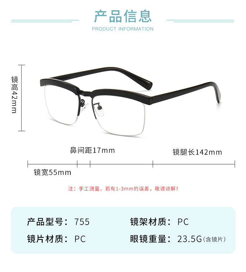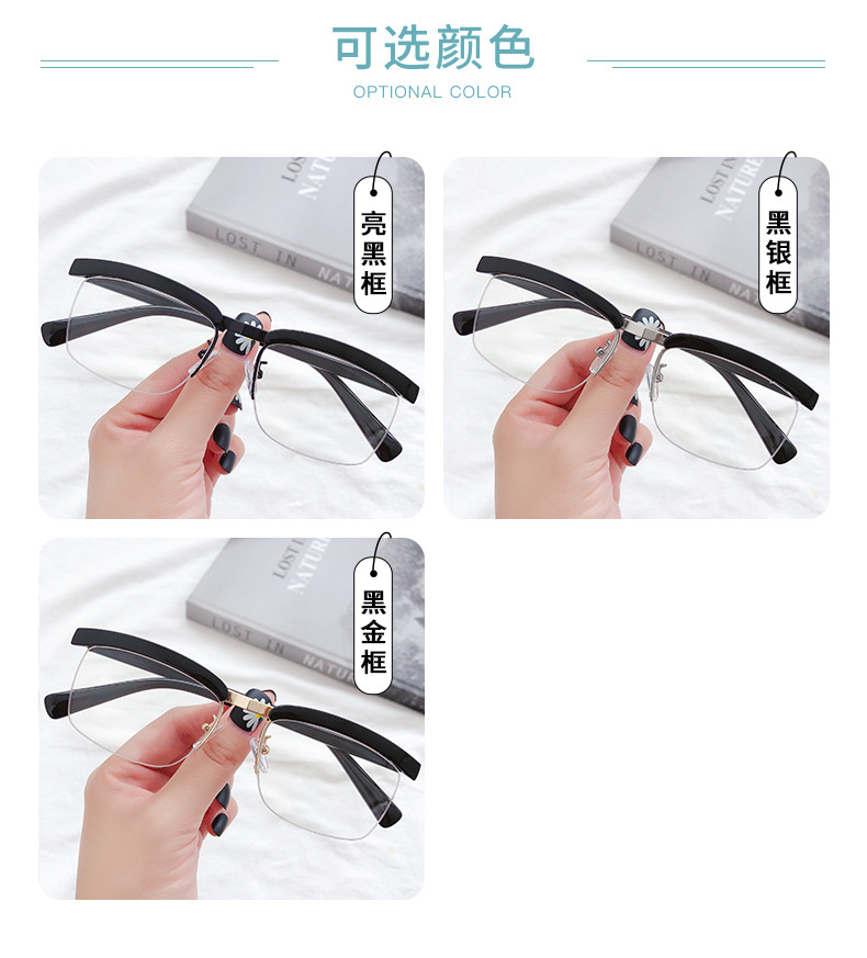 | Frame color | Bright black frame (anti-blue light),Black silver frame (anti-blue light),Black gold frame (anti-blue light),0 degree discoloration gray |