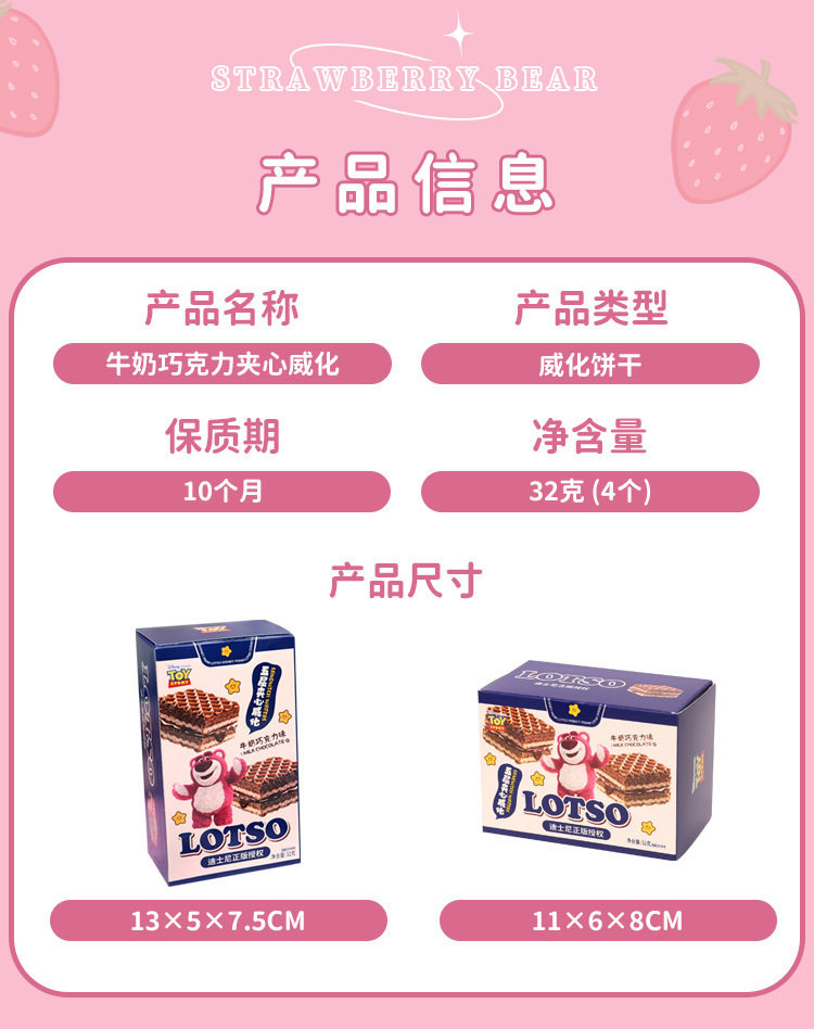 | Packaging specifications | Five-layer wafer cake [32g] [8*6*11cm],No. 7 five-layer sandwich wafer 32g box [7.3*5*12.8cm],Cookies 25g boxed [12.5*7.5*4.5cm],Cookies 55g boxed [12.5*12.5*4cm],Danish cookie flavored biscuits 55g box [12.5*12.5*4cm],No. 17 meat floss egg roll 30g [9*5.5*11cm],Strawberry bear chocolate bean cookies 40g boxed [11.5*5.5*9cm],Strawberry bear chocolate bean cookies 50g box [12*4*12.5cm],Cappuccino egg roll 30g [7.5*5*13cm],Cappuccino egg roll 40g [rectangular 9*14*4cm],Cappuccino egg roll 40g [square 12.5*12.5*3.7cm],Chocolate flavored cake 40g box [11*8*5.5cm],Nut thousand layer crispy 32g box [12.5*12.5*4cm],No. 94 macaron strawberry flavored biscuits 50g [12.5*12.5*4.5cm],Milk flavored finger biscuits 30g box [16*9*3.5cm],Cranberry nougat 50g (small gift bag) [9*7*7cm],Cranberry nougat-68g box [18*4*9],Cranberry nougat 35g box [11*5*8cm],50g boxed nut milk crisp [9*4*14cm],[rainbow diary] large bentaxue egg tart crispy 5g*5 pack box,[rainbow diary] honey dried meat 26g box,[rainbow diary] wedding cream flavor sandwich cookies 50g box,[rainbow diary] hokkaido cream sandwich cookies 50g,[rainbow diary] baby birthday noodles 25g box (boy boy),[rainbow diary] baby birthday noodles 25g box (baby girl),Sesame egg roll 30g [9*5.5*11cm],Chocolate flavored cake 40g box [12.5*12.5*4cm],Disney macaron strawberry flavored biscuits 50g [12.5*12.5*4.5cm],7-layer wafer (hazelnut chocolate flavor) 46g hexagonal box [13.5*8*8cm],7-layer wafer (sea salt cheese flavor) 46g hexagonal box [13.5*8*8cm],7-layer wafer (strawberry cheese flavor) 46g hexagonal box [13.5*8*8cm],Chocolate popping bean cookies 42g (small hexagonal box) [13.5*8*8cm],Peanut flavored rice and fruit rolls 140g [18*15.5*3cm],Egg yolk flavored rice fruit roll 140g [18*15.5*3cm],Seaweed flavored rice fruit roll 140g [18*15.5*3cm],Vitality biscuits (strawberry cheese flavor) 42g stand bag,Vitality biscuits (hazelnut chocolate flavor) 42g stand bag,Vitality biscuits (sea salt cheese flavor) 42g stand bag,Milk flavored biscuits 45g standing bag [20*18*5cm],Sea salt flavored biscuits 45g vertical bag [20*18*5cm],[rainbow diary] raw coconut crispy egg roll 40g box,Disney egg yolk crisp 45g (gift bag),Disney happy chocolate flavored cake 40g small gift bag,Strawberry bear double flavor lollipop 25g (9*4*14cm) |