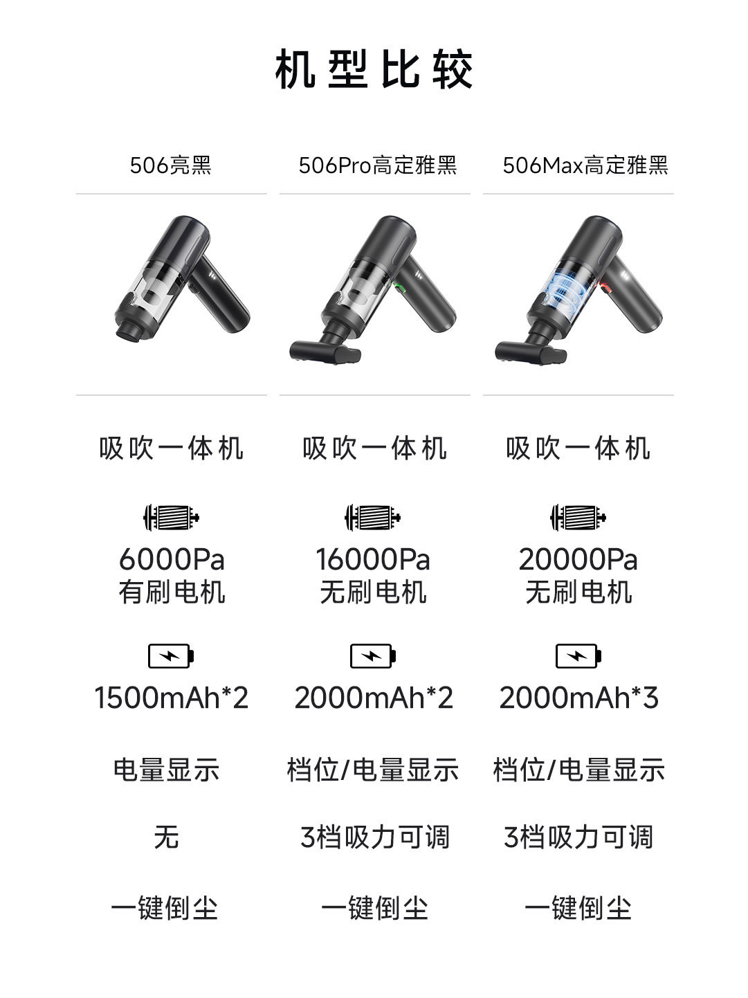 | Color classification | Silver purple [brushless 20000pa three-speed] x6max smart display screen blowing and suction all-in-one machine,X6max+hepa filter element*3+aviation bag,Silver purple [brushless 16000pa three-speed] x6pro smart display screen blower-vacuum combo,X6pro+hepa filter element*3+aviation bag,White [brushless 20000pa three-speed] x1max dual plastic shell blower/suction combo vacuum cleaner,X1max+hepa filter element*3,High-end elegant black [brushless 20000pa three-speed suction] 506max dual blast wind suction all-in-one machine,506max+hepa filter element*3+aviation bag,High-end elegant black [brushless 16000pa three-speed strong suction] 506pro storm blowing and suction all-in-one machine,506pro+hepa filter element*3+aviation bag,Bright black [brushed 6000pa suction power] 506 blowing and suction all-in-one machine,506+hepa filter element*3+aviation bag,Black [brushless motor suction upgrade - blowing, suction and pumping all-in-one machine + wide mouth suction nozzle],White [brushless motor suction upgrade - blowing, suction and pumping all-in-one machine + wide mouth suction nozzle],Gray [brushless motor suction upgrade - blowing, suction and pumping all-in-one machine + wide mouth suction nozzle],Black [brushed motor-blowing, suction and pumping all-in-one machine],White [brushed motor-blowing, suction and pumping all-in-one machine],Gray [brushed motor-blowing, suction and pumping all-in-one machine],Olive green [brushed 8000pa] a8pro vacuum cleaner,Sapphire blue [brushed 8000pa] a8pro vacuum cleaner,Black [brushed 8000pa] a8pro vacuum cleaner,White [brushed 8000pa] a8pro vacuum cleaner |