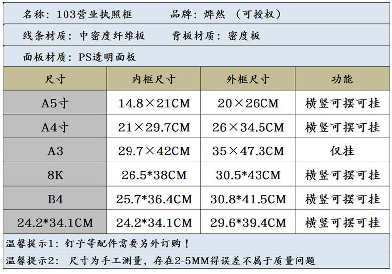 | Inner frame size | Log color-horizontal and vertical universal,mahogany-horizontal and vertical universal,Walnut color-horizontal and vertical universal |