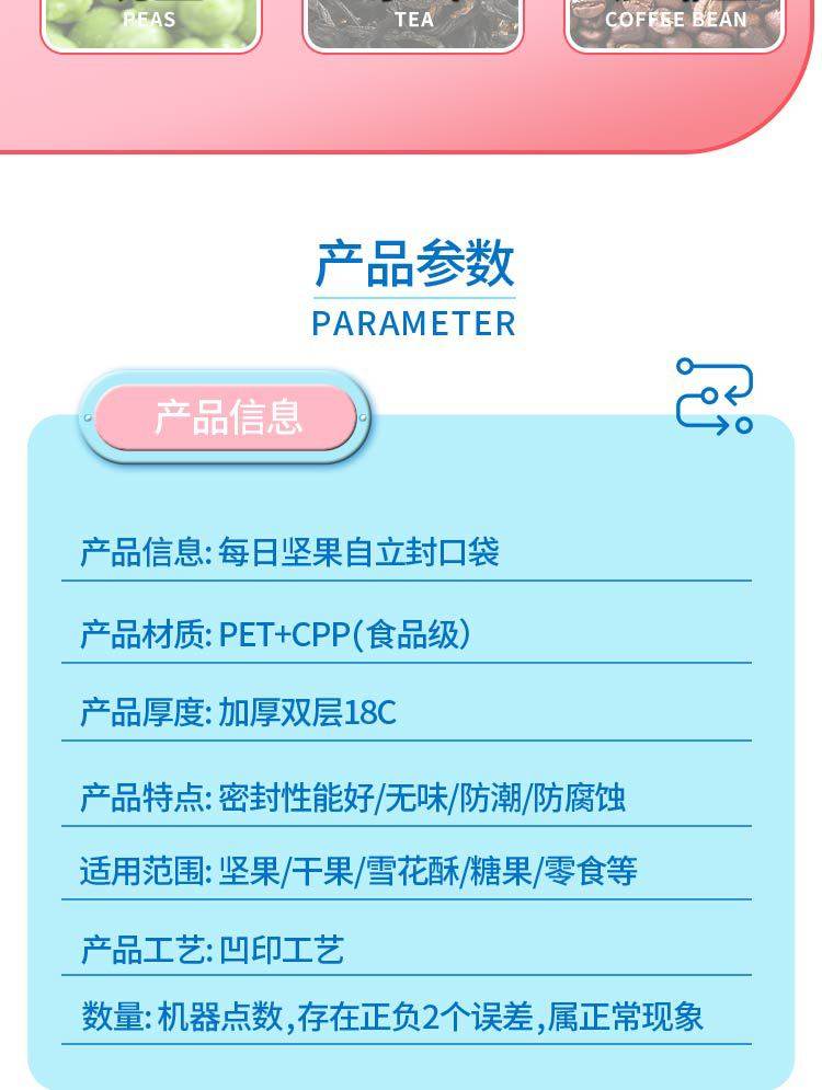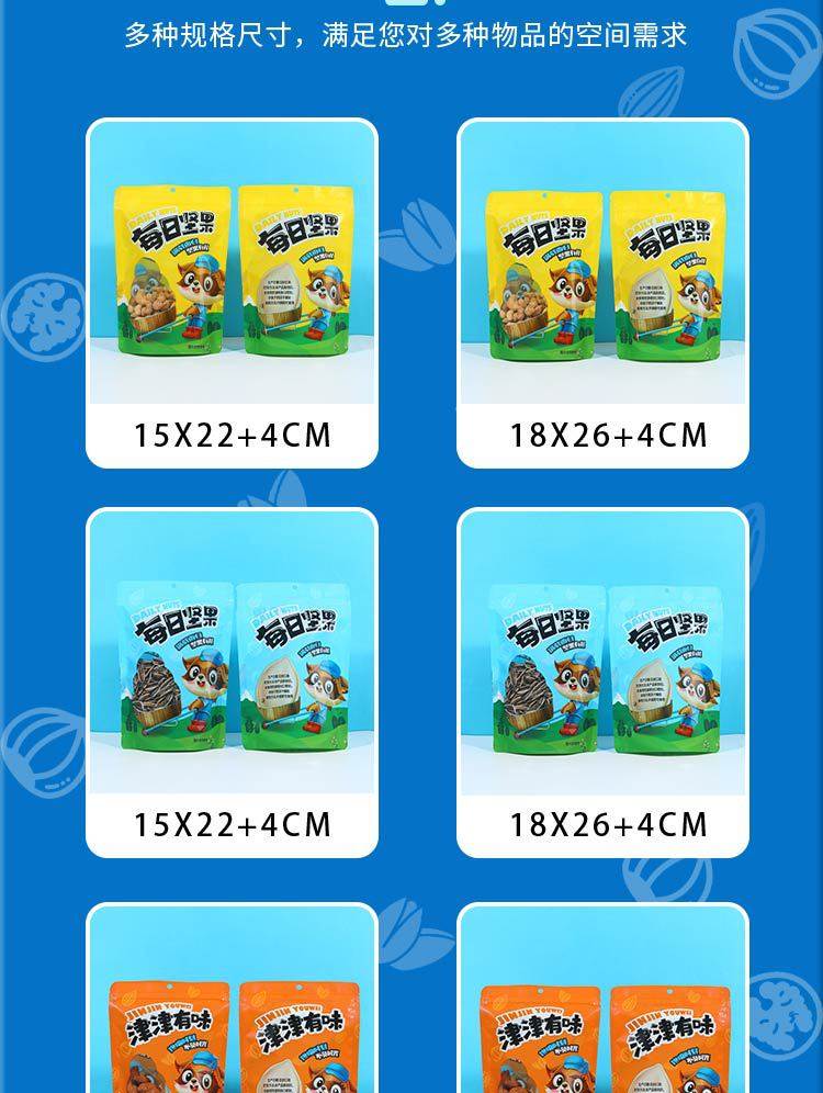 | Specification model | [50 PCs] Daily nuts (red) 15 * 22cm,[50] nuts (yellow) 15 * 22cm per day,[50] Daily nuts (blue) 15 * 22cm,[50] casual snacks 15 * 22cm,[50] enjoy 15 * 22cm,[50] nuts (red) 18 * 26cm per day,[50] nuts (yellow) 18 * 26cm per day,[50] nuts (blue) 18 * 26cm per day,[50] casual snacks 18 * 26cm,[50] enjoy 18 * 26cm |