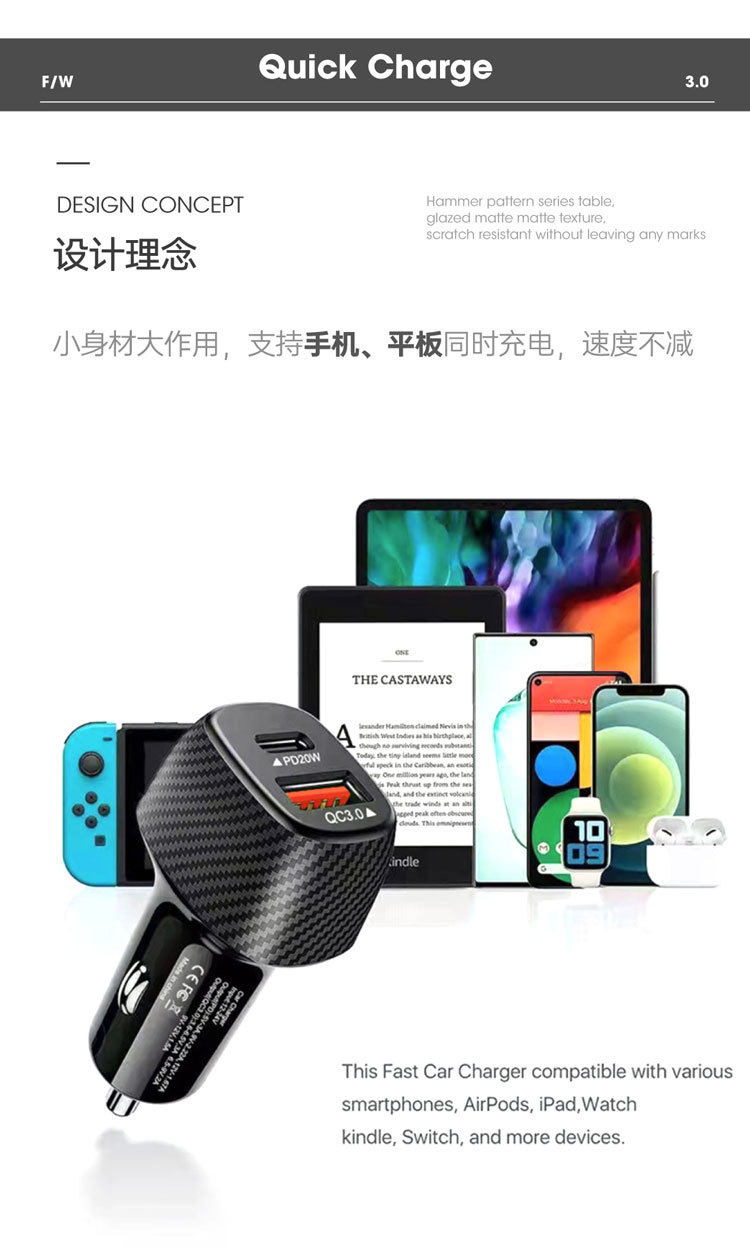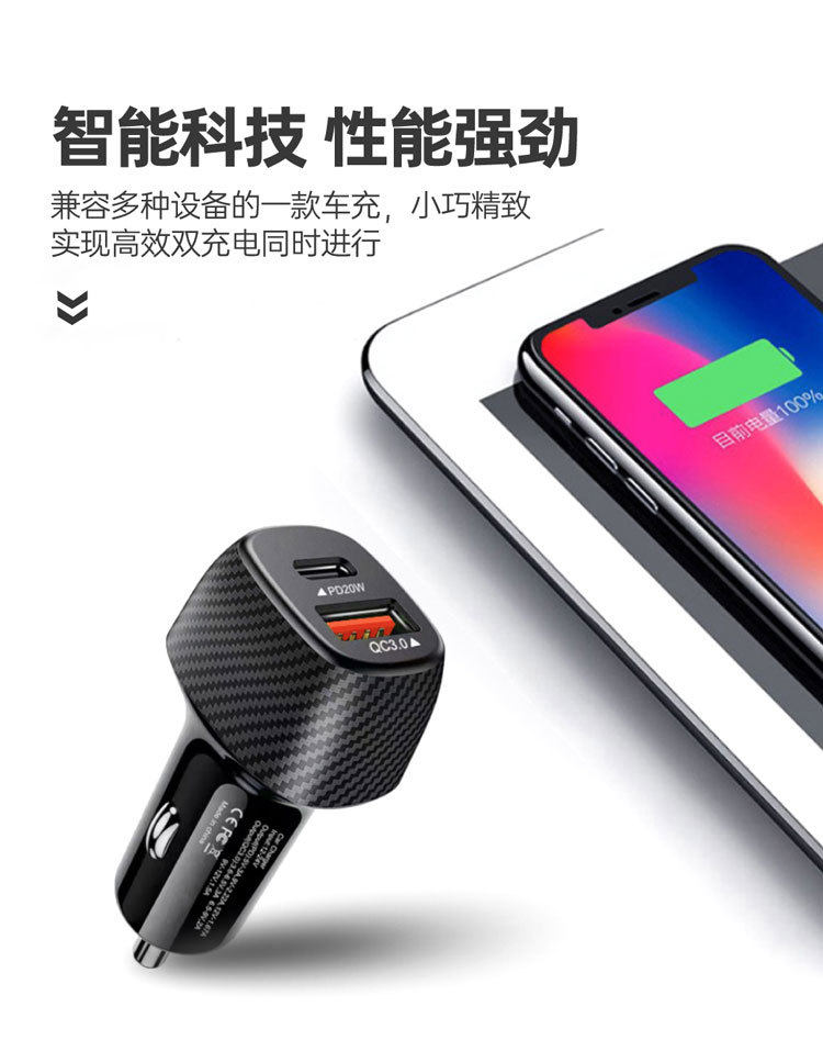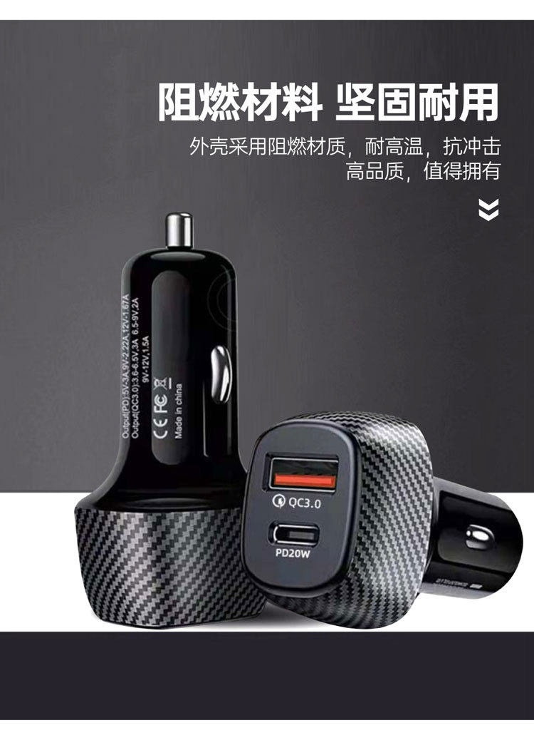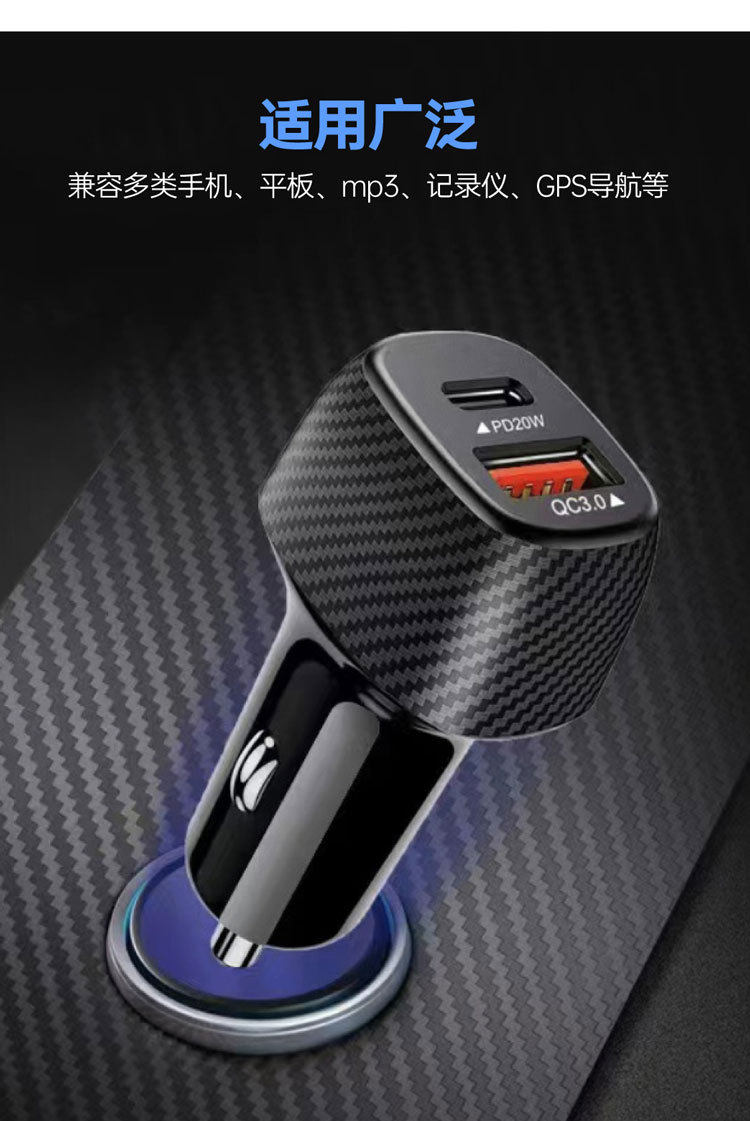 Carbon fiber car charger car charger 3.1A + PD fast charging head car cigarette lighter USB + PD