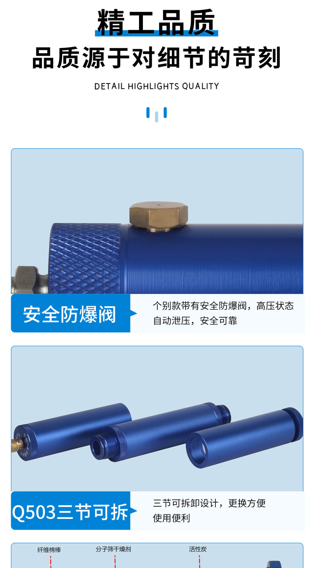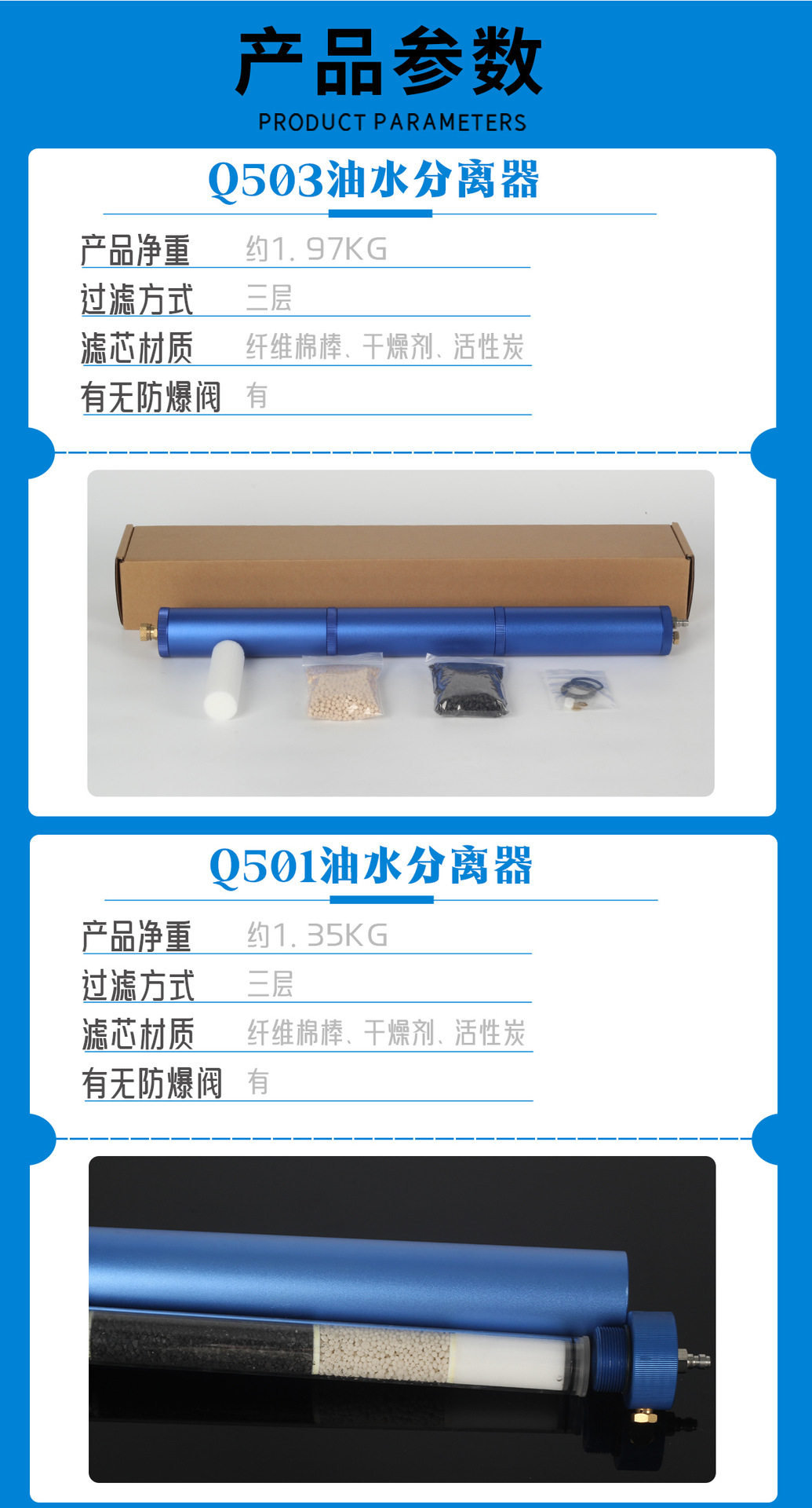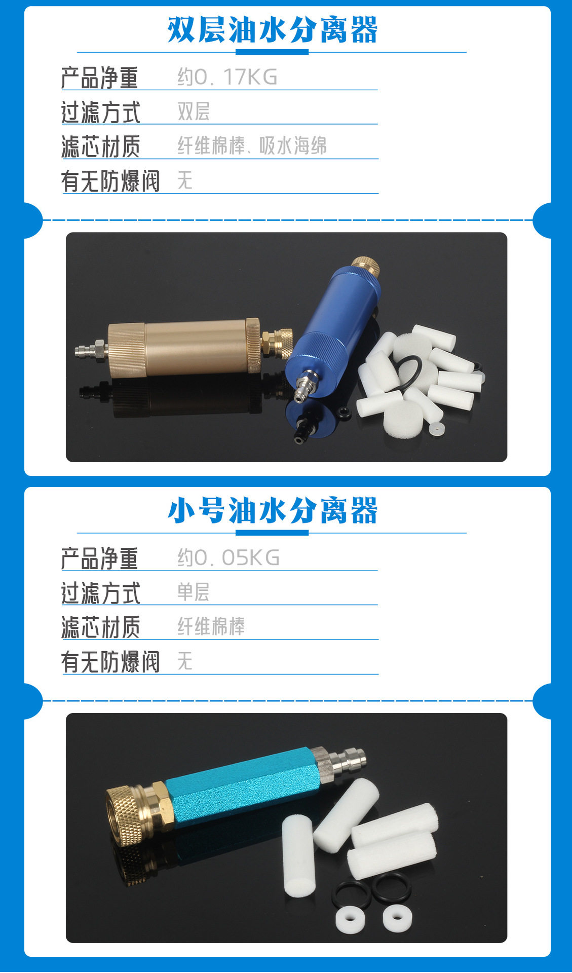 | Product specifications | Small blue part with male and female connector configuration one cotton swab*10,Small blue part with male and female connector configuration 2 cotton swabs*20,Blue double layer separator with male and female connector configuration one,Gold double layer separator with male and female connector configuration one,Blue double layer separator with male and female connector configuration 2,Gold double layer separator with male and female connector configuration 2,Blue double layer separator with male and female head with explosion-proof valve configuration one,Blue double layer separator with male and female head with explosion-proof valve configuration 2,Round head with male and female head double layer separator,Secondary oil and water filter q35 configuration one,Secondary oil and water filter q35 configuration 2,Secondary oil and water filter q35 configuration three,Secondary oil and water filter q35 configuration four,Q37 black configuration one,Q37 blue configuration one,Q37 black configuration two,Q37 blue configuration two,Q37 black configuration three,Q37 blue configuration three,Q37 black configuration four,Q37 blue configuration four,Q37 black configuration five,Q37 blue configuration five,Q37 black configuration six,Q37 blue configuration six,Q37 black configuration seven,Q37 blue configuration seven,Q37 black configuration eight,Q37 blue configuration eight,Q501 gold configuration one,Q501 blue configuration one,Q501 gold configuration two,Q501 blue configuration two,Q501 gold configuration three,Q501 blue configuration three,Q501 gold configuration four,Q501 blue configuration four,Q501 gold configuration five,Q501 blue configuration five,Q501 gold configuration six,Q501 blue configuration six,Q501 gold configuration seven,Q501 blue configuration seven,Q503 configuration one,Q503 configuration two,Q503 configuration three,Q503 configuration four,Q503 configuration five |