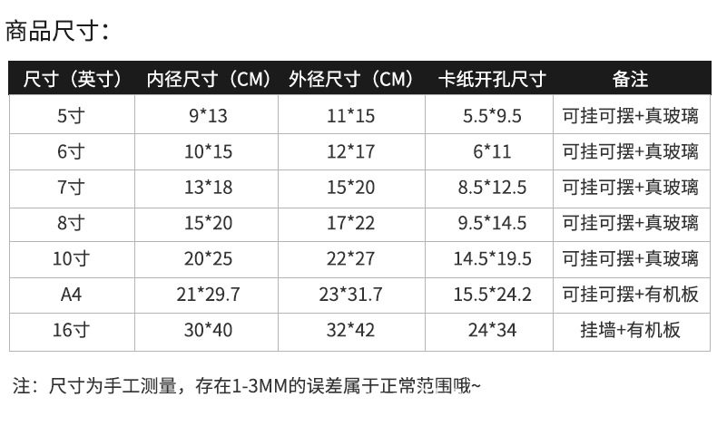 | Frame size | 5 inches (inner diameter 9*13) can be hung and placed,6inch (inner diameter 10*15) can be hung or placed,7 inches (inner diameter 13*18) can be hung and placed,8 inches (inner diameter 15*20) can be hung and placed,10 inches (inner diameter 20*25) can be hung and placed,A4 (inner diameter 21*29.7) can be hung with swing organic glass,16-inch (inner diameter 30*40) wall-mounted organic glass |