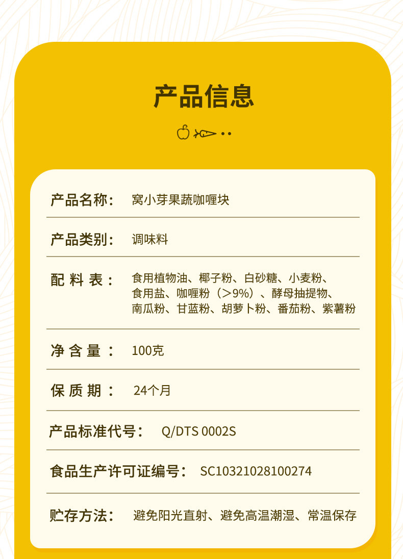 | Packaging specifications | Fruit and vegetable curry Block 100g |