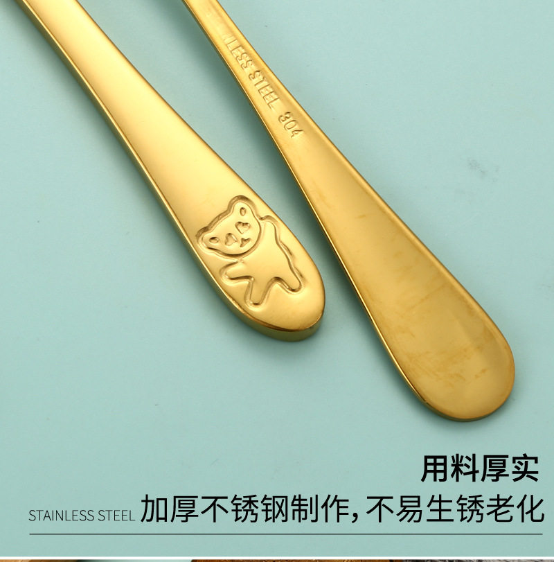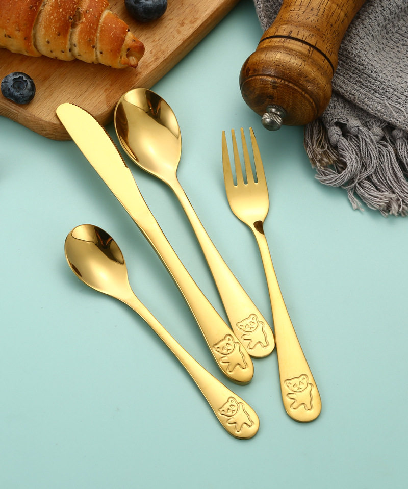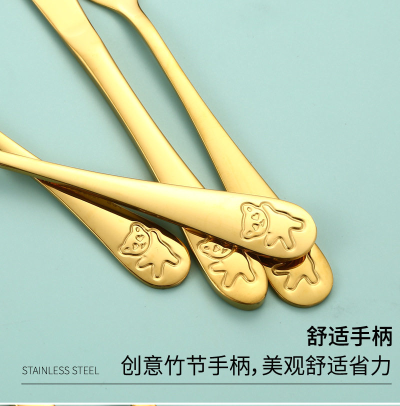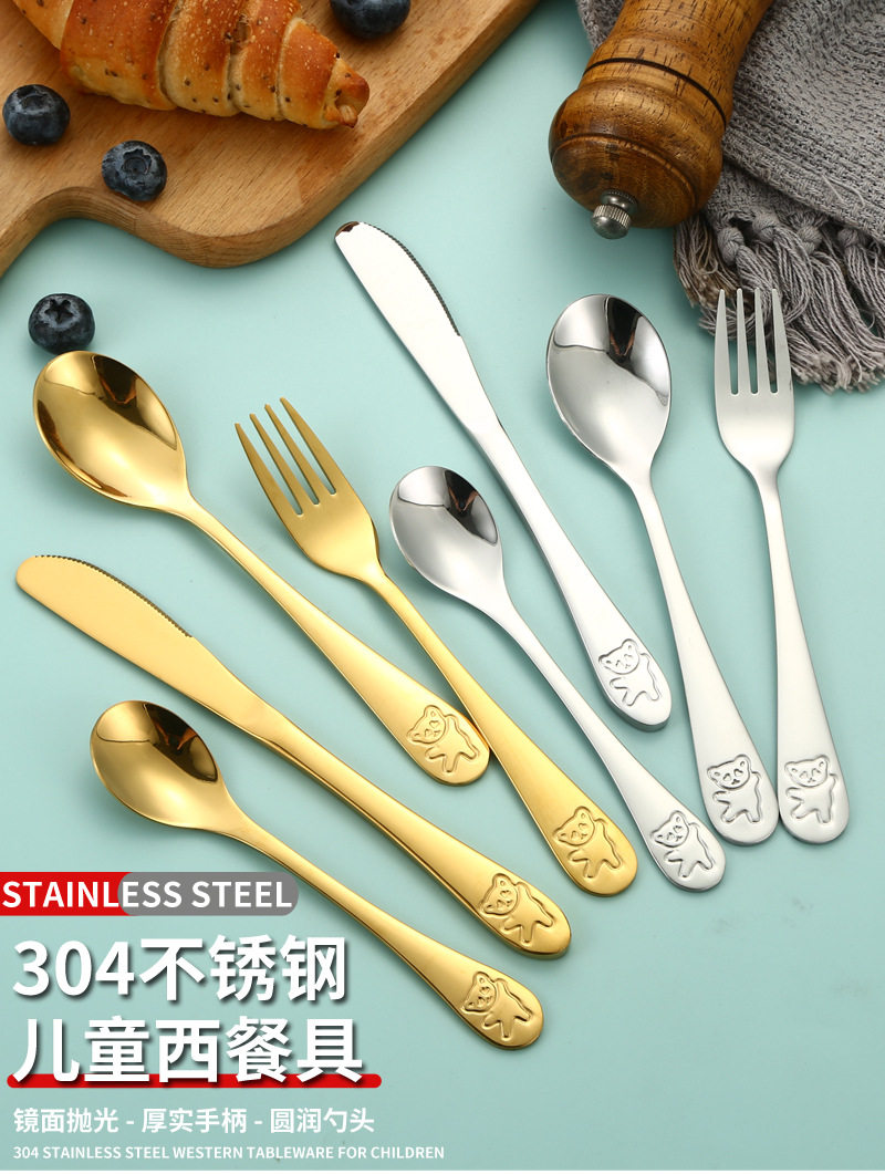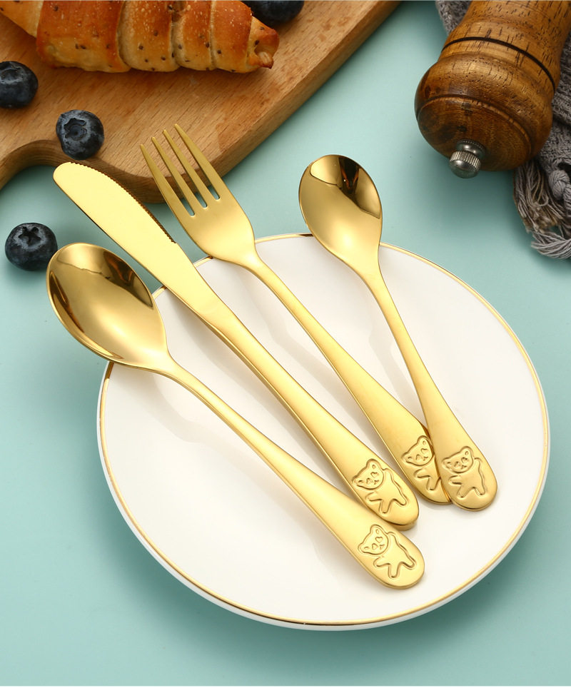 Bear four-piece 304 stainless steel tableware suit cartoon children's spoon Fork knife dessert spoon student Golden Western food