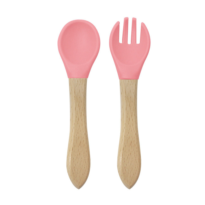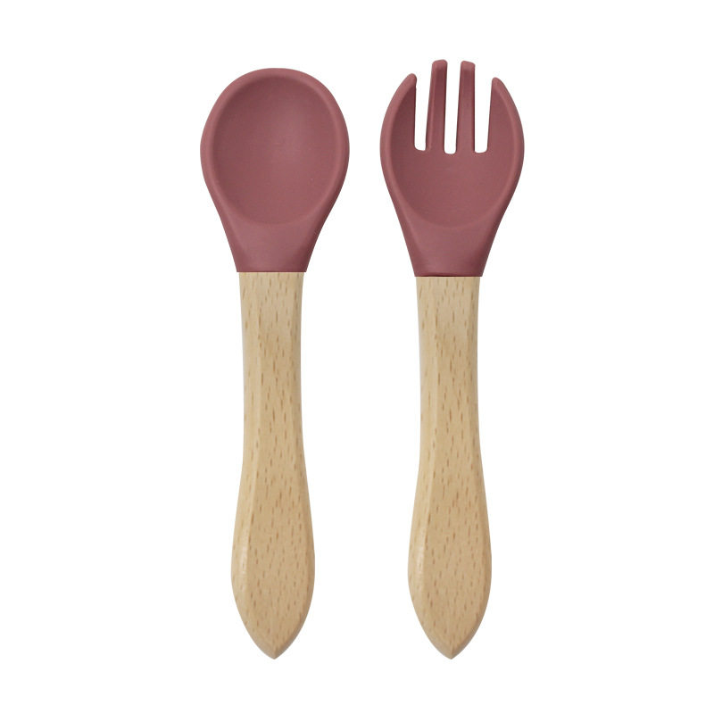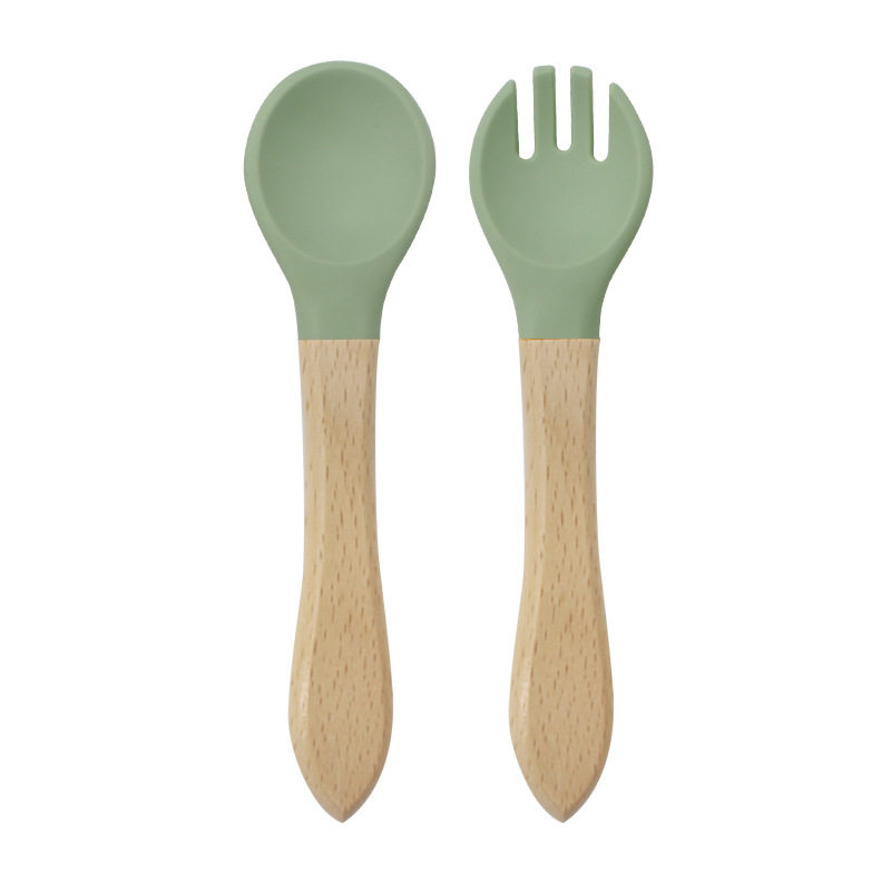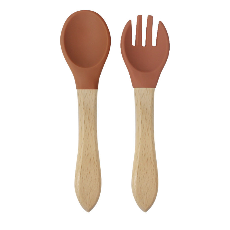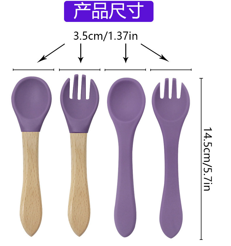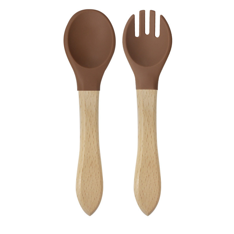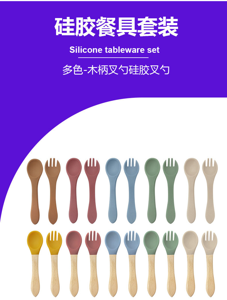 Baby food grade silicone food supplement fork spoon children anti-fall anti-deformation multi-color silicone fork spoon wooden handle fork spoon suit