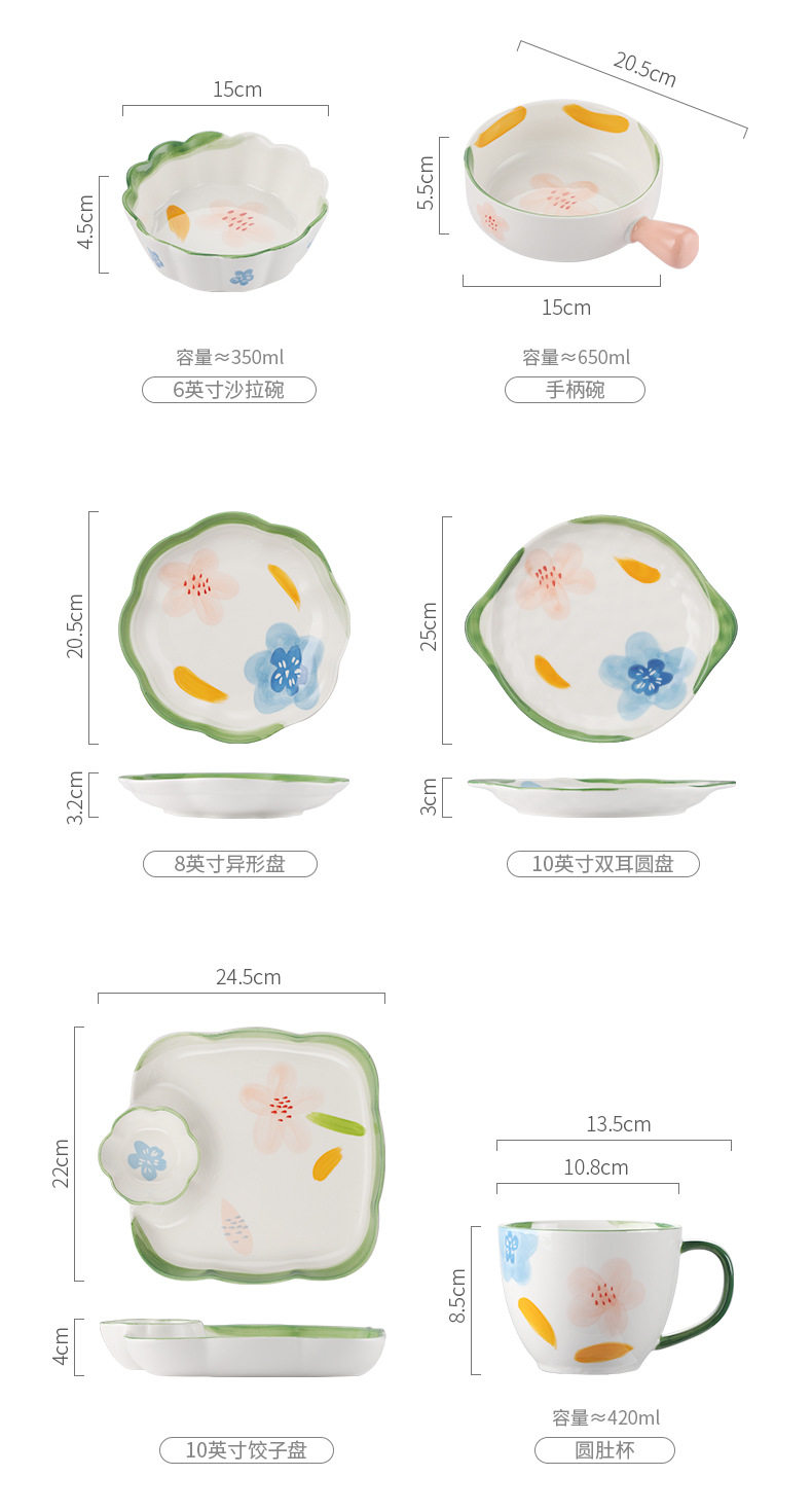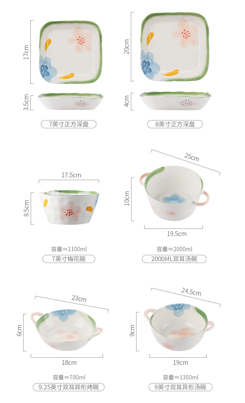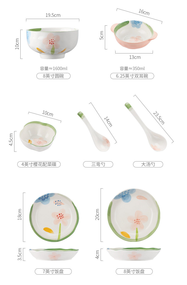 | Color | Small spoons (480 pieces can be packed in a box),4inch cherry blossom side dishes (160 pieces can be packed in a box),Large spoon (160 pieces can be packed in a box),5.5inch round bowls (60 pieces can be packed in a box),6.25inch double-eared soup bowls (48 pieces can be packed in a box),7inch round bowls (32 pieces can be packed in a box),8inch lace plates (48 pieces can be packed in a box),8inch round bowls (20 pieces can be packed in a box),10inch double-ear shallow discs (48 pieces can be packed in a box),9.25inch double-eared special-shaped baking bowl,13inch pairs of fish plates (30 pieces can be packed in a box),2l double-eared soup pot (24 pieces can be packed in a box) |