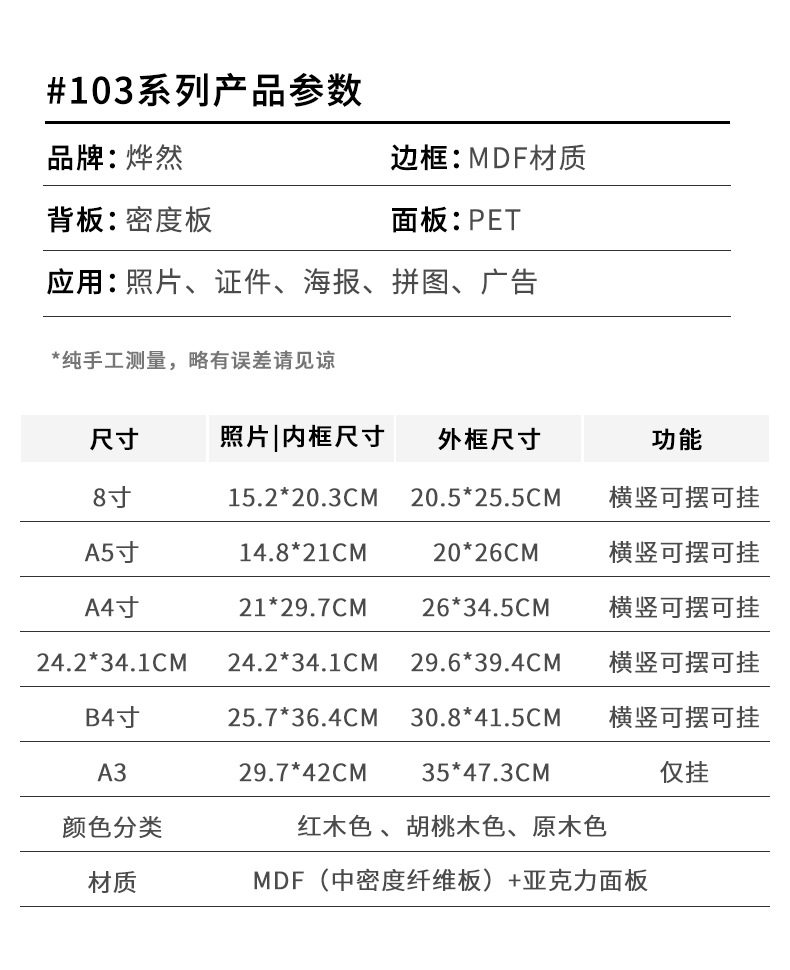 | Frame size | 8 inch: inner frame 15.2*20.3CM,A5 inch: inner frame 14.8*21CM,A4: inner frame 21*29.7CM,A3 inch (only hanging): inner frame 29.7 × 42CM,8K: inner frame 26.5*38CM,B4 inch: inner frame 25.7*36.4CM,Inner frame: 24.2*34.1CM |