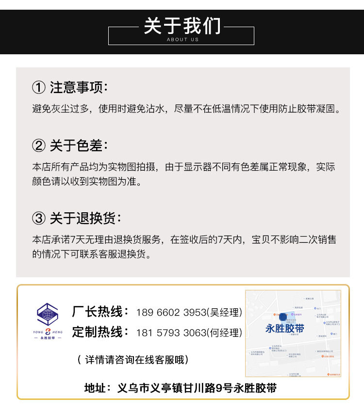 | Specifications and models | Transparent yellow; width 42*thickness 7*30 [full box of 84 rolls] (including paper tube thickness 7mm!),Transparent yellow; width 42*thickness 10*50 [full box of 84 rolls],Transparent yellow; width 42*thickness 20*110 [full box of 56 rolls],Transparent yellow; width 42*thickness 25*160 [full box of 42 rolls],Transparent yellow; width 42*thickness 30*200 [full box of 42 rolls],Transparent yellow; width 45*thickness 20*110 [full box of 48 rolls],Transparent yellow; width 45*thickness 25*160 [36 rolls in a box],Transparent yellow; width 45*thickness 30*200 [36 rolls in a box],Transparent yellow; width 45*thickness 35*300 [full box of 24 rolls],Transparent yellow; width 48*thickness 20*110 [full box of 48 rolls],Transparent yellow; width 48*thickness 25*160 [full box of 36 rolls],Transparent yellow; width 48*thickness 30*200 [36 rolls in a box],Transparent yellow; width 48*thickness 32*260 [full box of 36 rolls],Transparent yellow; width 55*thickness 20*110 [full box of 48 rolls],Transparent yellow; width 55*thickness 25*160 [36 rolls in a box],Transparent yellow; width 55*thickness 30*200 [36 rolls in a box],Transparent yellow; width 60*thickness 20*110 [full box of 40 rolls],Transparent yellow; width 60*thickness 25*160 [30 rolls in a box],Transparent yellow; width 60*thickness 30*200 [30 rolls in a box],Transparent white; width 42*thickness 20*110 [full box of 56 rolls],Transparent white; width 42*thickness 25*160 [full box of 42 rolls],Transparent white; width 42*thickness 30*200 [full box of 42 rolls],Transparent white; width 45*thickness 20*110 [full box of 48 rolls],Transparent white; width 45*thickness 25*160 [36 rolls in a box],Transparent white; width 45*thickness 30*200 [36 rolls in a box],Transparent white; width 48*thickness 20*110 [full box of 48 rolls],Transparent white; width 48*thickness 25*160 [full box of 36 rolls],Transparent white; width 48*thickness 30*200 [full box of 36 rolls],Transparent white; width 55*thickness 20*110 [full box of 48 rolls],Transparent white; width 55*thickness 25*160 [36 rolls in a box],Transparent white; width 55*thickness 30*200 [36 rolls in a box],Transparent white; width 60*thickness 20*110 [full box of 40 rolls],Transparent white; width 60*thickness 25*160 [30 rolls in a box],Transparent white; width 60*thickness 30*200 [30 rolls in a box],Beige; width 42*thickness 20*110 [full box of 56 rolls],Beige; width 42*thickness 25*160 [full box of 42 rolls],Beige; width 42*thickness 30*200 [full box of 42 rolls],Beige; width 45*thickness 20*110 [full box of 48 rolls],Beige; width 45*thickness 25*160 [full box of 36 rolls],Beige; width 45*thickness 30*200 [36 rolls in a box],Beige; width 48*thickness 20*110 [full box of 48 rolls],Beige; width 48*thickness 25*160 [full box of 36 rolls],Beige; width 48*thickness 30*200 [36 rolls in a box],Beige; width 55*thickness 20*110 [full box of 48 rolls],Beige; width 55*thickness 25*160 [36 rolls in a box],Beige; width 55*thickness 30*200 [full box of 36 rolls],Beige; width 60*thickness 20*110 [full box of 40 rolls],Beige; width 60*thickness 25*160 [30 rolls in a box],Beige; width 60*thickness 30*200 [30 rolls in a box],Taobao blue; width 42*thickness 20*110 [full box of 56 rolls],Taobao red; width 42*thickness 25*160 [full box of 42 rolls] |