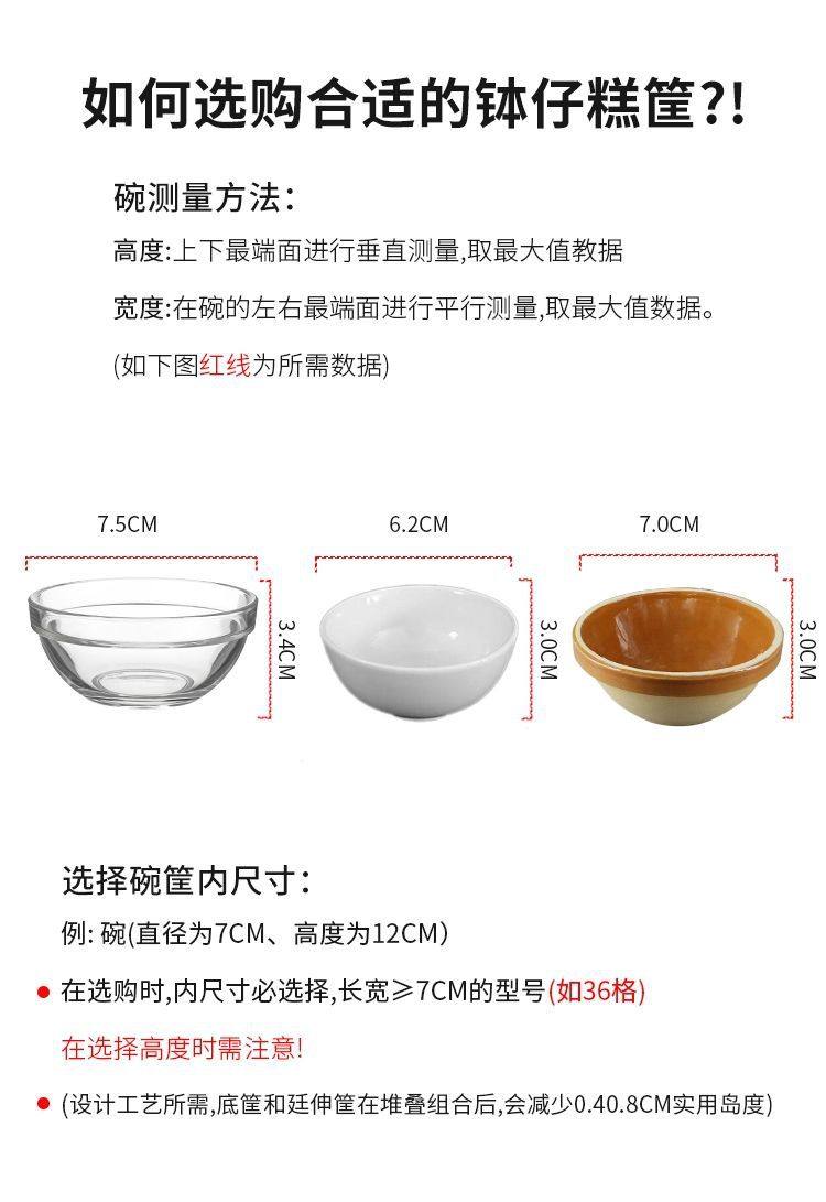 | Specifications | [new style] 1 layer and 1 lid - can hold 12 7.5cm bowls,[new style] 2 layers, 2 lids - can hold 24 7.5cm bowls,[new model] 3 layers and 3 lids - can hold 36 7.5cm bowls,[new style] 4 layers and 4 lids - can hold 48 7.5cm bowls,[new style] 5 layers and 5 lids - can hold 60 7.5cm bowls,[new style] 6 layers and 6 lids - can hold 72 7.5cm bowls,[new model] 7 layers and 7 lids - can hold 84 7.5cm bowls,[new model] 8 layers and 8 lids - can hold 96 7.5cm bowls,[new style 0106 box] can be placed in two layers - can hold 24 7.5cm bowls,Combination package (suitcase + 5 layers and 5 lids) - can hold 60 7.5cm bowls,Bobo cake special glass bowl (7.5cm) 36 pieces |