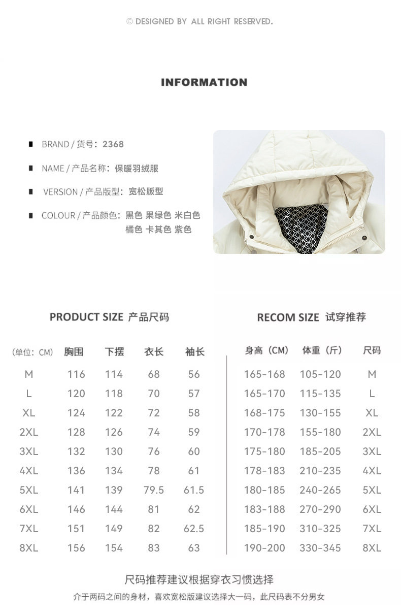 | Size | 160(M): less than 120kg,165(L): less than 135kg,170(XL): less than 150kg,175(2XL): less than 170kg,180(3XL): less than 195kg,185(4XL): less than 220kg,5XL (less than 250kg),6XL (less than 280kg),7XL (less than 310kg),8XL (less than 330kg) |