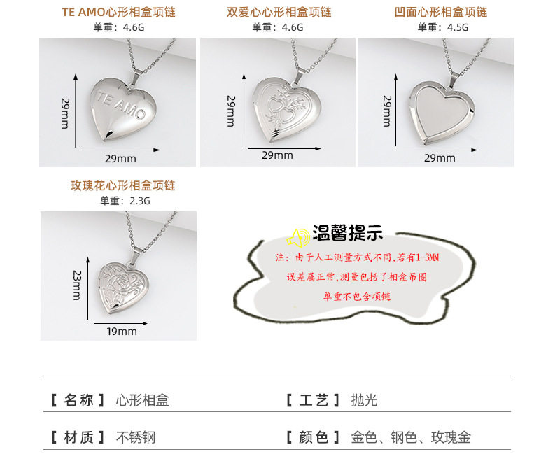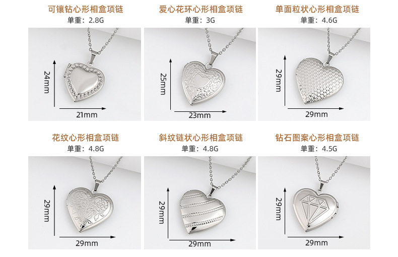 | Color | [necklace] plum pattern round photo box 27*27mm/steel color,[necklace] plum blossom pattern round photo box 27*27mm/gold,[necklace] plum pattern round photo box 27*27mm/rose gold,[necklace] oval peach blossom photo box 33.5*24mm/steel color,[necklace] oval peach blossom photo box 33.5*24mm/gold,[necklace] oval peach blossom photo box 33.5*24mm/rose gold,[necklace] magic mirror oval photo box 24*33mm/steel color,[necklace] chrysanthemum pattern round photo box 27*27mm/steel color,[necklace] chrysanthemum pattern round photo box 27*27mm/gold,[necklace] tree of life round phase 27*27mm/steel color,[necklace] tree of life round photo box 31*31mm/steel color,[necklace] patterned round photo box 31*31mm/steel color,[necklace] patterned round photo box 31*31mm/gold,[necklace] concave round photo box 27*27mm/steel color,[necklace] concave pattern round photo box 32*32mm/steel color,[necklace] concave pattern round photo box 32*32mm/gold,[necklace] concave heart-shaped photo box 23*25mm/steel color,[necklace] concave heart-shaped photo box 23*25mm/gold,[necklace] concave heart-shaped photo box 29*29mm/steel color,[necklace] concave lace oval photo box 24*33mm/steel color,[necklace] six-pointed star round photo box 31*31mm/steel color,[necklace] round glossy photo box 20*20mm/steel color,[necklace] round glossy photo box 20*20mm/gold,[necklace] round glossy photo box 20*20mm/rose gold,[necklace] round glossy photo box 27*27mm/steel color,[necklace] round glossy photo box 27*27mm/gold,[necklace] round glossy photo box 27*27mm/rose gold,[necklace] oval ruyi photo box 24*16mm/steel color,[necklace] oval glossy photo box 24*16mm/steel color,[necklace] oval glossy photo box 24*16mm/rose gold,[necklace] oval glossy photo box 30*24mm/steel color,[necklace] oval glossy photo box 30*24mm/gold,[necklace] oval glossy photo box 30*24mm/rose gold,[necklace] oval glossy photo box 40*27mm/steel color,[necklace] oval glossy photo box 24*16mm/gold,[necklace] square double glossy model 26*19mm/steel color,[necklace] square double glossy model 26*19mm/gold,[necklace] square double glossy model 26*19mm/rose gold,[necklace] square photo box large tree style 26*19mm/steel color,[necklace] square photo box christmas tree style 26*19mm/steel color,[necklace] square photo box double-sided pattern 26*19mm/steel color,[necklace] square photo box double-sided pattern 26*19mm/gold,[necklace] small cross square photo box 17.3*11.5mm/steel color,[necklace] ruyi heart-shaped photo box 15*13mm/steel color,[necklace] ruyi heart-shaped photo box 15*13mm/gold,[necklace] vine flower heart-shaped photo box 22*20mm/steel color,[necklace] vine flower heart-shaped photo box 22*20mm/gold,[necklace] ruyi heart-shaped photo box 22*20mm/steel color,[necklace] ruyi heart-shaped photo box 22*20mm/gold,[necklace] glossy heart-shaped photo box 13*15mm/steel color,[necklace] glossy heart-shaped photo box 13*15mm/gold,[necklace] glossy heart-shaped photo box 19*23mm/steel color,[necklace] glossy heart-shaped photo box 19*23mm/gold,[necklace] glossy heart-shaped photo box 23*25mm/steel color,[necklace] glossy heart-shaped photo box 23*25mm/gold,[necklace] glossy heart-shaped photo box 23*25mm/rose gold,[necklace] glossy heart-shaped photo box 29*29mm/steel color,[necklace] glossy heart-shaped photo box 29*29mm/gold,[necklace] glossy heart-shaped photo box 29*29mm/rose gold,[necklace] glossy heart-shaped photo box 40*42mm/steel color,[necklace] glossy heart-shaped photo box 40*42mm/gold,[necklace] hollow round photo box 27*27mm/steel color,[necklace] shell-shaped photo box 23*23mm/steel color,[necklace] fish scale pattern heart-shaped photo box 29*29mm/steel color,[necklace] fish scale pattern heart-shaped photo box 42*40mm/steel color,[necklace] fish scale pattern heart-shaped photo box 29*29mm/gold,[necklace] rose heart-shaped photo box 29*29mm/steel color,[necklace] plant pattern heart-shaped photo box 29*29mm/steel color,[necklace] plant pattern heart-shaped photo box 29*29mm/gold,[necklace] wave pattern heart-shaped photo box 29*29mm/steel color,[necklace] wave pattern heart-shaped photo box 29*29mm/gold,[necklace] wave pattern heart-shaped photo box 29*29mm/rose gold,[necklace] coconut tree heart-shaped photo box 29*29mm/steel color,[necklace] tower heart-shaped photo box 29*29mm/steel color,[necklace] love heart-shaped photo box 29*29mm/steel color,[necklace] i love you heart-shaped photo box 29*29mm/steel color,[necklace] i love you heart-shaped photo box 29*29mm/gold,[necklace] i love you heart-shaped photo box 29*29mm/rose gold,[necklace] paper edge coconut tree cross heart-shaped photo box 42*40mm/steel color,[necklace] center love concave garland heart-shaped photo box 29*29mm/steel color,[necklace] center love convex wreath heart-shaped photo box 25*23mm/steel color,[necklace] center love convex wreath heart-shaped photo box 25*23mm/gold,[necklace] center love convex wreath heart-shaped photo box 25*23mm/rose gold,[necklace] center love convex wreath heart-shaped photo box 29*29mm/steel color,[necklace] center love convex wreath heart-shaped photo box 29*29mm/gold,[necklace] center love convex wreath heart-shaped photo box 29*29mm/rose gold,[necklace] center love convex wreath heart-shaped photo box 42*40mm/steel color,Packing method,Pearl necklace,Packaging,[necklace] teamo single-sided letter heart-shaped photo box 29*29mm/steel color,[necklace] teamo single-sided letter heart-shaped photo box 29*29mm/gold,[necklace] teamo single-sided letter heart-shaped photo box 29*29mm/rose gold,[necklace] love single-sided letter heart-shaped photo box 19x23/steel color,[necklace] patterned heart-shaped photo box 29*29/steel color,[necklace] pattern heart-shaped photo box 29*29/gold,[necklace] patterned heart-shaped photo box 29x29/rose gold,[necklace] rose heart-shaped photo box 29*29mm/gold,[necklace] rose heart-shaped photo box 29*29mm/rose gold,[necklace] rose heart-shaped photo box 19*23mm/steel color,[necklace] magic mirror love p