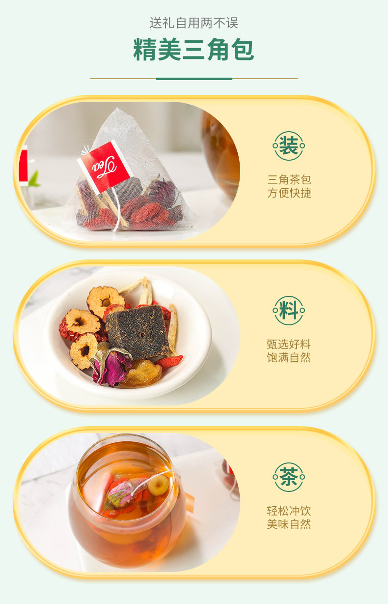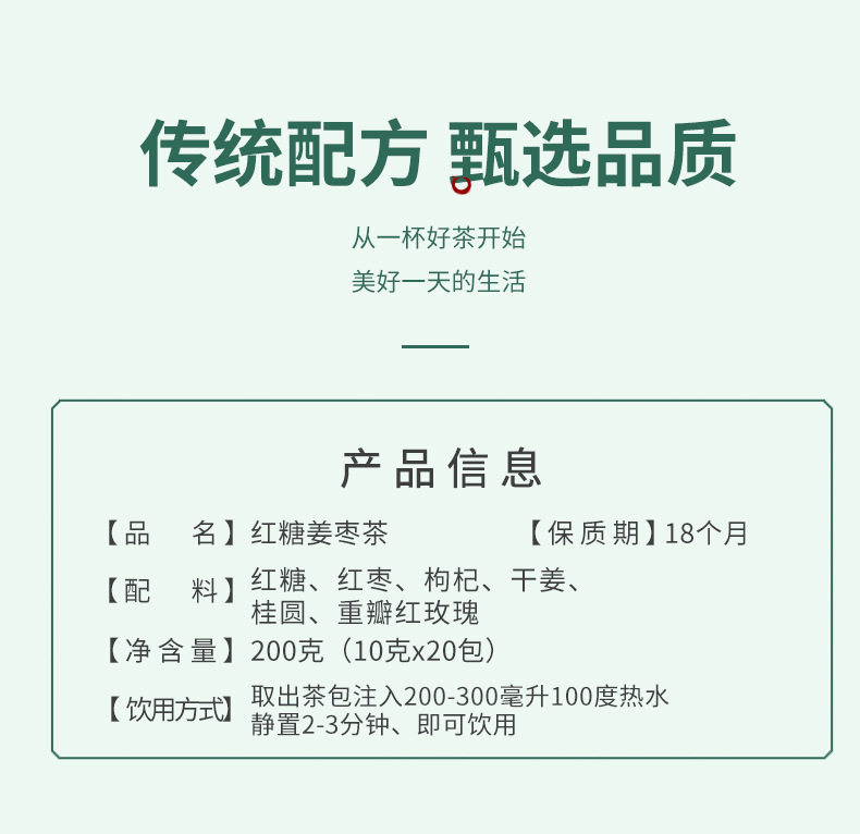 | Raw materials and ingredients | Brown sugar, red dates, longan, wolfberry, dried ginger, double red rose |