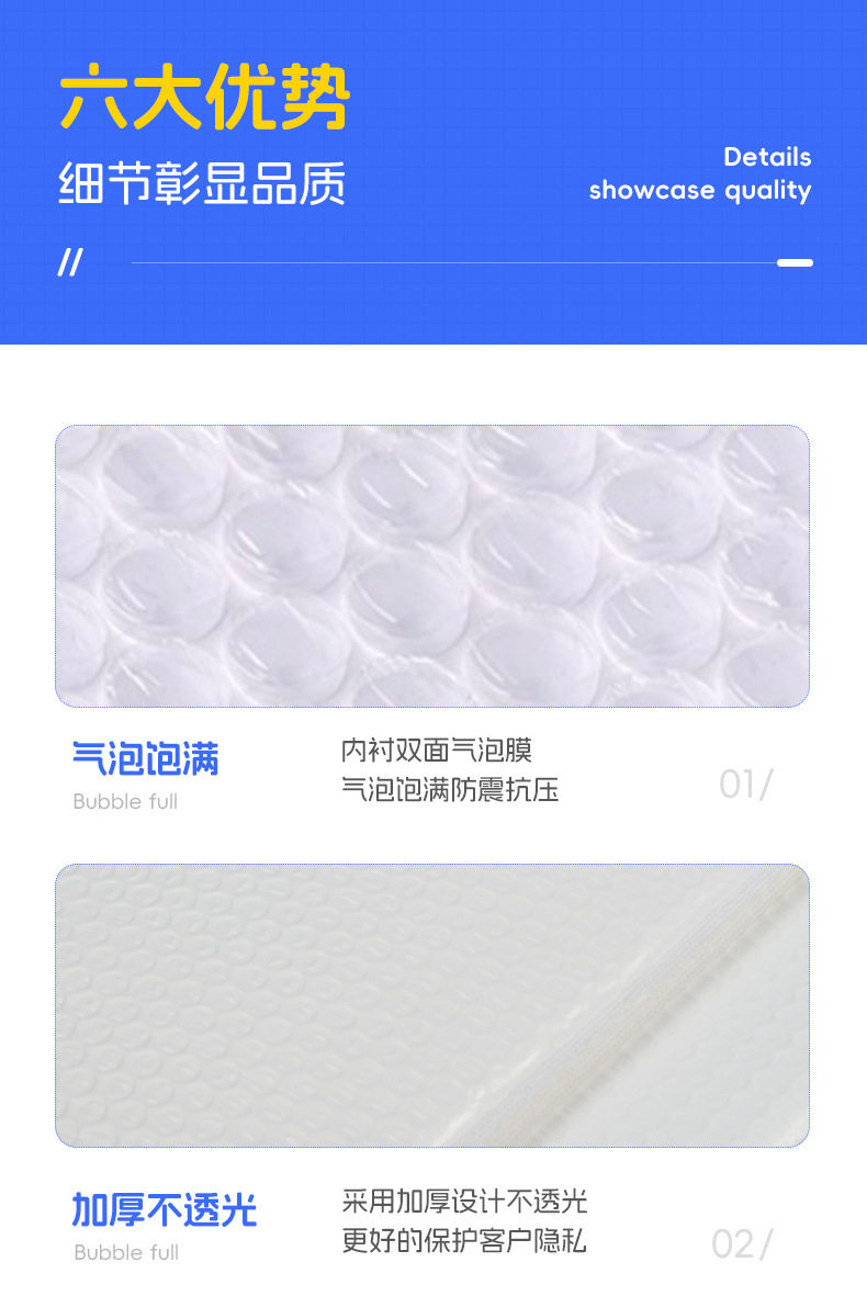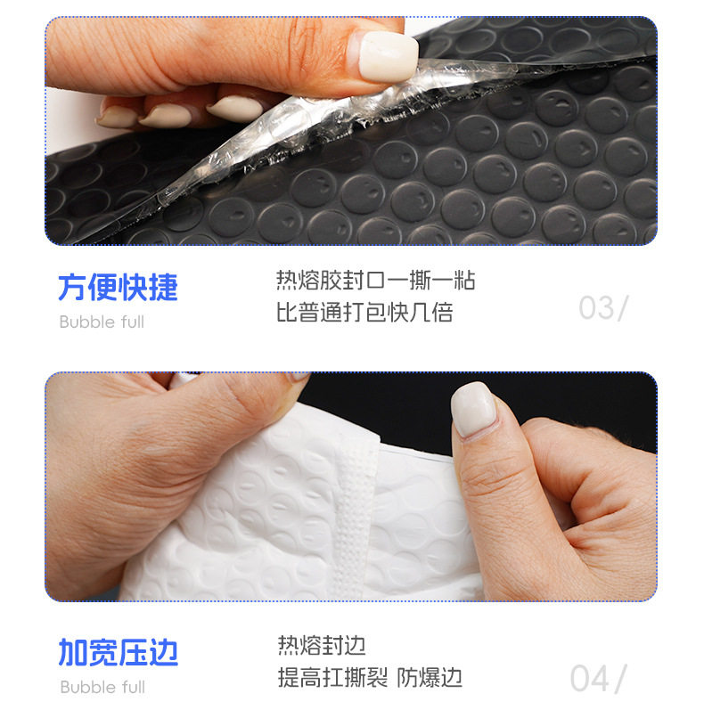 | Specifications and models | White bubble bag; 11*11+4cm (1500 pieces per box),White bubble bag; 11*15+4cm (1200 pieces for the whole box),White bubble bag; 12*18+4cm (900 pieces for the whole box),White bubble bag; 15*21+4cm (650 pieces for the whole box),White bubble bag; 15*25+4cm (700 pieces for the whole bag),White bubble bag; 18*23+4cm (take the whole bag of 500 pieces,White bubble bag; 20*25+4cm (take the whole bag of 500 pieces,White bubble bag; 23*28+4cm (take the whole bag of 400 pieces,White bubble bag; 25*30+4cm (take the whole bag of 300 pieces),White bubble bag; 27*32+4cm (take the whole bag of 300 pieces,White bubble bag; thickened 27*35+7 (take the whole bag of 300 pieces),White bubble bag; 28*35+5 (take the whole bag of 300 pieces),White bubble bag; 29*35+4cm (take the whole bag of 300 pieces),White bubble bag; 30*40+4cm (take the whole bag of 200 pieces),White bubble bag; 32*42+4cm (take the whole bag of 200 pieces),White bubble bag; 35*42+4cm (take the whole bag of 200 pieces),White bubble bag; 35*45+4cm (take the whole bag of 200 pieces),White bubble bag; 38*47+4cm (150 pieces for the whole bag),White bubble bag; 40*50+4cm (take the whole bag of 150 pieces),White bubble bag; 45*50+4cm (take the whole bag of 150 pieces),White bubble bag; 50*60+6cm (take the whole bag of 150 pieces),White bubble bag; 50*65+7cm (take the whole bag of 120 pieces),Black bubble bag; 20*25+4cm (take the whole bag of 500 pieces,Black bubble bag; 23*28+4cm (take the whole bag of 400 pieces,Black bubble bag; black co-extruded film 35*39+6 (take the whole bag of 200 pieces),Black bubble bag; black co-extruded film 42*49+5 (take the whole bag of 150 pieces) |