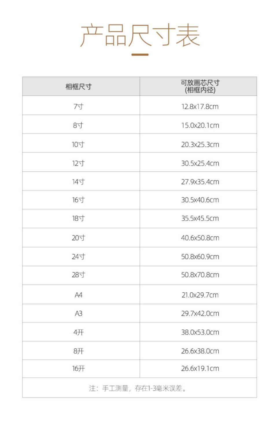 | Inner frame size | A4 [21.0*29.7cm] wall,A4 pendulum dual-purpose [29.7*21cm],A3 [can put 29.7*42cm],4 open [can put 38*53cm],8 open [can put 26.6*38cm],12 inch "30.5*25.4cm" wall,14 inches [28*35.4cm],16 inch [can hold 30.5*40.6cm],18 inches [can hold 35.5*45.5cm],20 inch [can put 40.6*50.8cm],5 inch [9*13cm] table,16 open [19*26.5cm] table |