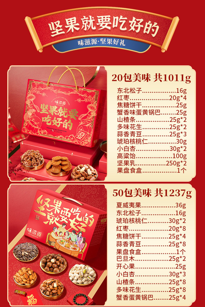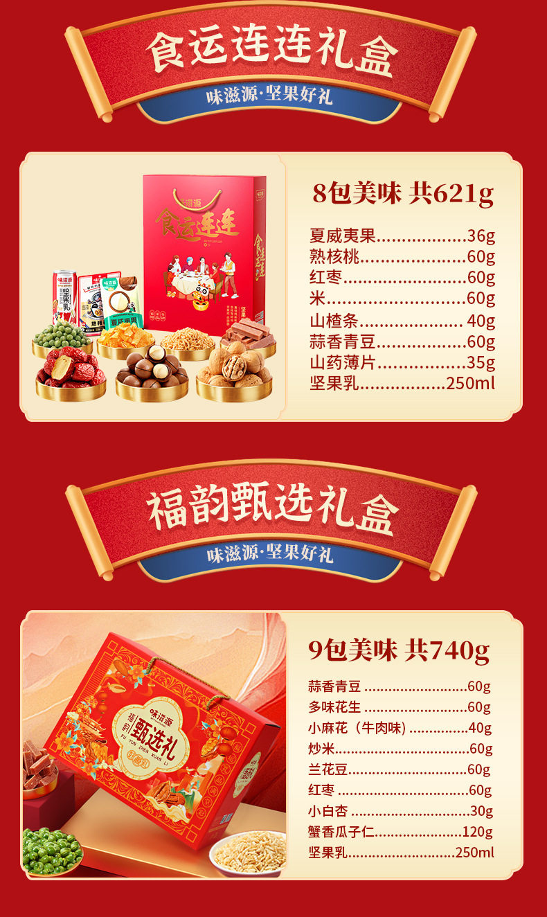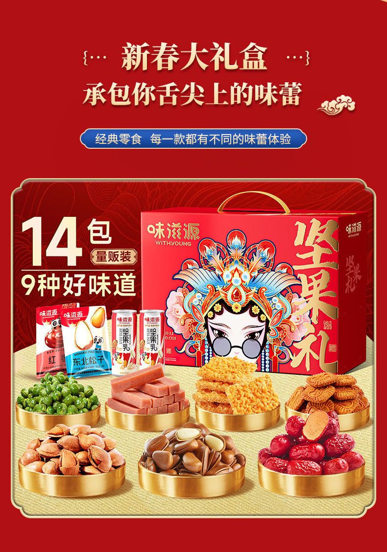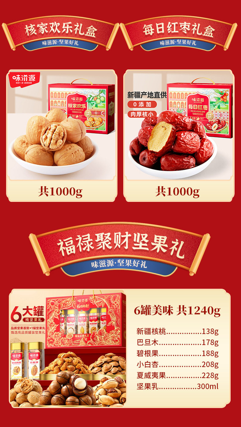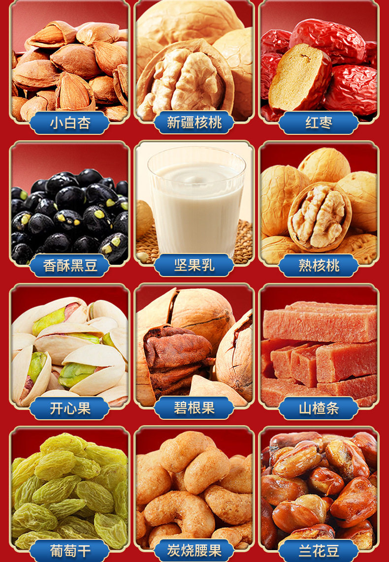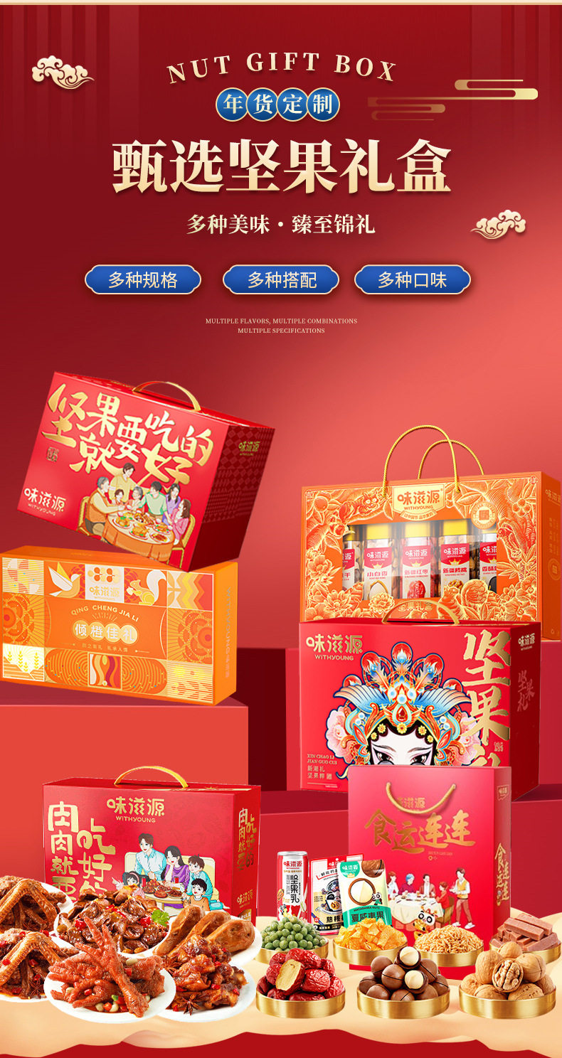 Packaging specifications [recommended] fortune & prosperity gift set 740g,[great value] xiangrui exclusive gift 1276g,Food comes and goes 750g,Food luck 621g,Guochao nut gift 771g,Good things happen gift box basket 500g,Qingcheng gift handbag gift box 371g,Good nut gift box 1011g,Spicy braised meat gift box 810g,Guo zhen ruyi nut gift box 1380g,Good nut gift box 1237g,Fortune & prosperity nut gift box 1240g,Nuts should be eaten in a good pure nut gift box 1600g,Daily red date gift box 1000g,Nucleus family fun gift box 1000g,Get money immediately 1199g