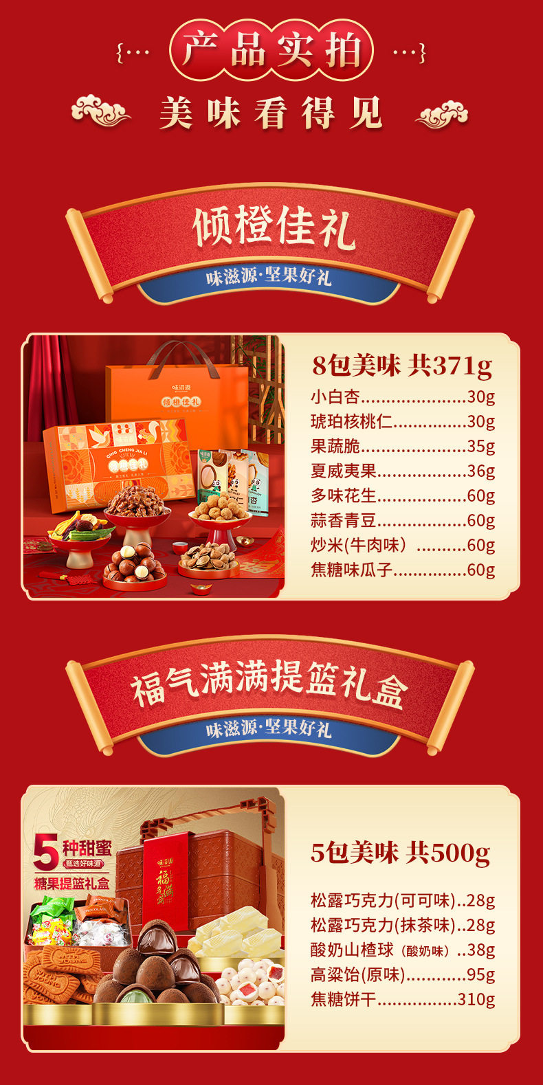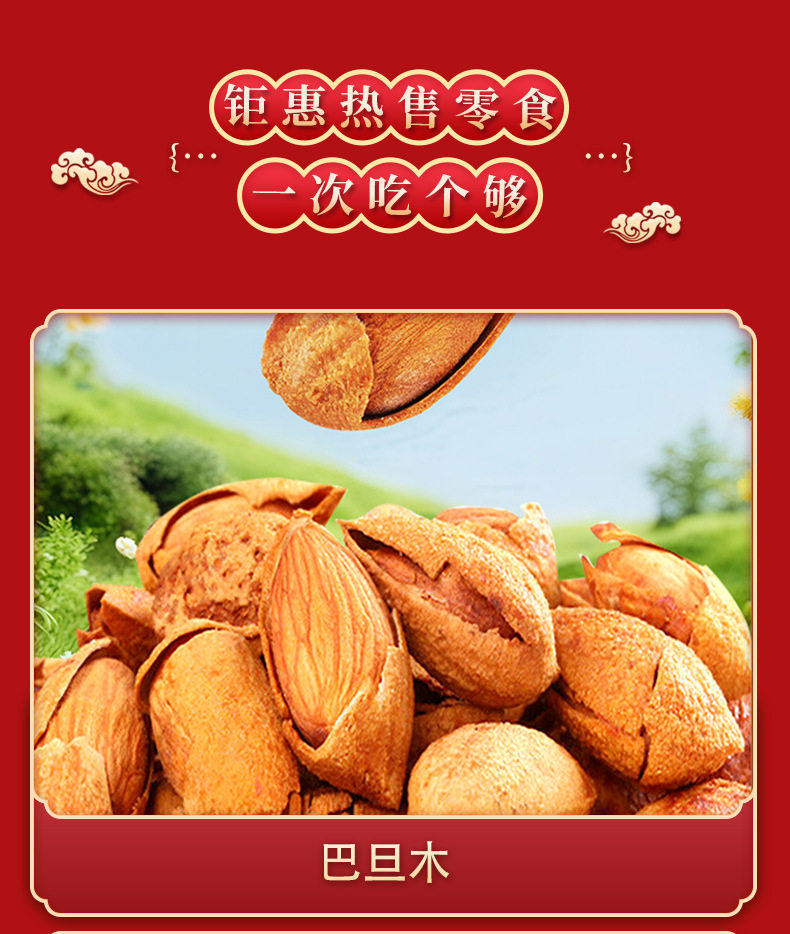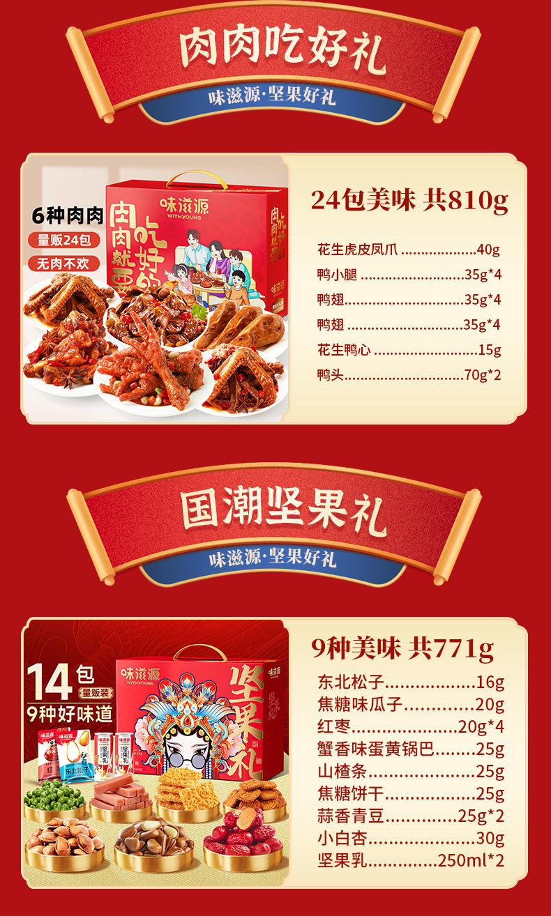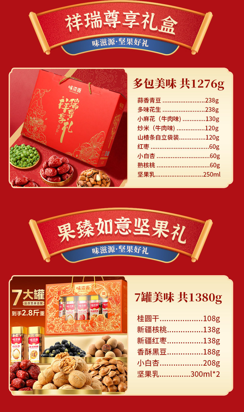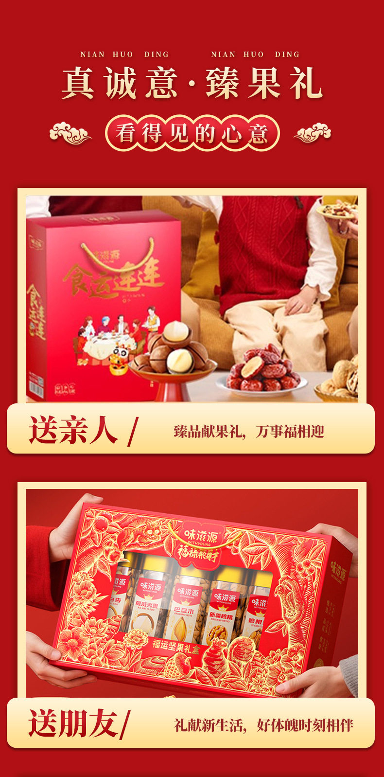 Packaging specifications [recommended] fortune & prosperity gift set 740g,[great value] xiangrui exclusive gift 1276g,Food comes and goes 750g,Food luck 621g,Guochao nut gift 771g,Good things happen gift box basket 500g,Qingcheng gift handbag gift box 371g,Good nut gift box 1011g,Spicy braised meat gift box 810g,Guo zhen ruyi nut gift box 1380g,Good nut gift box 1237g,Fortune & prosperity nut gift box 1240g,Nuts should be eaten in a good pure nut gift box 1600g,Daily red date gift box 1000g,Nucleus family fun gift box 1000g,Get money immediately 1199g