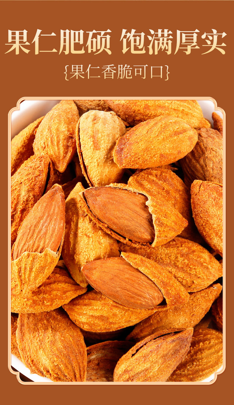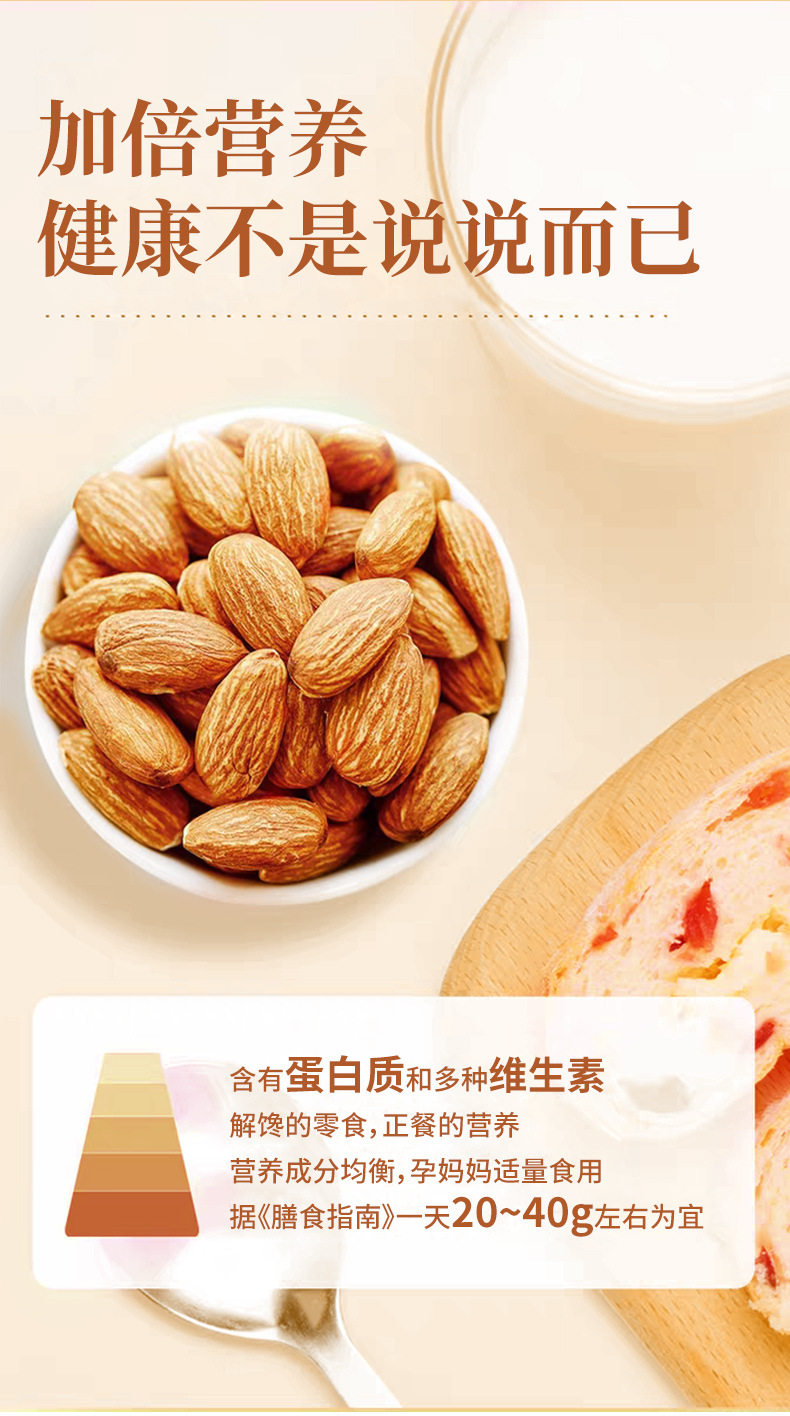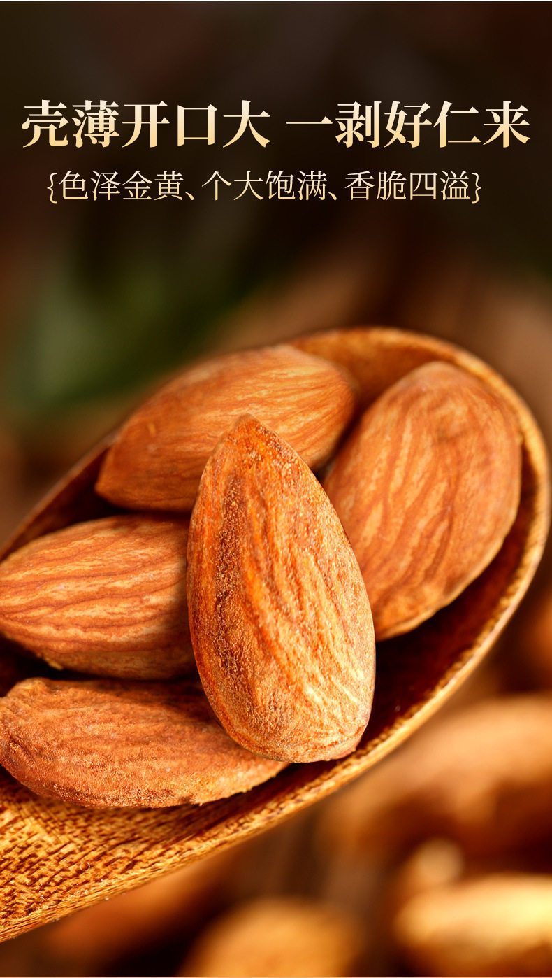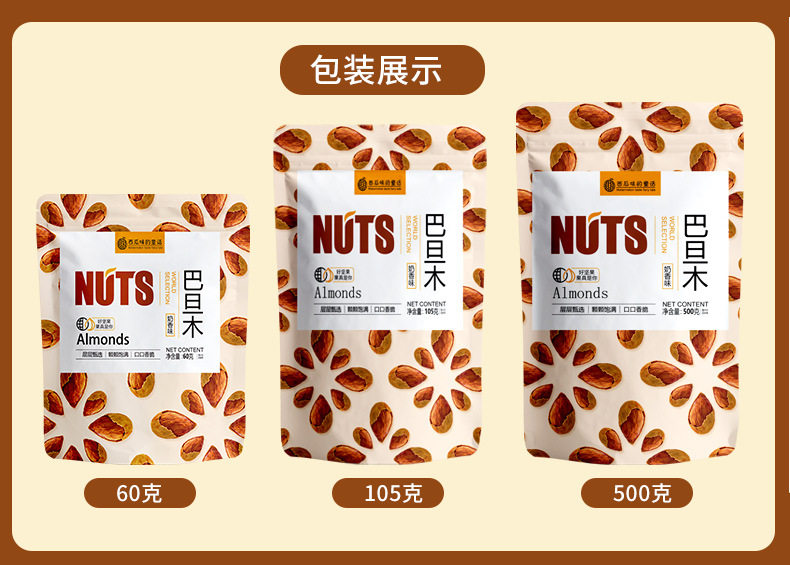 | Packaging specifications | Almond 60g/bag,Almond 105g/bag,Almond 250g (net weight 150g)/can,Almond 500g/bag,Almond 5kg |