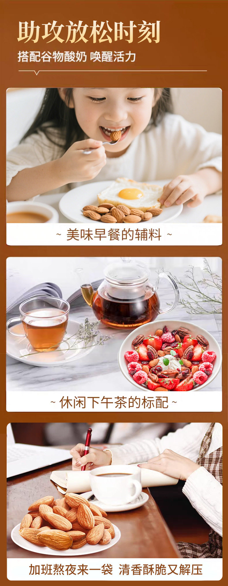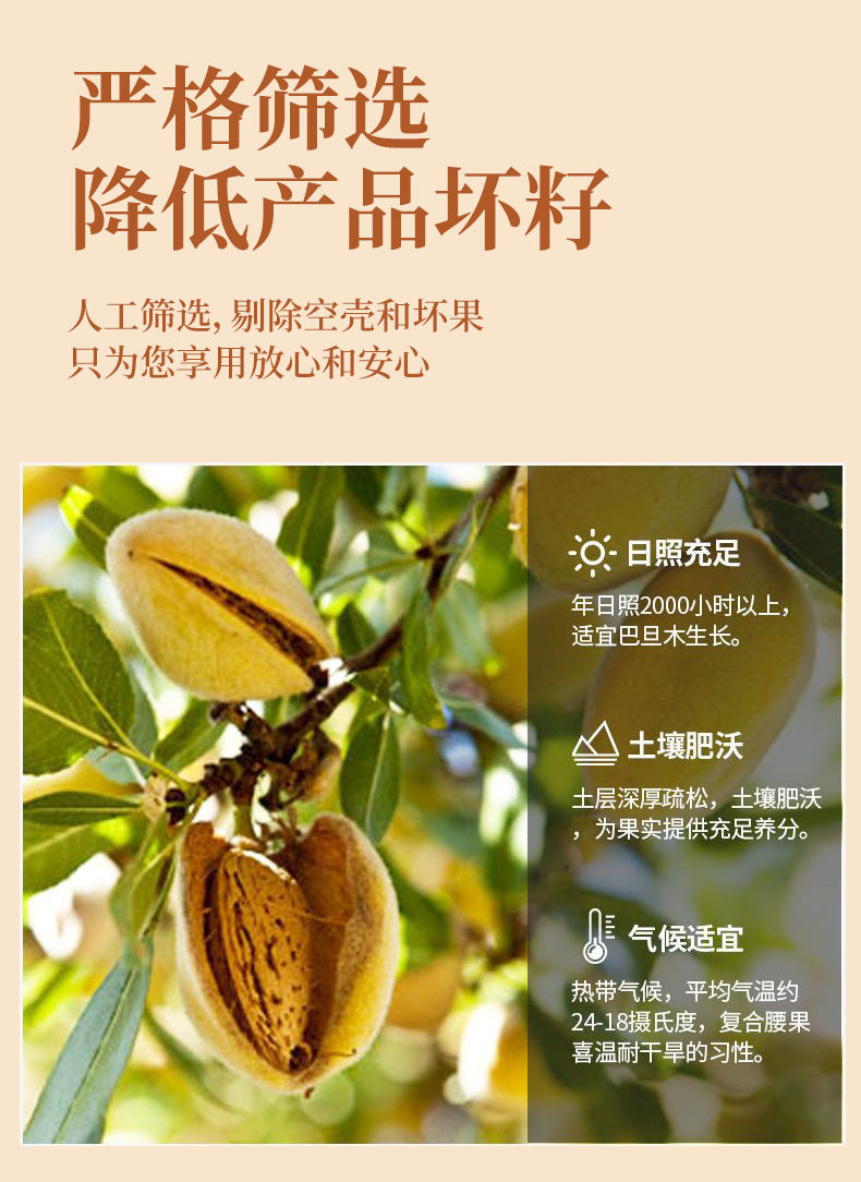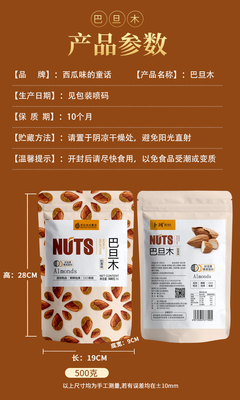 | Packaging specifications | Almond 60g/bag,Almond 105g/bag,Almond 250g (net weight 150g)/can,Almond 500g/bag,Almond 5kg |