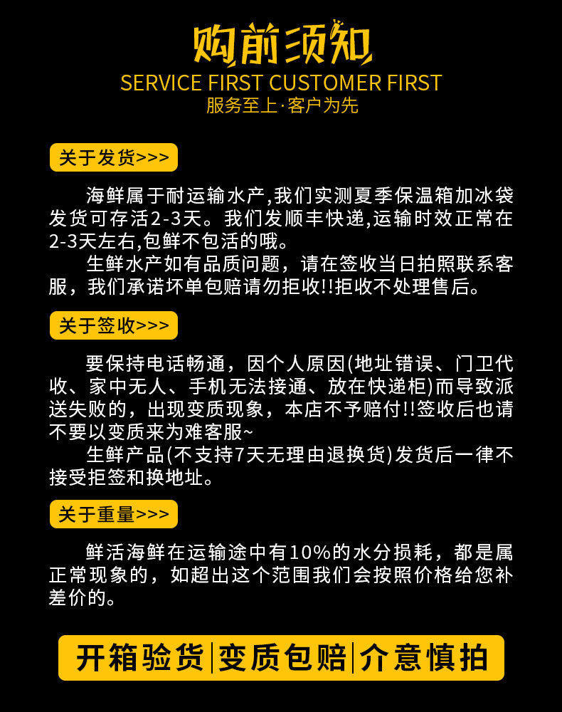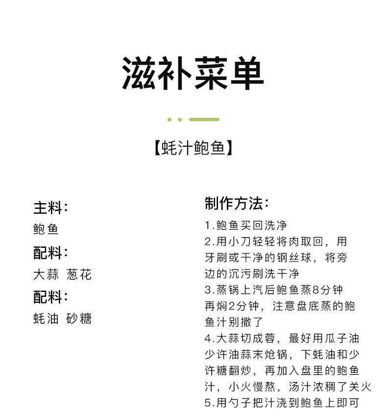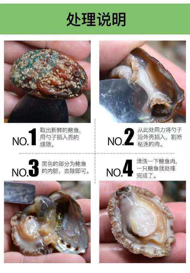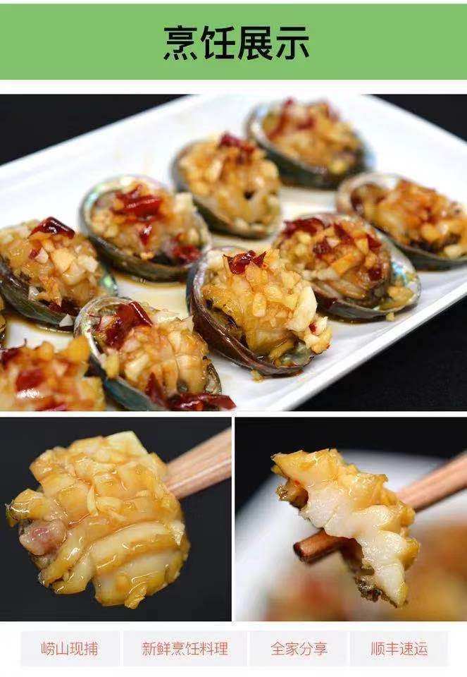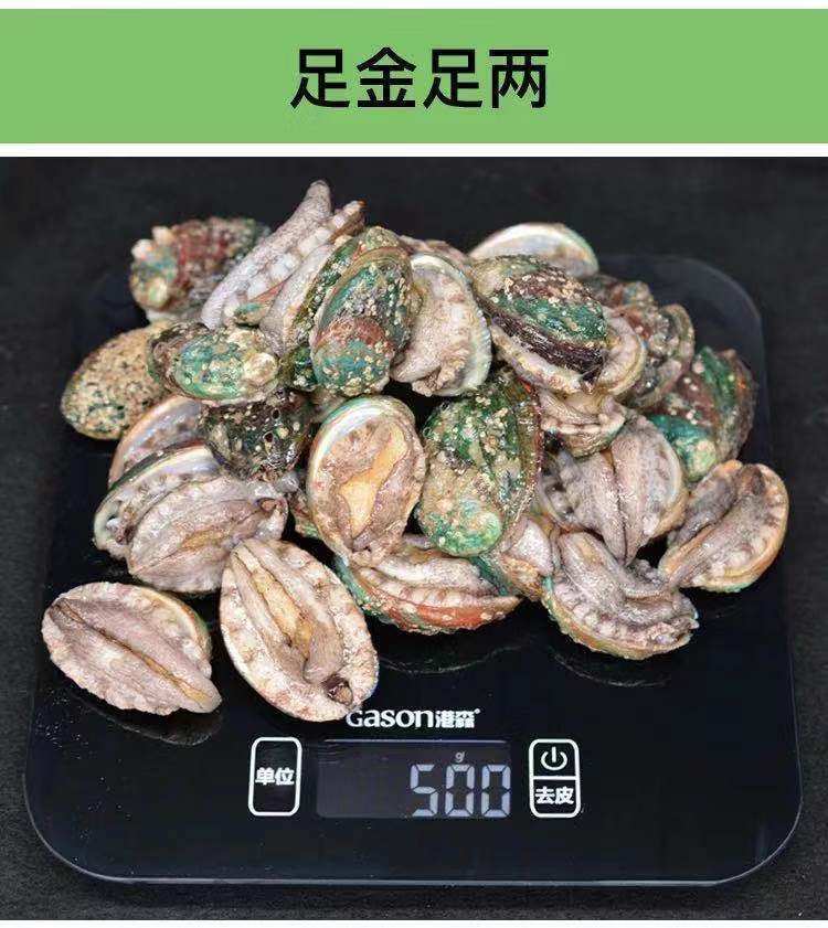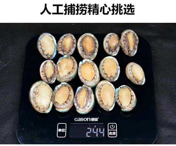 | Packaging specifications | Small abalone starting from 30 pieces, about 30 pieces/jin,Minimum order of 30 medium abalone, about 15 pieces/jin,Large abalone starts from 30 pieces, about 7-8 pieces/jin |