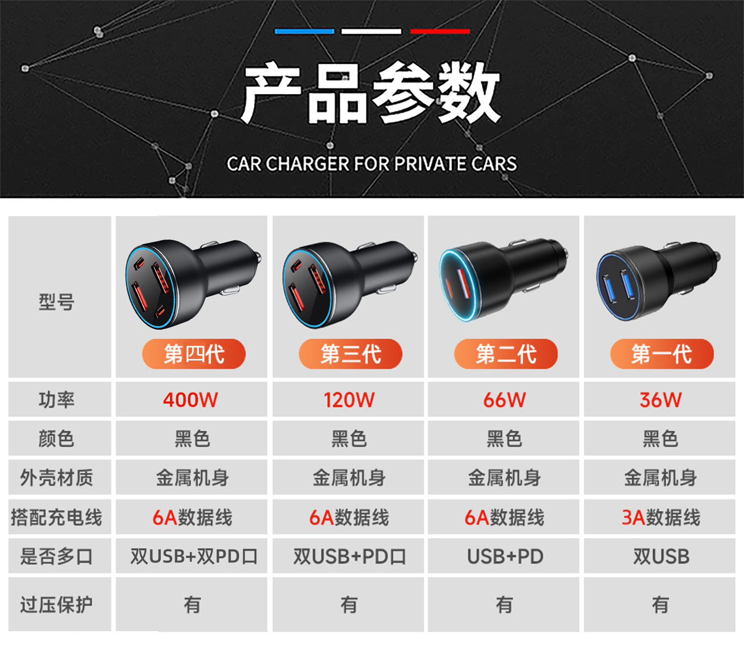 | Model | Volvo-fashionable black [four-port super fast charge model 400w],Volvo-fashionable black [four-port super fast charging model 400w + cable],Volvo-frosted silver [four-port super fast charging model 400w],Volvo-frosted silver [four-port super fast charging model 400w + cable],Volvo-fashionable black [three-port super fast charge model 120w],Volvo-fashionable black [three-child super fast charging model 120w + cable],Volvo-frosted silver [three-port super fast charging model 120w],Volvo-frosted silver [three-port super fast charging model 120w + cable],Volvo-vibrant red [three-port super fast charge model 120w],Volvo-vibrant red [three-port super fast charge model 120w + cable],Volvo-fashionable black [pd+usb super fast charge 66w],Volvo-fashionable black [pd+usb super fast charge 66w+ cable],Volvo-frosted silver [pd+usb super fast charging model 66w],Volvo-frosted silver [pd+usb super fast charging model 66w+ cable],Volvo-vibrant red [pd+usb super fast charge 66w],Volvo-vibrant red [pd+usb super fast charge 66w+ cable],Volvo-frosted silver [dual usb port 36w],Volvo-frosted silver [dual usb port 36w + cable],Volvo-vibrant red [dual usb port 36w],Volvo-vibrant red [dual usb port 36w + cable] |
