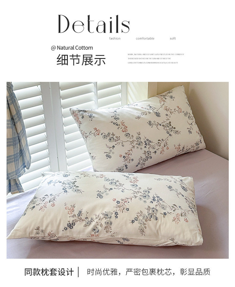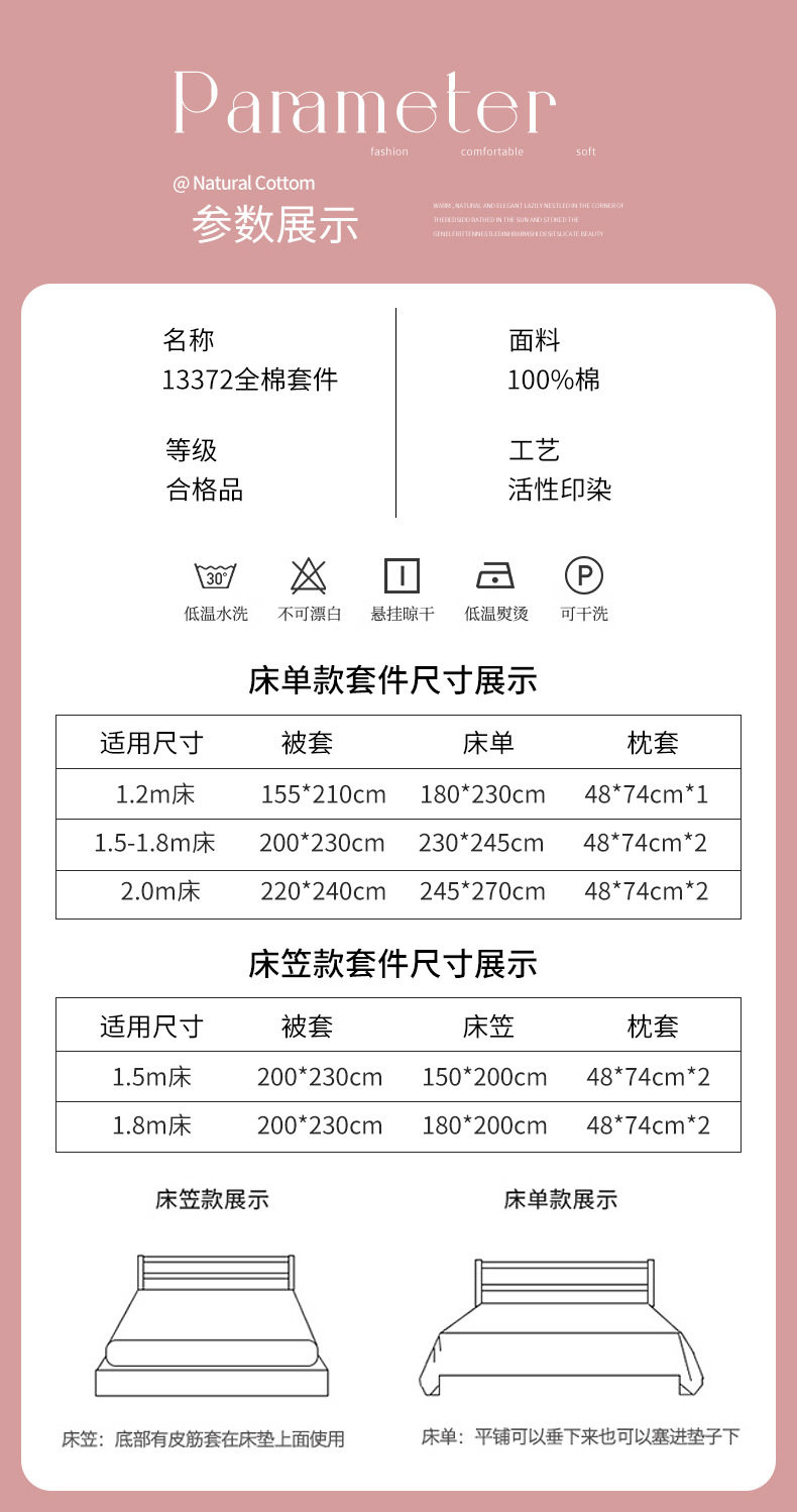 | Dimensions | 1.2m bed sheet three-piece set (quilt cover 155*210, bed sheet 180*230, 1 pillowcase),1.5 and 1.8m bed sheet four-piece set (quilt cover 200*230, bed sheet 230*245, 2 pillowcases),2.0m bed sheet four-piece set (quilt cover 220*240, bed sheet 245*270, 2 pillowcases),1.5m fitted sheet set of four (quilt cover 200*230, fitted sheet 150*200, 2 pillowcases),1.8m fitted sheet set of four (quilt cover 200*230, fitted sheet 180*200, 2 pillowcases),200*230cm (single quilt cover),220x240cm single quilt cover |