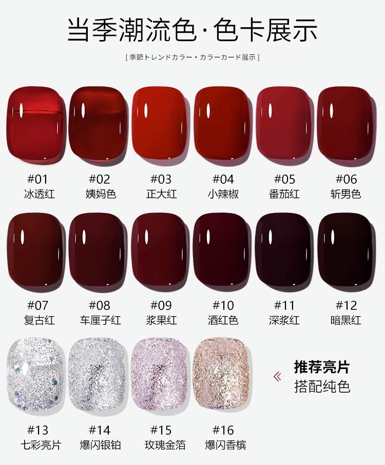 | Color | [New Year Red Series 01] Ice through red,[New Year Red Series 02] Aunt Color,[New Year Red Series 03] Zhengda Red,[New Year Red Series 04] Pepper,[New Year Red Series 05] Tomato Red,[New Year Red Series 06] Cut Male Color,[New Year Red Series 07] Retro Red,[New Year Red Series 08] Cherry Red,[New Year Red Series 09] Berry Red,[New Year Red Series 10] wine red,[New Year Red Series 11] Deep Pulp Red,[New Year Red Series 12] Dark Black Red,[New Year Red Series 13] Colorful Sequins,[New Year Red Series 14] Flash Silver Platinum,[New Year Red Series 15] Rose Gold Foil,[New Year Red Series 16] Flash Champagne,[New Year red series 16 color set of blank color plate]] |