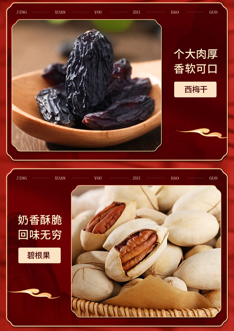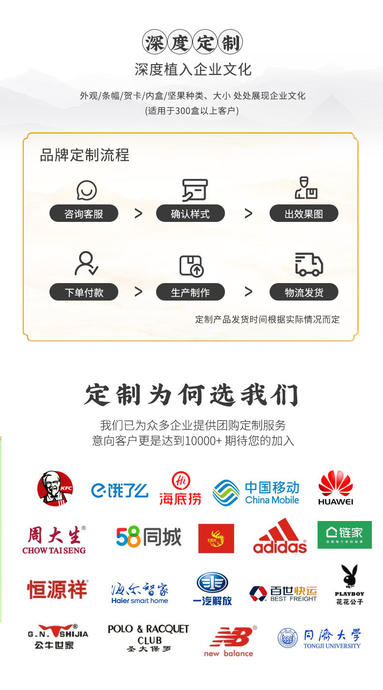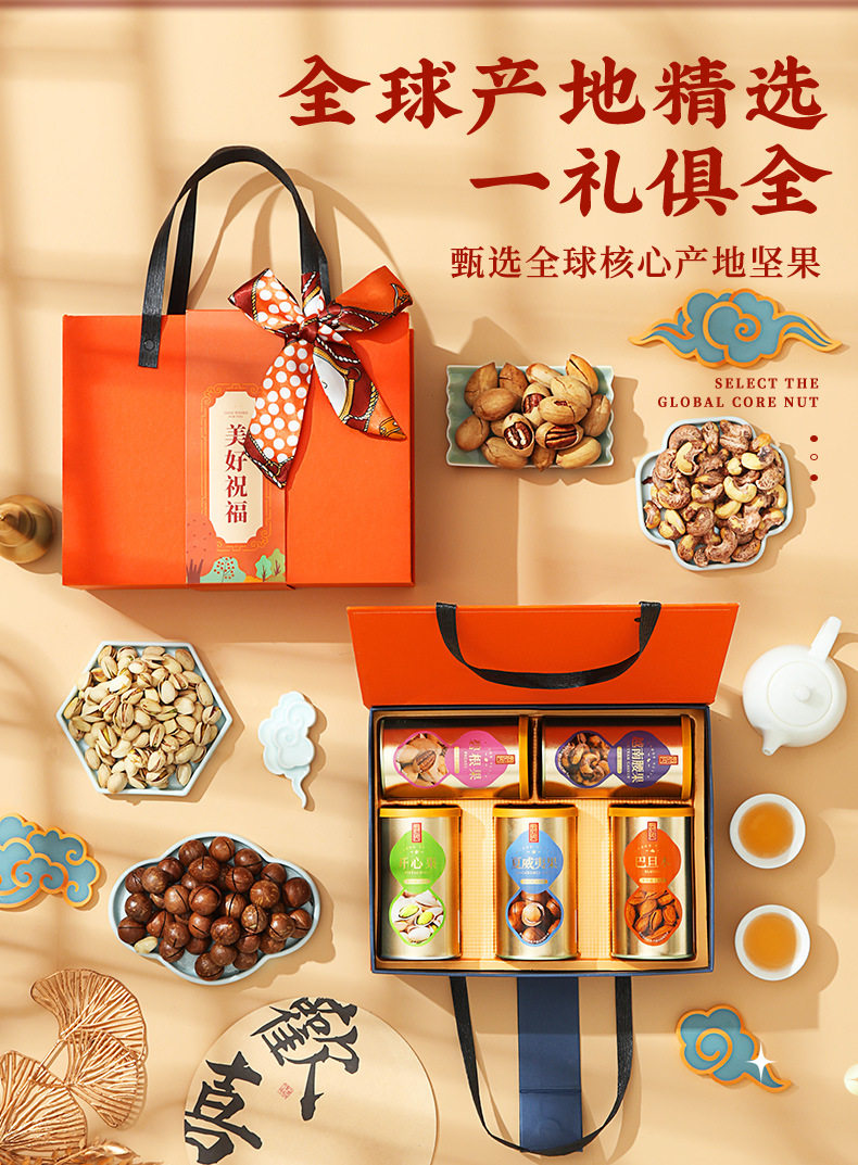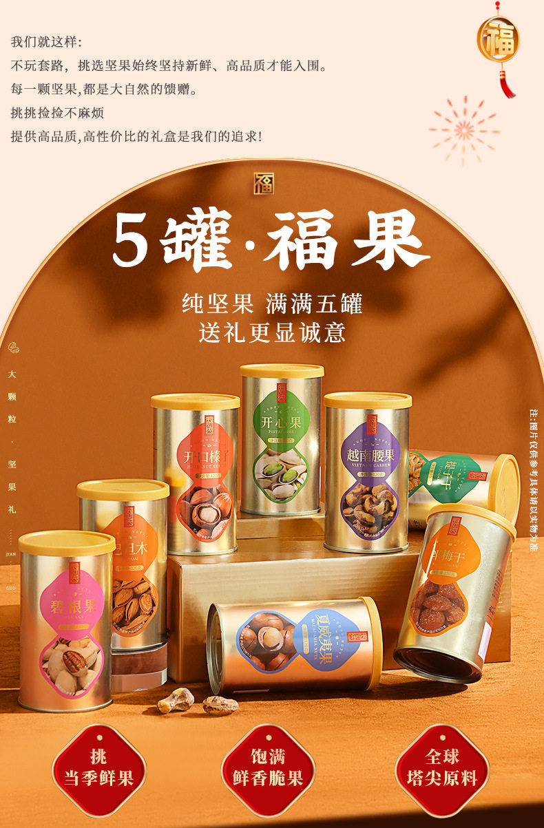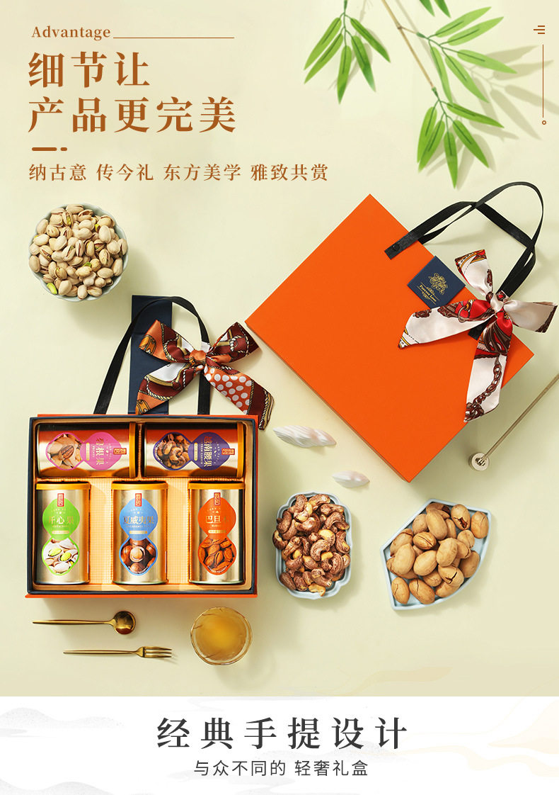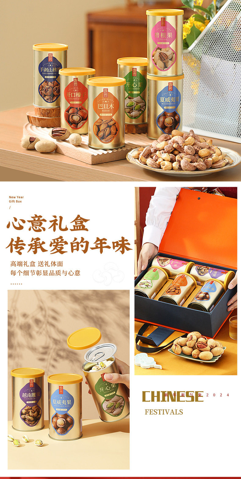 | Packaging specifications | [send a silk scarf] type a: 2 cans of nuts + 3 cans of snacks,[send a silk scarf] type b: 4 cans of nuts + 1 can of snacks,[send a silk scarf] type c: 5 cans of pure nuts,[scheduled delivery, specified date, invoicing],[customized logo printing] [ghostwriting greeting cards],[200 boxes of customized version: 3 cans of nuts + 2 cans of snacks],ălucky fortune packă8-can set: 3 nuts, 5 snacks,ăspring breeze editionă8-pack: 4 nuts, 4 snacks,ăauspicious clouds gift setă8-pack: 4 nuts, 4 snacks,ăgood fortune gift setă8-pack: 5 nuts, 3 snacks |