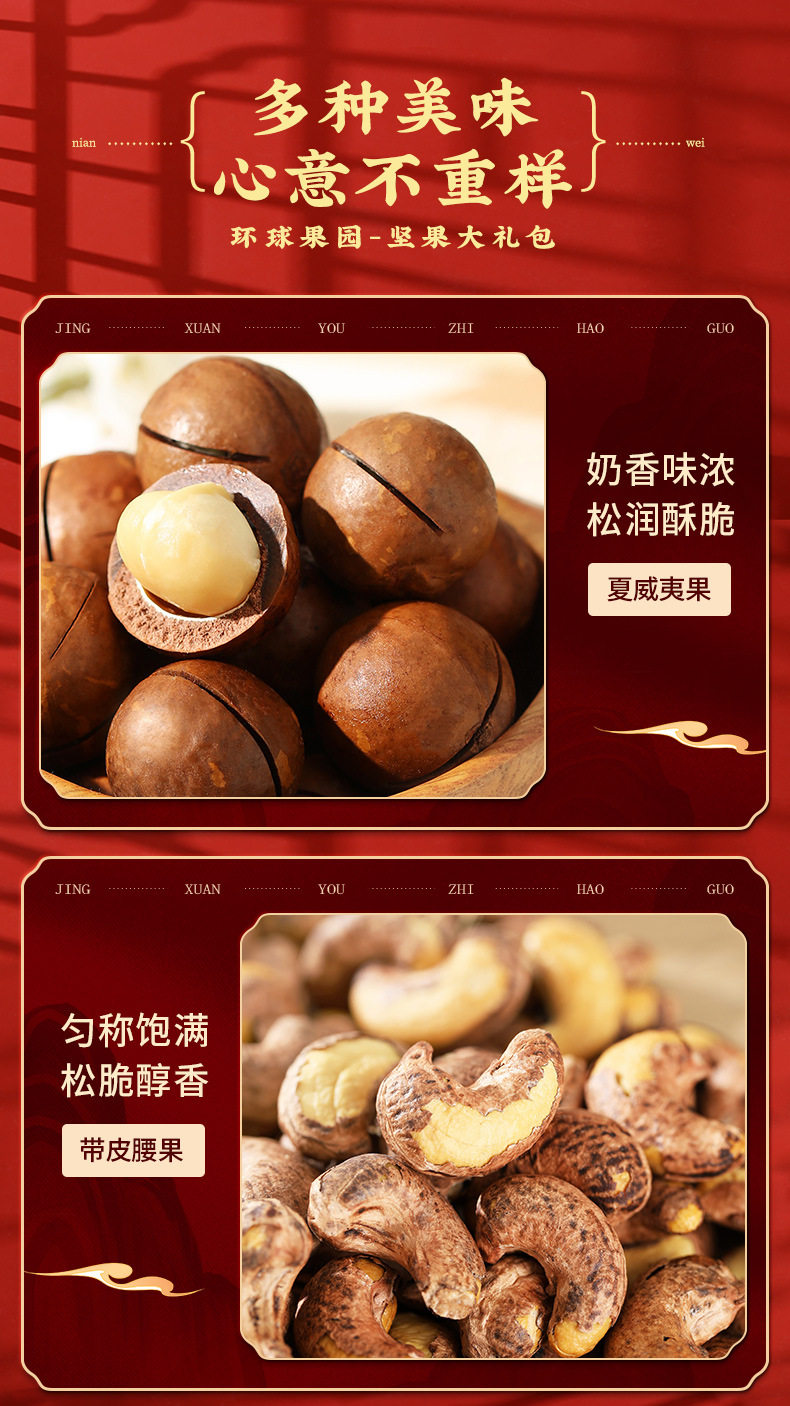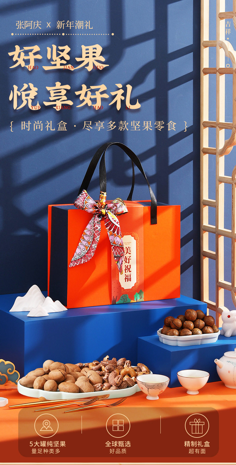 | Gift box type | New year's gift box, spring festival gift set, mixed nuts gift basket for relatives, spring festival gift, group buying discounts |