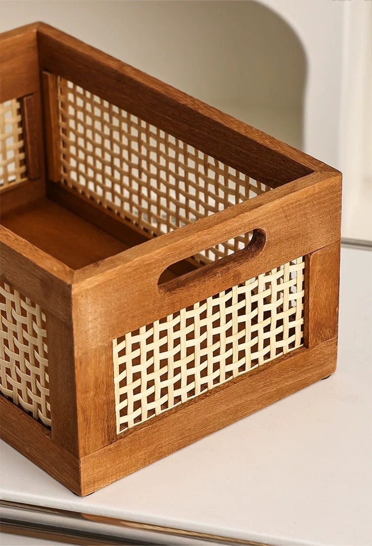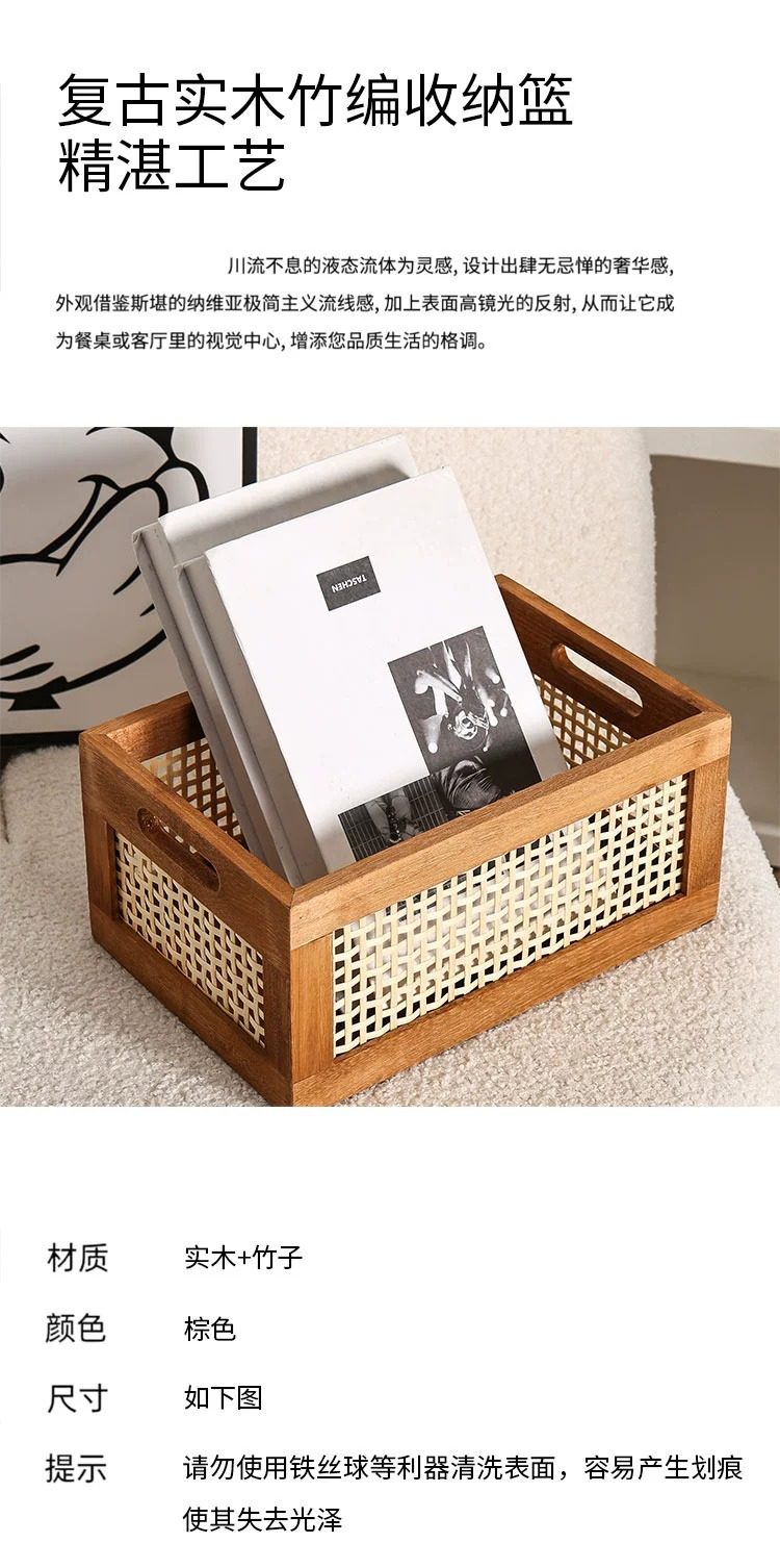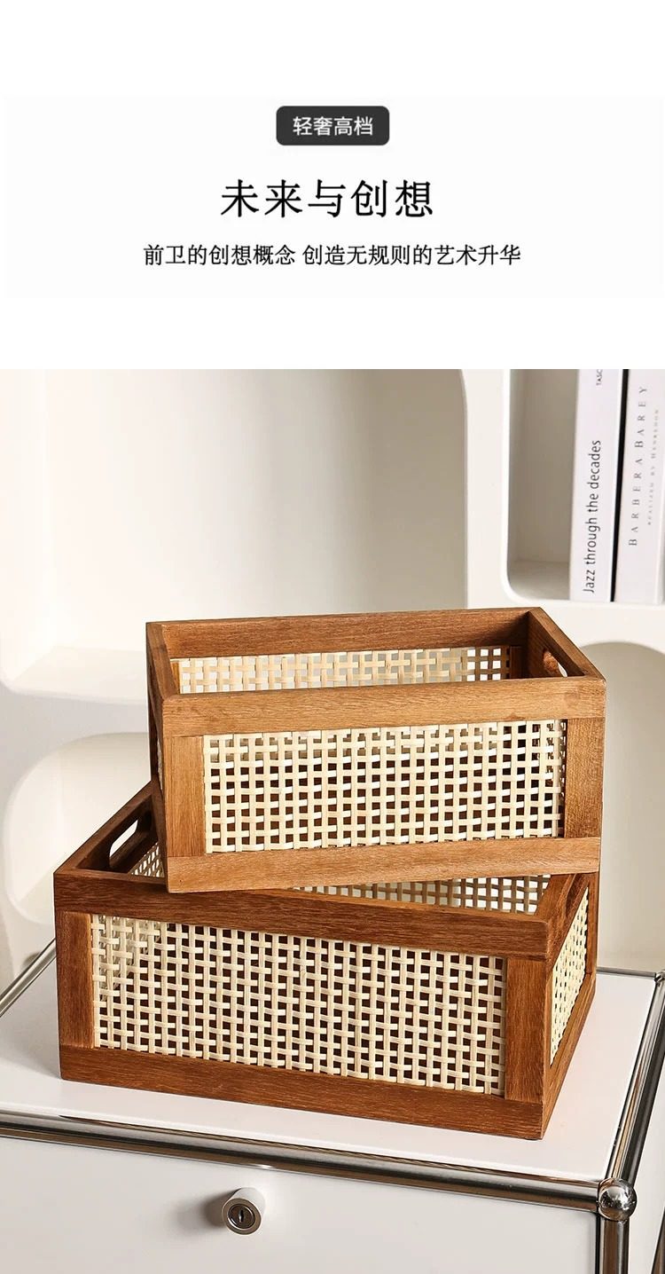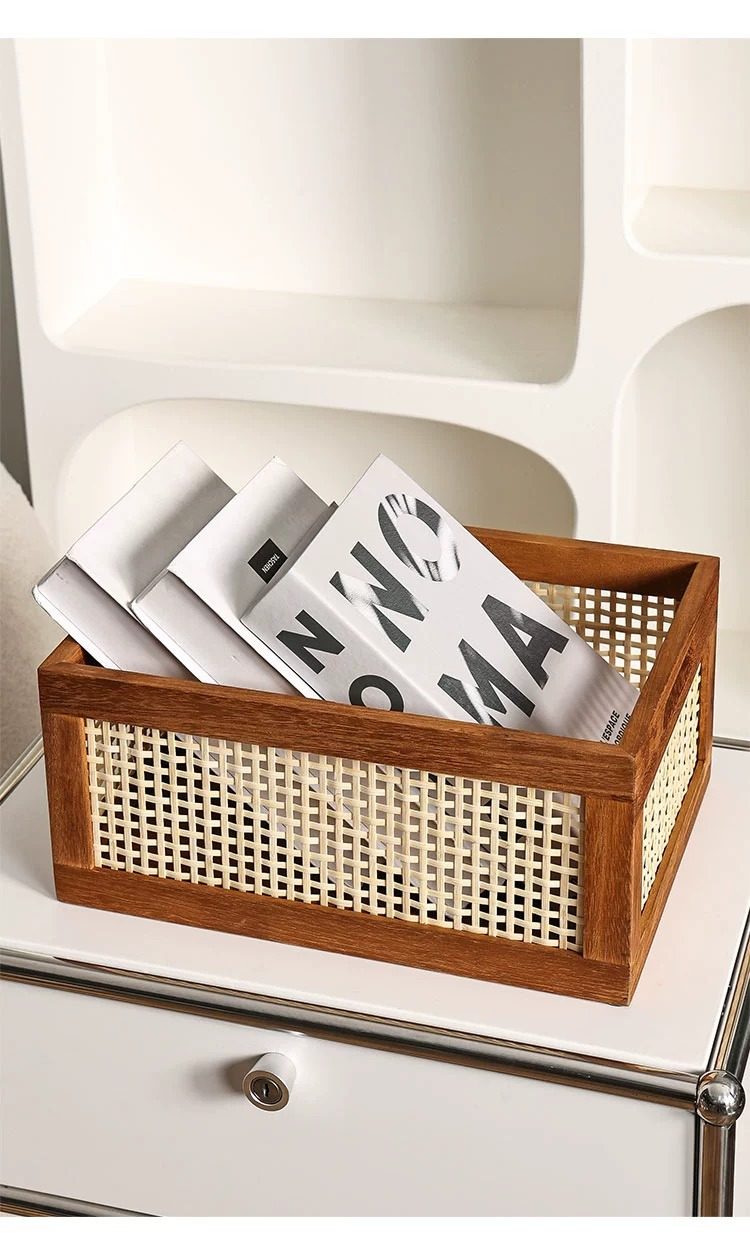 Retro hollow rattan storage basket wooden rectangular storage box Japanese style living room toy book storage basket in stock