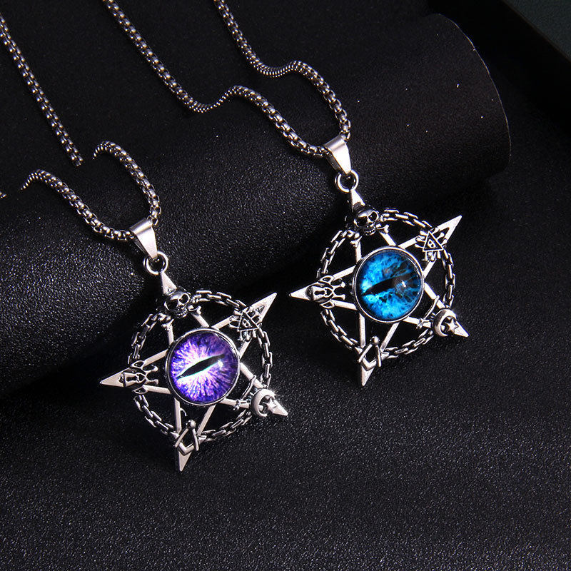 Hip hop retro style old five-pointed star Turkish blue eyes Devil's Eye necklace punk magic skull pendant
