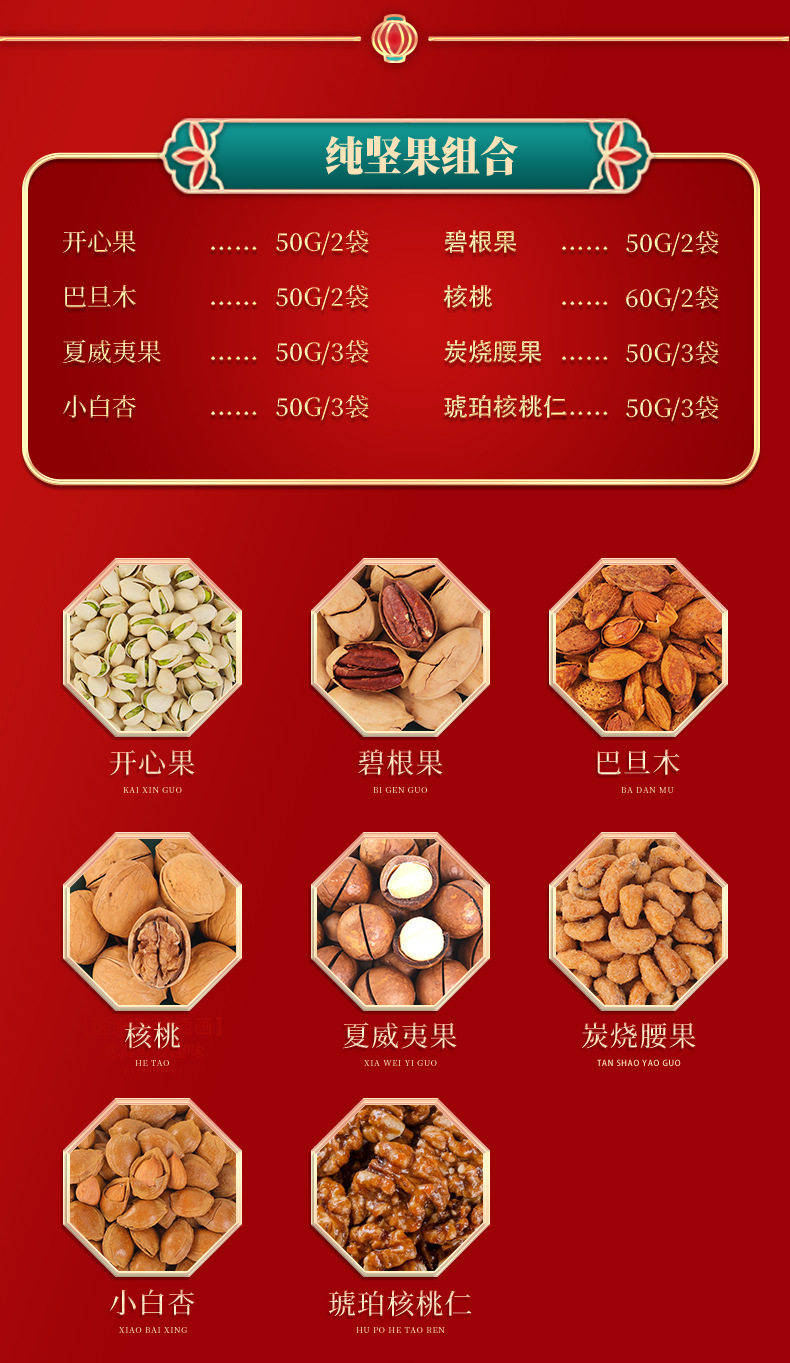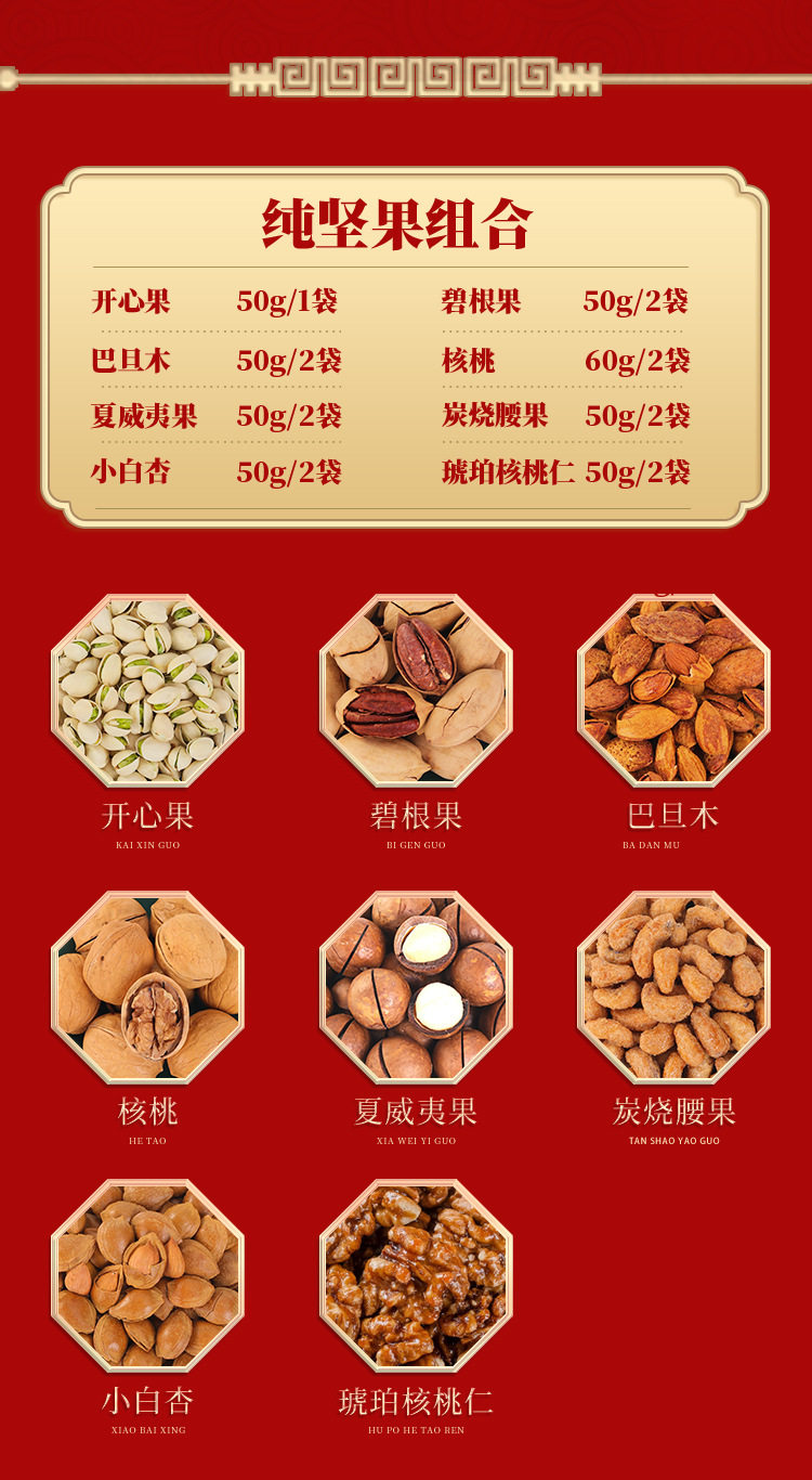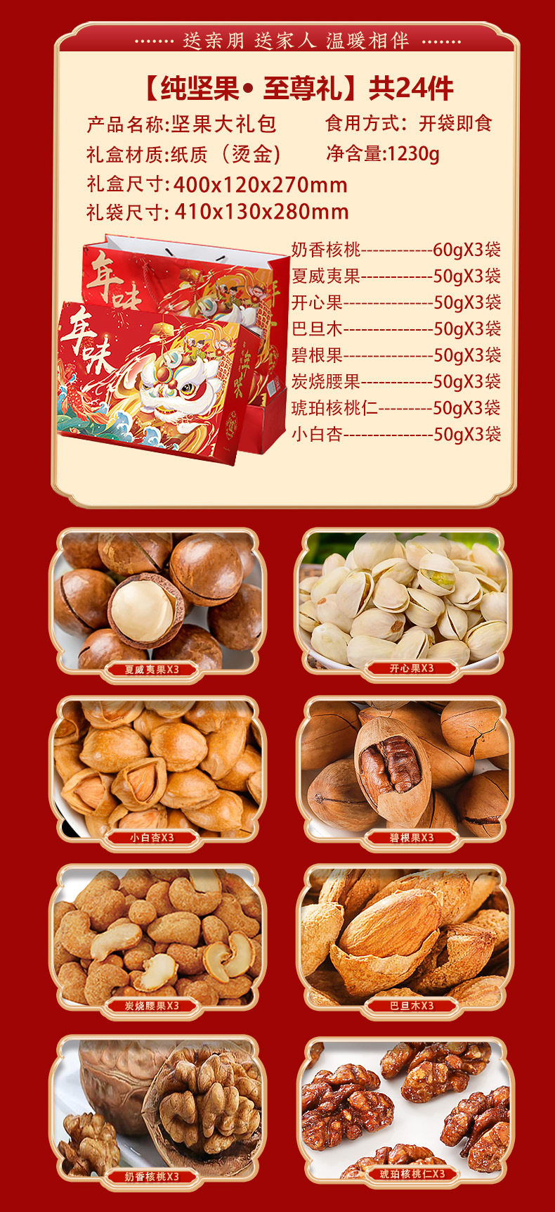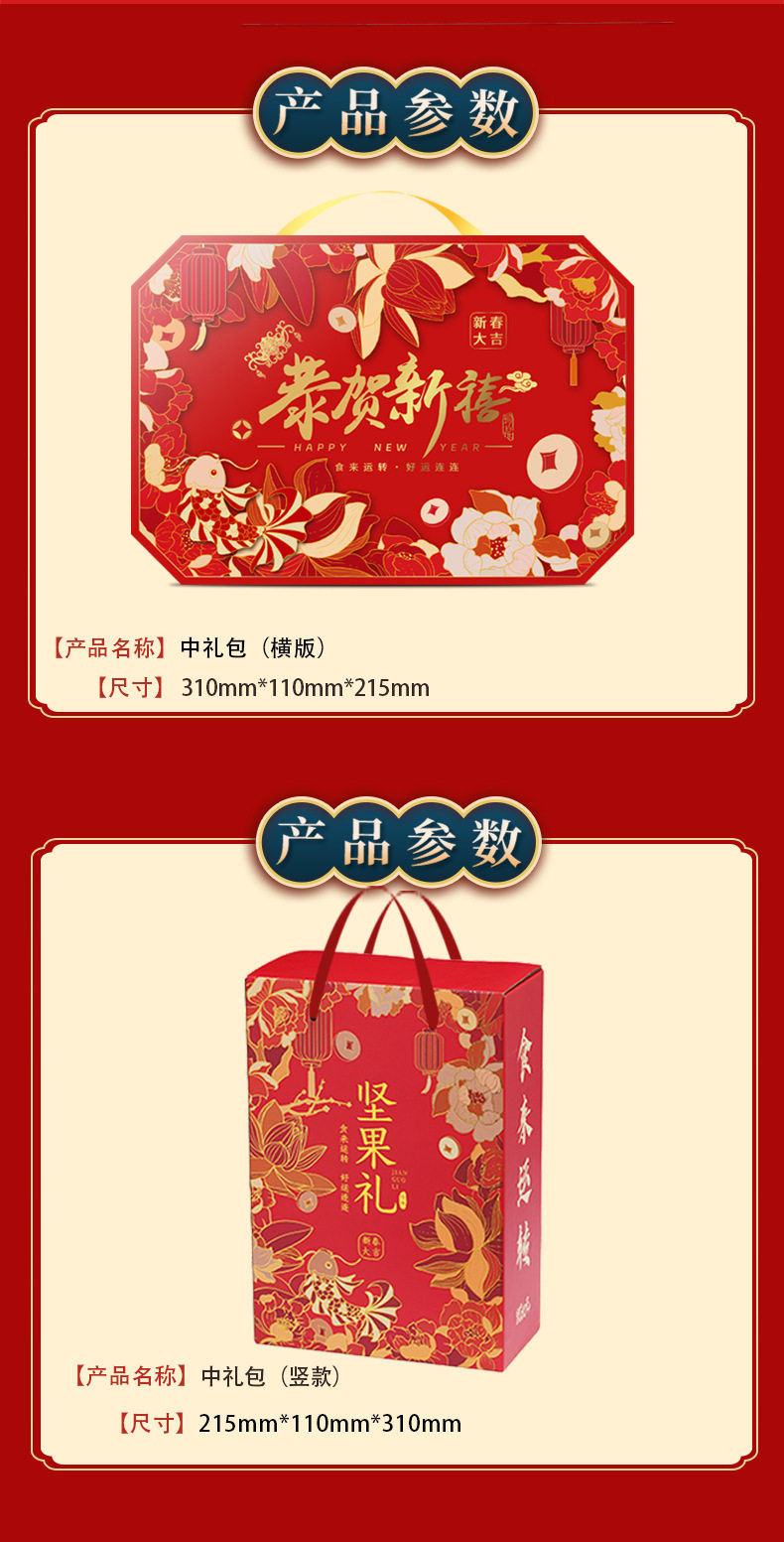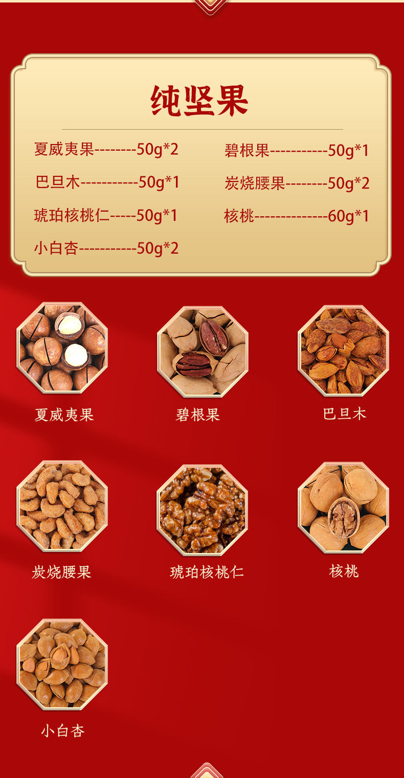 | Packaging specifications | Long new year's gift set with gift bag, 18 flavors, 18 packs (net weight 735g),Congratulations on the new year 12 flavors 12 packs (net content 505g),Vertical version nut gift 12 flavors 12 packs (net content 505g),Eight-angle nuts gift 15-piece gift box, 15 flavors, 15 packs (net content 630g),Nut gift pack 15 flavors 15 packs (net content 630g),New year's flavor gift pack 15 flavors 15 packs (net content 630g),Group purchase: 7-flavor nut mix, 10 packs (net weight 510g),Silk scarf money tree 18 flavors 18 packs (net content 735g),Hand-woven bamboo basket 20 flavors 20 packs (net content 835g),Octagonal gift box pure nuts 8 flavors 15 packs (net content 770g),Long new year pure nuts with gift bag, 8 flavors, 20 packs (net content 1020g),New year flavor pure nuts with gift bag, 8 flavors, 24 packs (net content 1230g),Year of the horse collection extra large gift box 14 packs (net content 3416g),You can customize your own gift box starting from 300 boxes (consult customer service to place an order) |