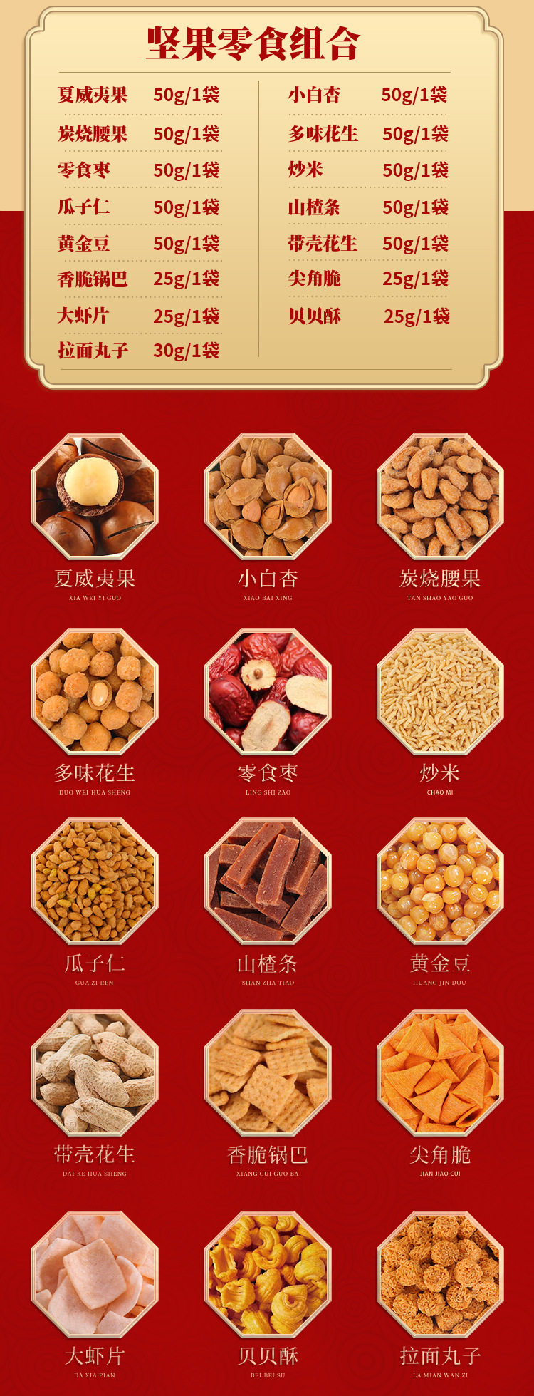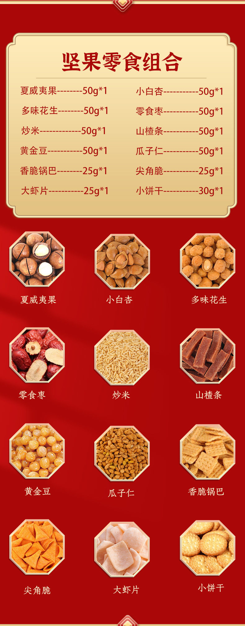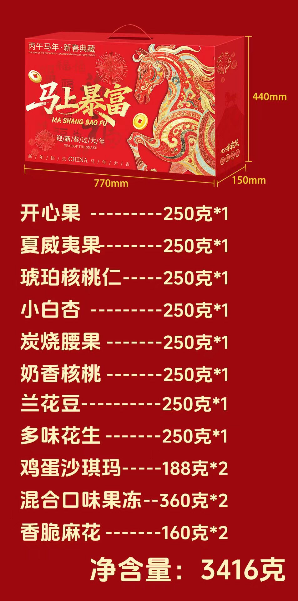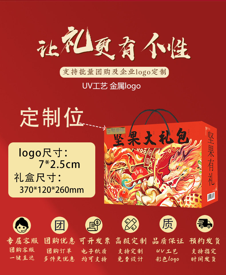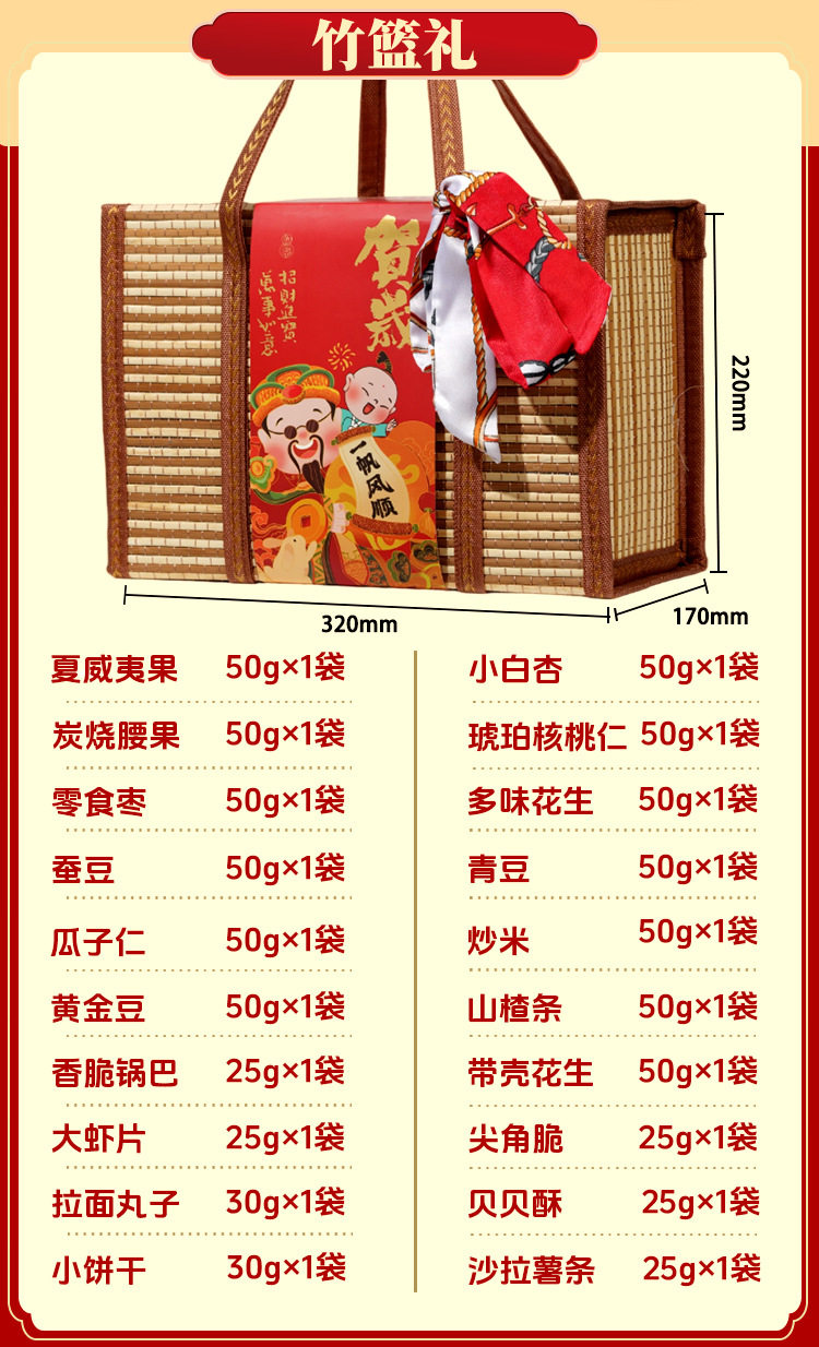| Packaging specifications | Long new year's gift set with gift bag, 18 flavors, 18 packs (net weight 735g),Congratulations on the new year 12 flavors 12 packs (net content 505g),Vertical version nut gift 12 flavors 12 packs (net content 505g),Eight-angle nuts gift 15-piece gift box, 15 flavors, 15 packs (net content 630g),Nut gift pack 15 flavors 15 packs (net content 630g),New year's flavor gift pack 15 flavors 15 packs (net content 630g),Group purchase: 7-flavor nut mix, 10 packs (net weight 510g),Silk scarf money tree 18 flavors 18 packs (net content 735g),Hand-woven bamboo basket 20 flavors 20 packs (net content 835g),Octagonal gift box pure nuts 8 flavors 15 packs (net content 770g),Long new year pure nuts with gift bag, 8 flavors, 20 packs (net content 1020g),New year flavor pure nuts with gift bag, 8 flavors, 24 packs (net content 1230g),Year of the horse collection extra large gift box 14 packs (net content 3416g),You can customize your own gift box starting from 300 boxes (consult customer service to place an order) |