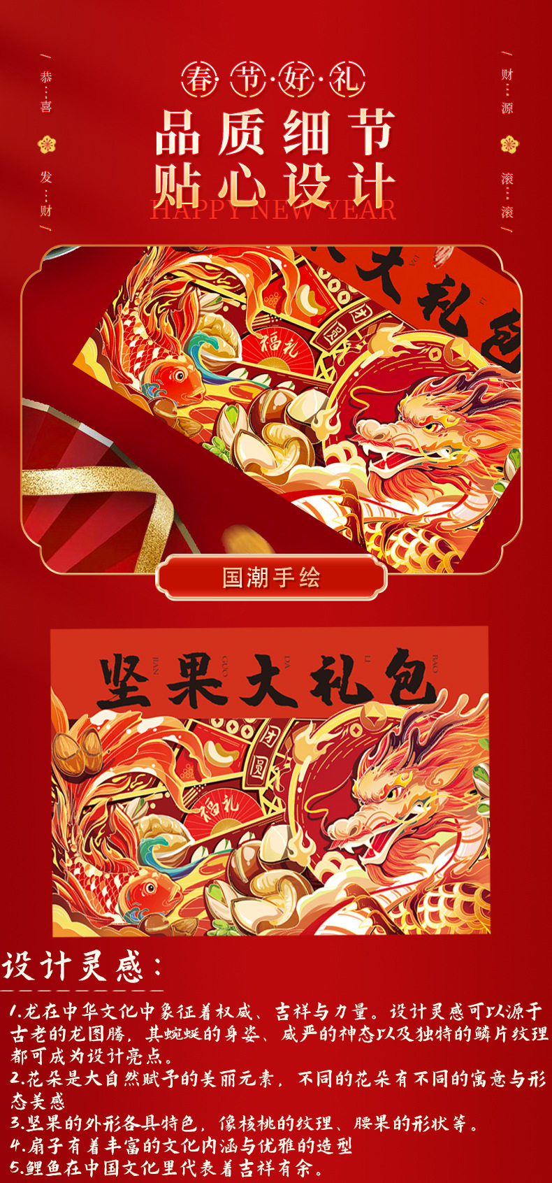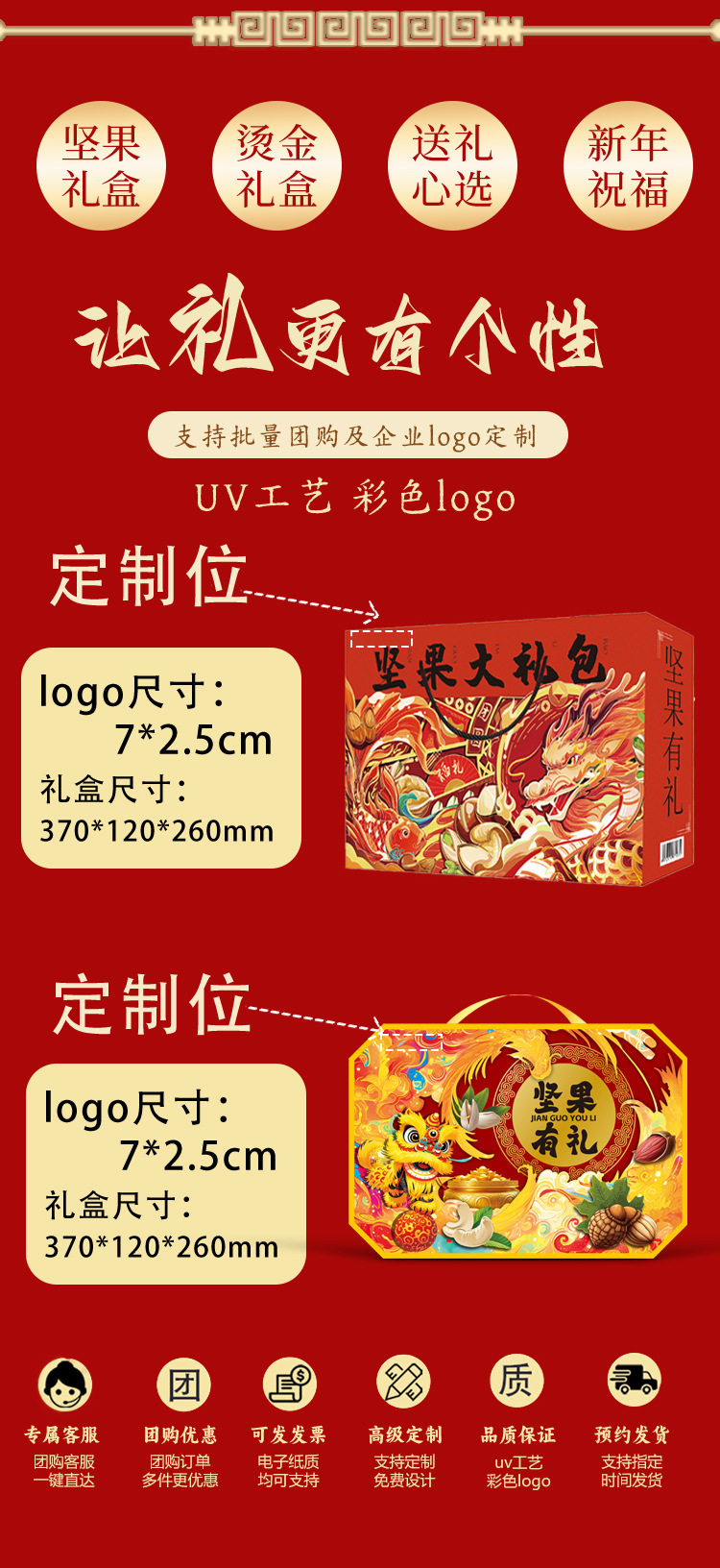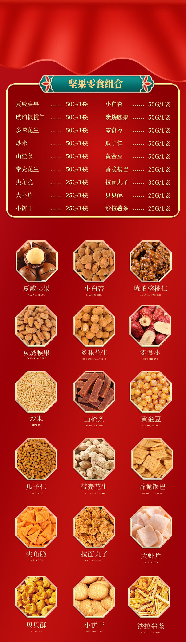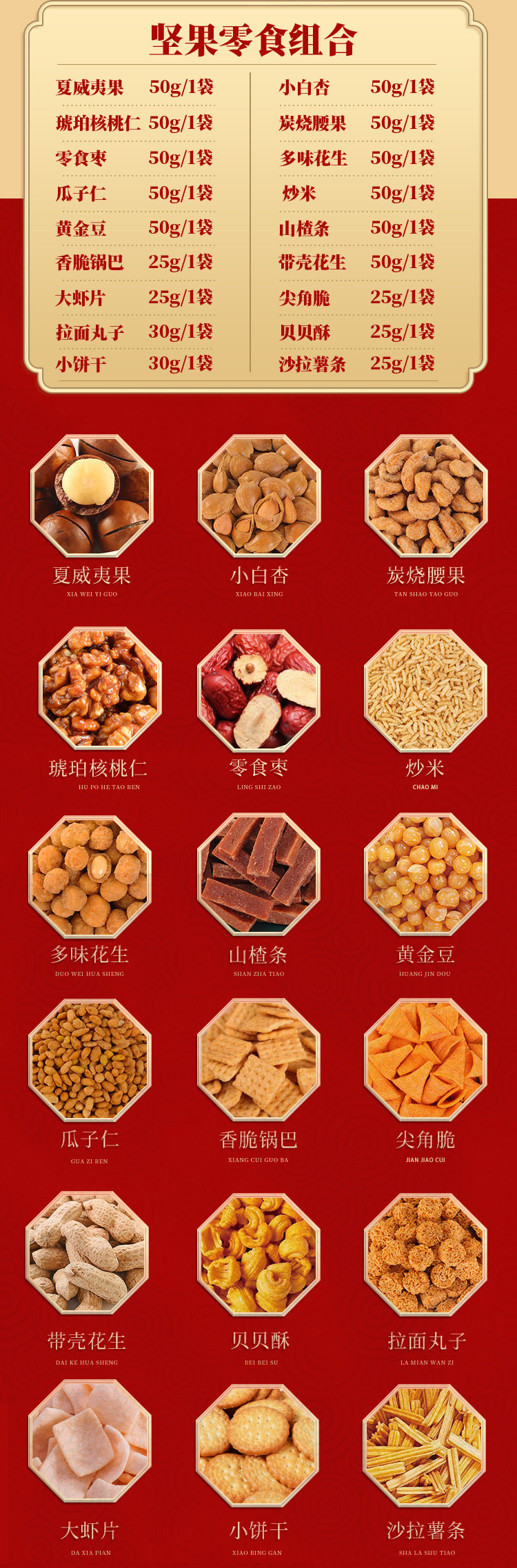| Packaging specifications | Long new year's gift set with gift bag, 18 flavors, 18 packs (net weight 735g),Congratulations on the new year 12 flavors 12 packs (net content 505g),Vertical version nut gift 12 flavors 12 packs (net content 505g),Eight-angle nuts gift 15-piece gift box, 15 flavors, 15 packs (net content 630g),Nut gift pack 15 flavors 15 packs (net content 630g),New year's flavor gift pack 15 flavors 15 packs (net content 630g),Group purchase: 7-flavor nut mix, 10 packs (net weight 510g),Silk scarf money tree 18 flavors 18 packs (net content 735g),Hand-woven bamboo basket 20 flavors 20 packs (net content 835g),Octagonal gift box pure nuts 8 flavors 15 packs (net content 770g),Long new year pure nuts with gift bag, 8 flavors, 20 packs (net content 1020g),New year flavor pure nuts with gift bag, 8 flavors, 24 packs (net content 1230g),Year of the horse collection extra large gift box 14 packs (net content 3416g),You can customize your own gift box starting from 300 boxes (consult customer service to place an order) |