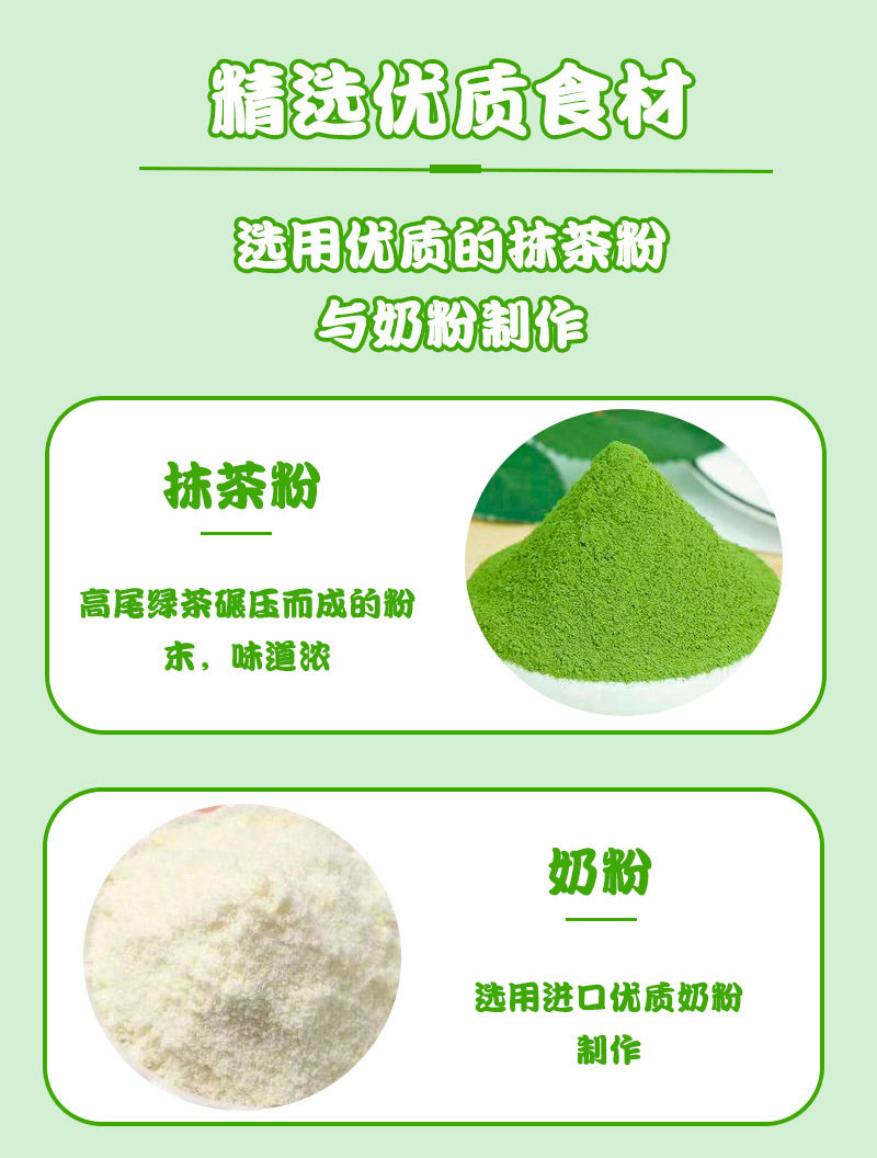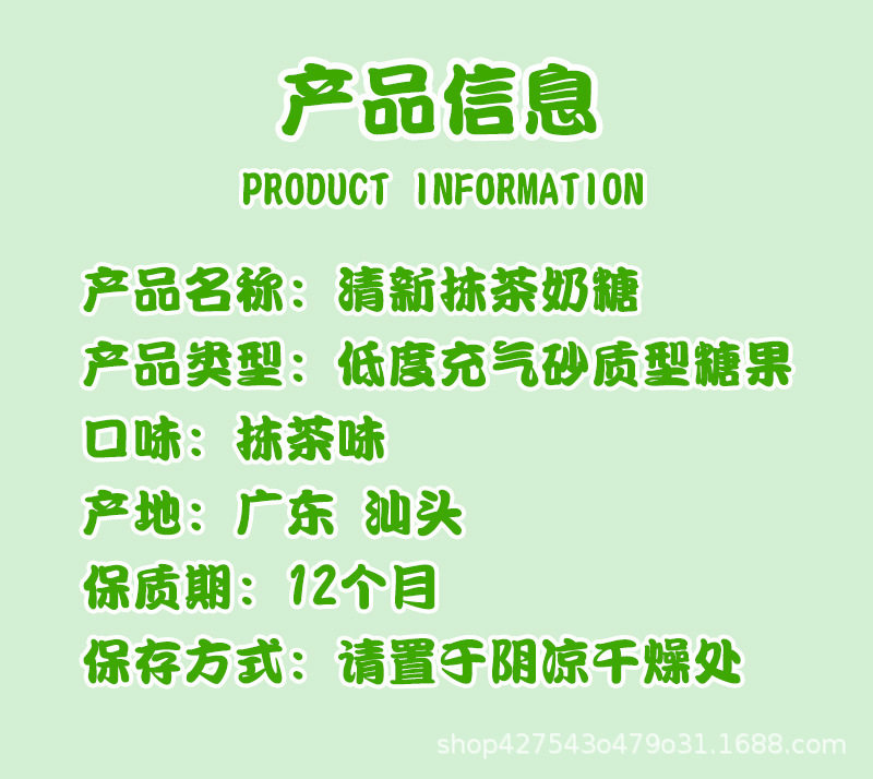 | Packaging specifications | Matcha milk candy 500g about 138 tablets |
