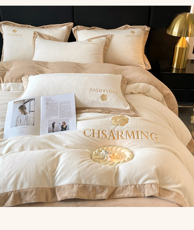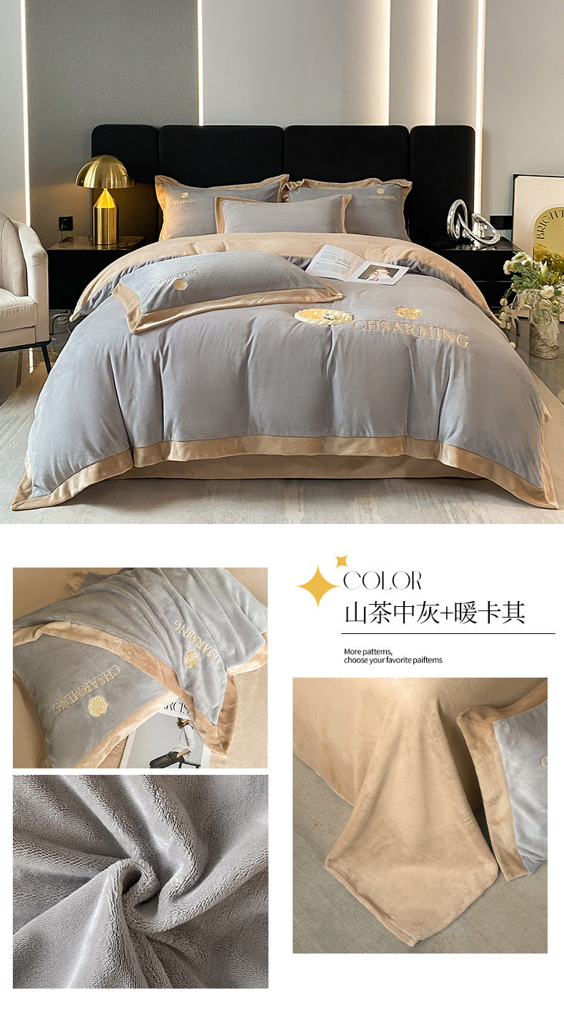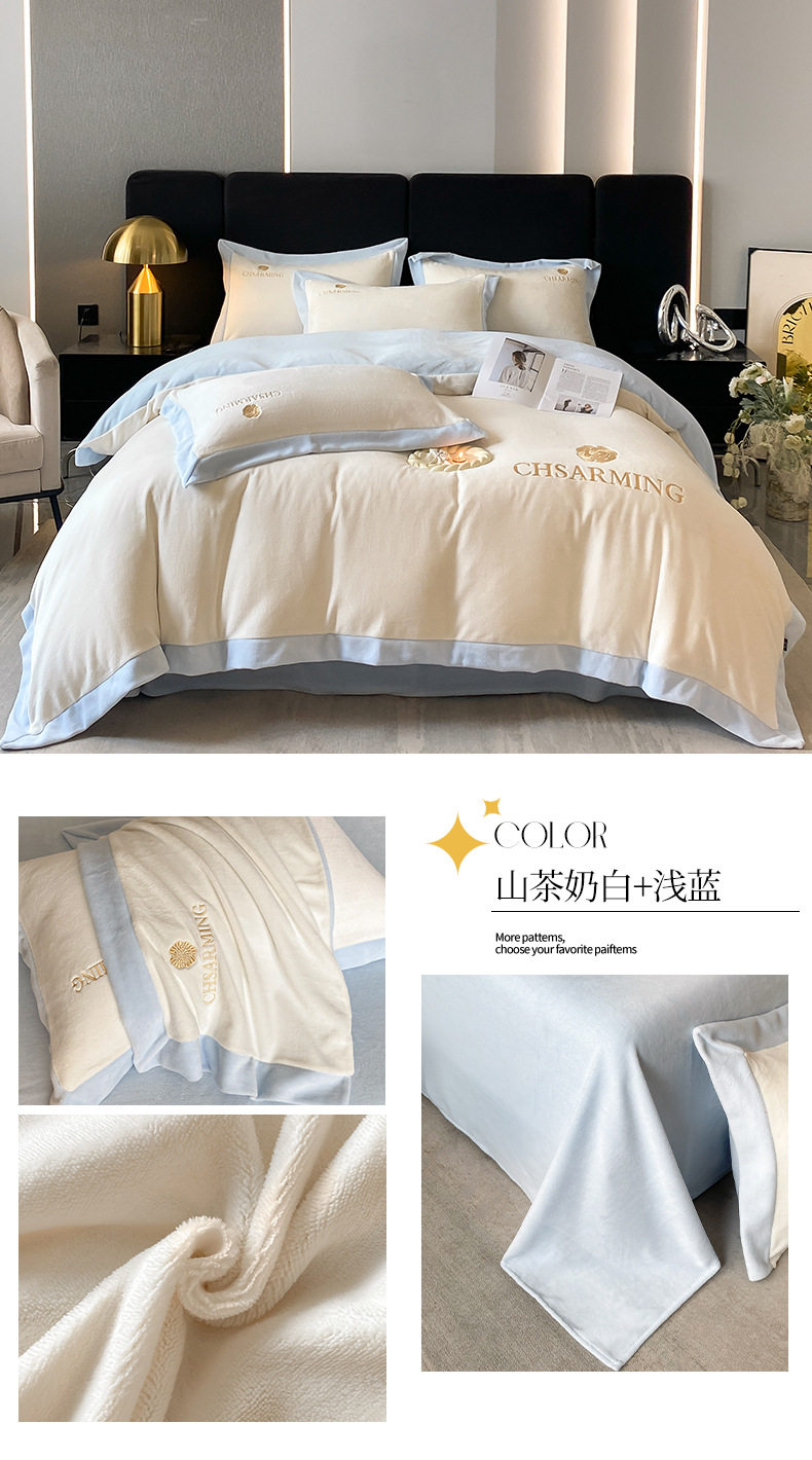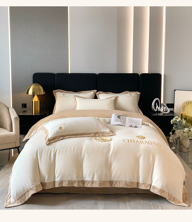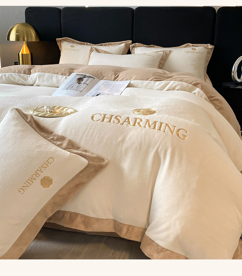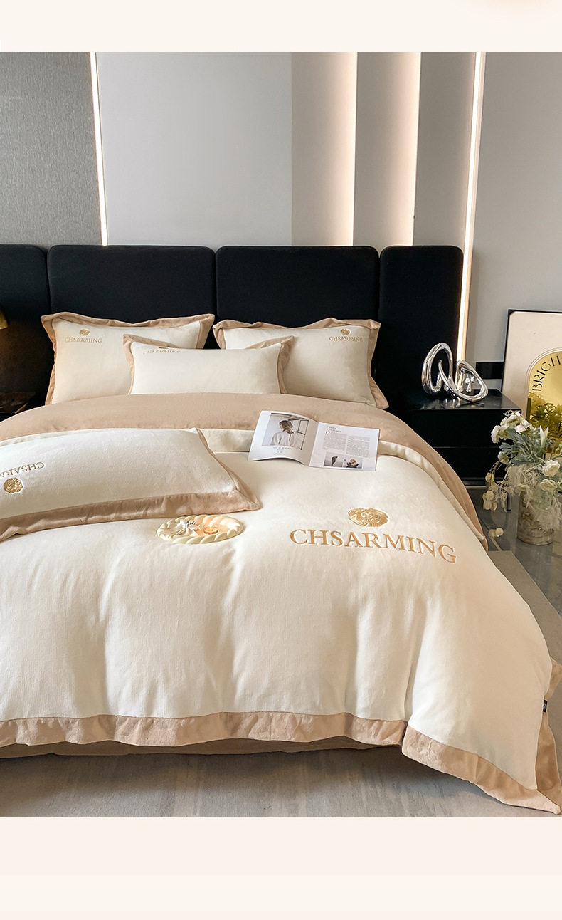 Light luxury style embroidered milk velvet bed four-piece set Winter thickened coral velvet flannel bed sheet quilt cover three-piece set